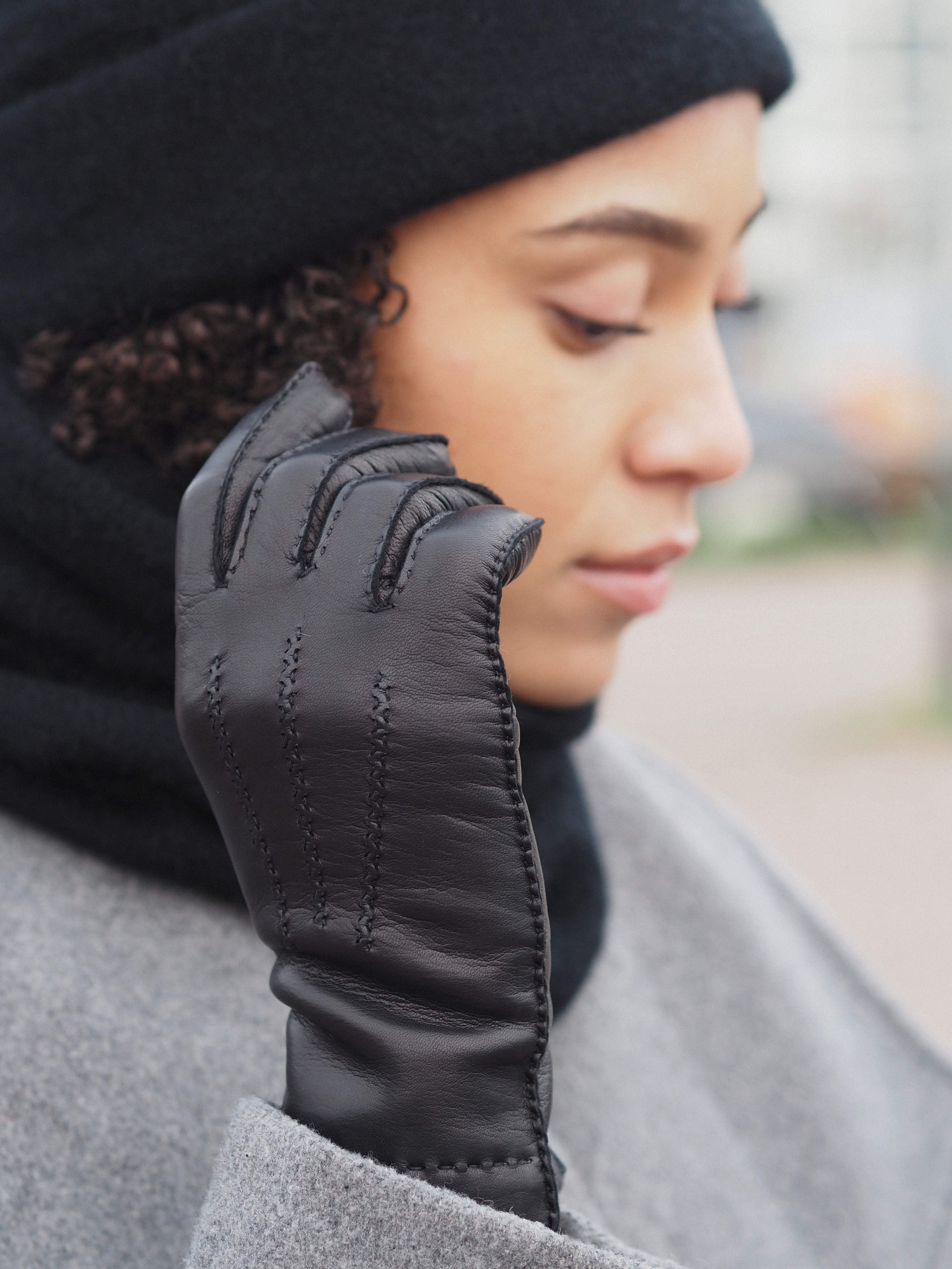 Beeindruckende schwarze Damenhandschuhe aus handgenähtem Leder mit Kaschmirwollfutter.