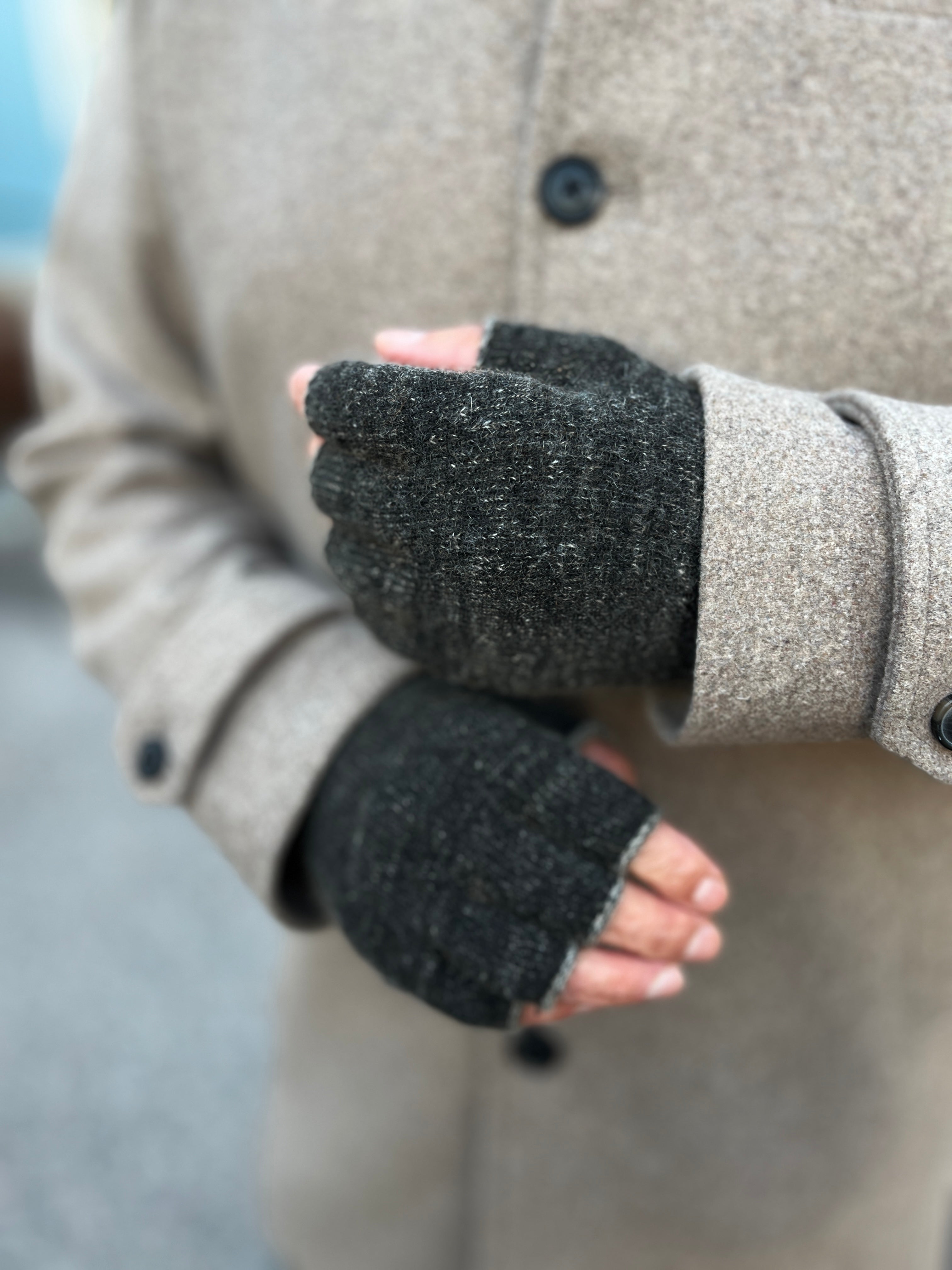 • Schwarze Fäustlinge/Handwärmer, gestrickt aus strapazierfähigem und warmem Merino-Fuchs-Fell.