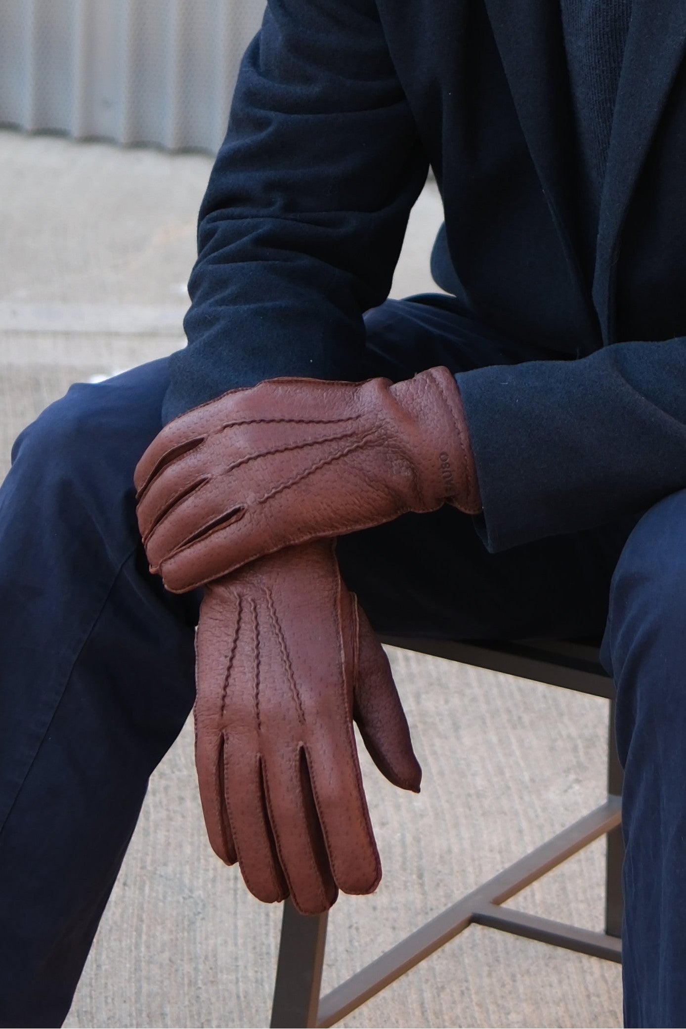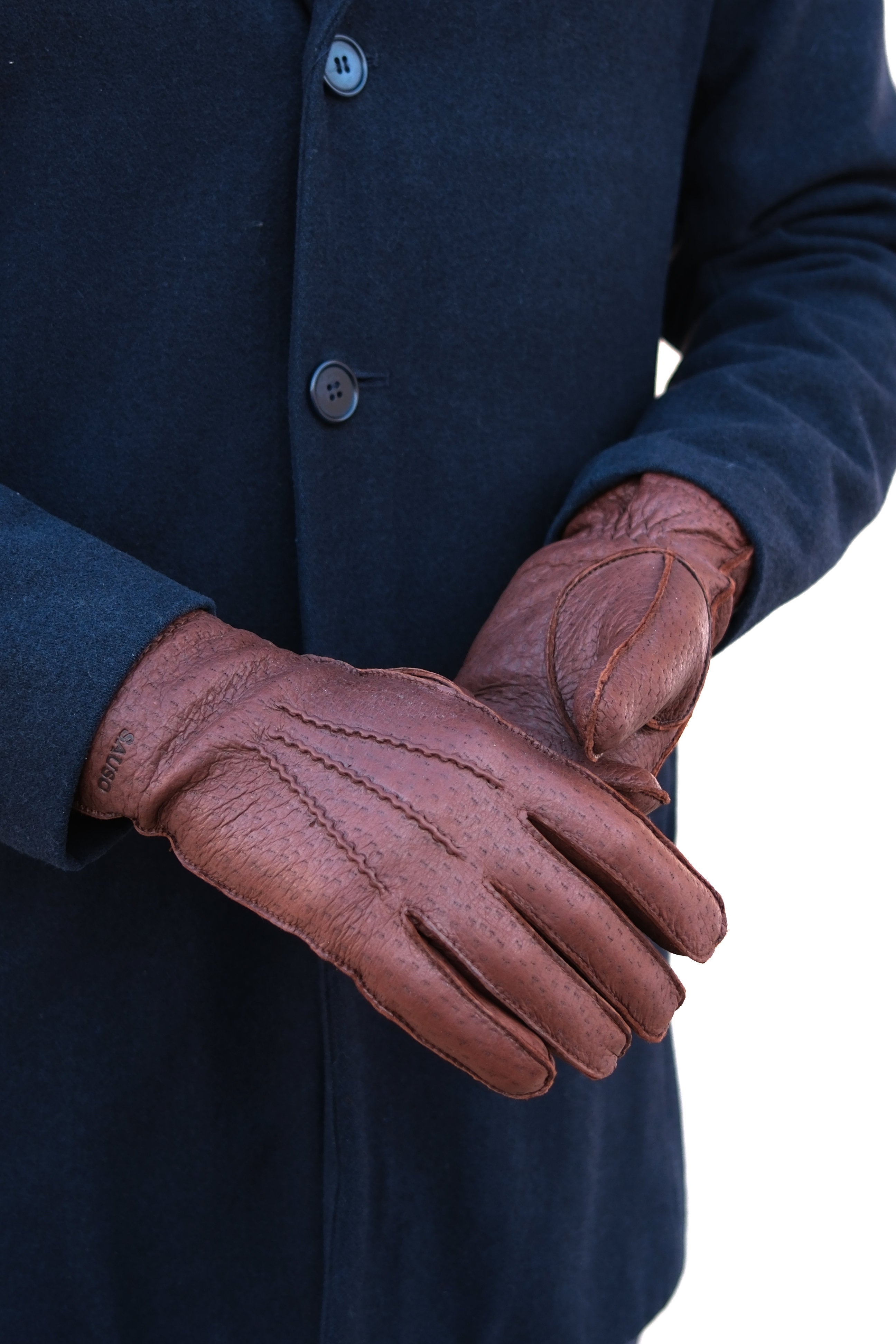 Pekari-Handschuhe. Braune Pekari-Handschuhe für Herren halten Ihre Hände auch bei kaltem Winterwetter warm. Dieser klassische, handgefertigte Handschuh ist die Krönung der Lederverarbeitung.