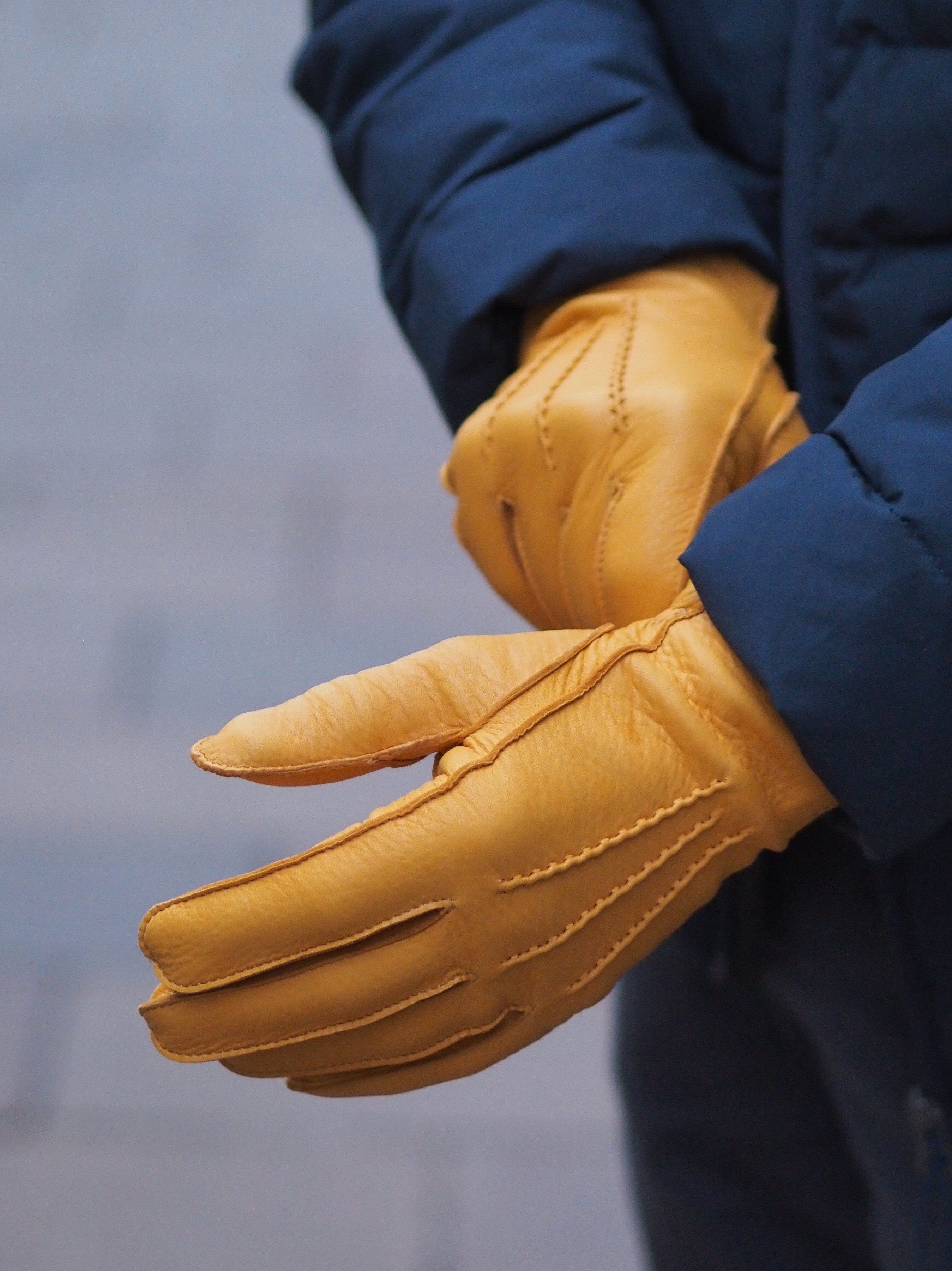 Das Hirschleder, das sich perfekt für Handschuhe eignet, ist weich, dünn und abriebfest. Der Handschuh hat ein Futter aus einer Wolle-Kaschmir-Mischung. Die strapazierfähige und wärmende Wolle kombiniert mit dem weichen Kaschmir bildet ein angenehmes Futter auf der Haut. Auf dem Handrücken befinden sich drei dekorative Nähte. Am Handgelenk befindet sich ein elastisches Band für eine bessere Passform. Die Armlänge beträgt ca. 5 cm, was bedeutet, dass es das Handgelenk bedeckt. Um eine perfekte Passform zu gewährleisten, werden die Handschuhe nach der jahrhundertealten Tischzuschnitt-Methode gefertigt. Bei dieser Methode wird überschüssige Dehnung manuell aus dem Leder gezogen, lässt aber dennoch Raum, sich der Hand des Trägers anzupassen. Das bedeutet auch, dass sich der Handschuh selbst nach langer Nutzung nicht dehnt.