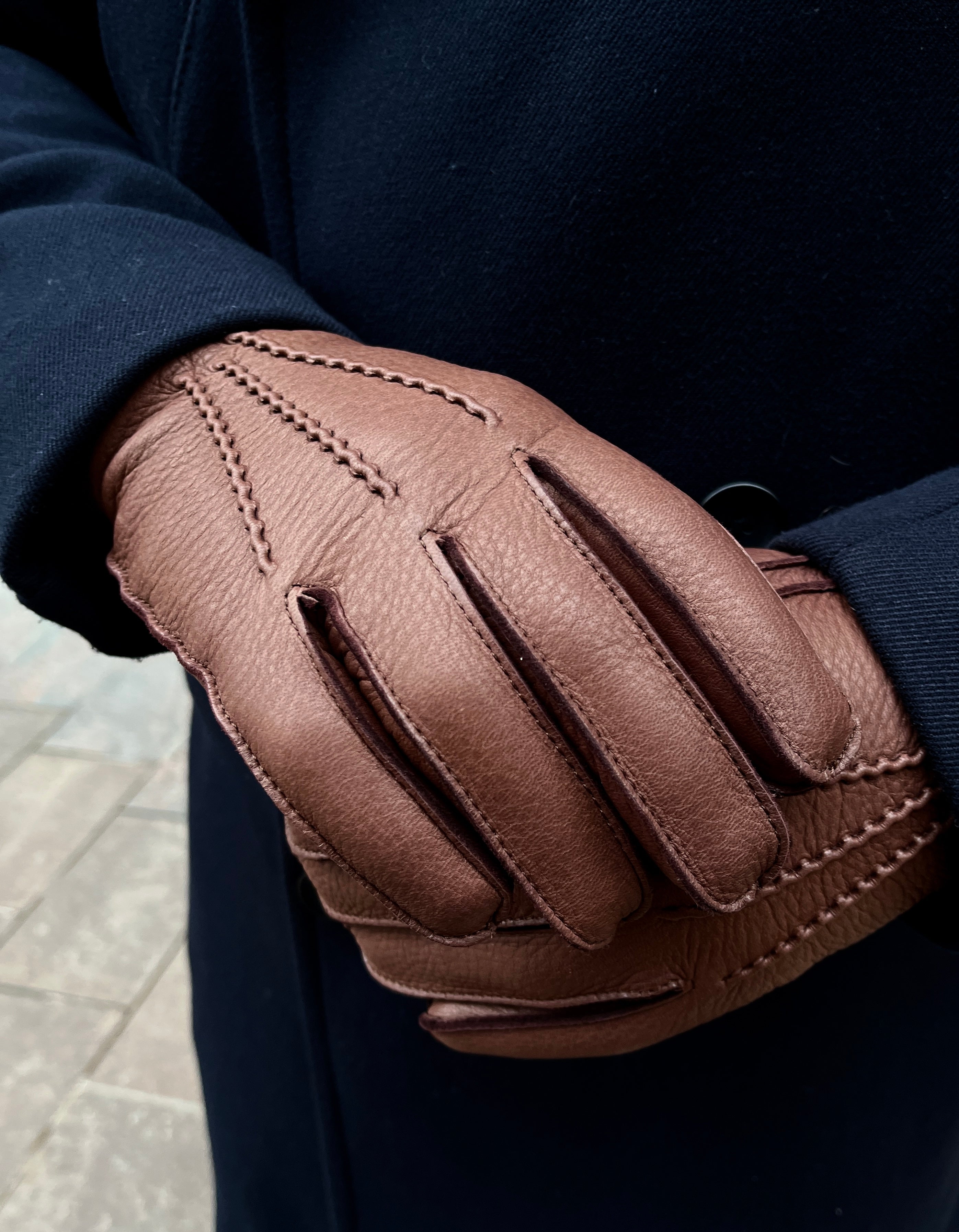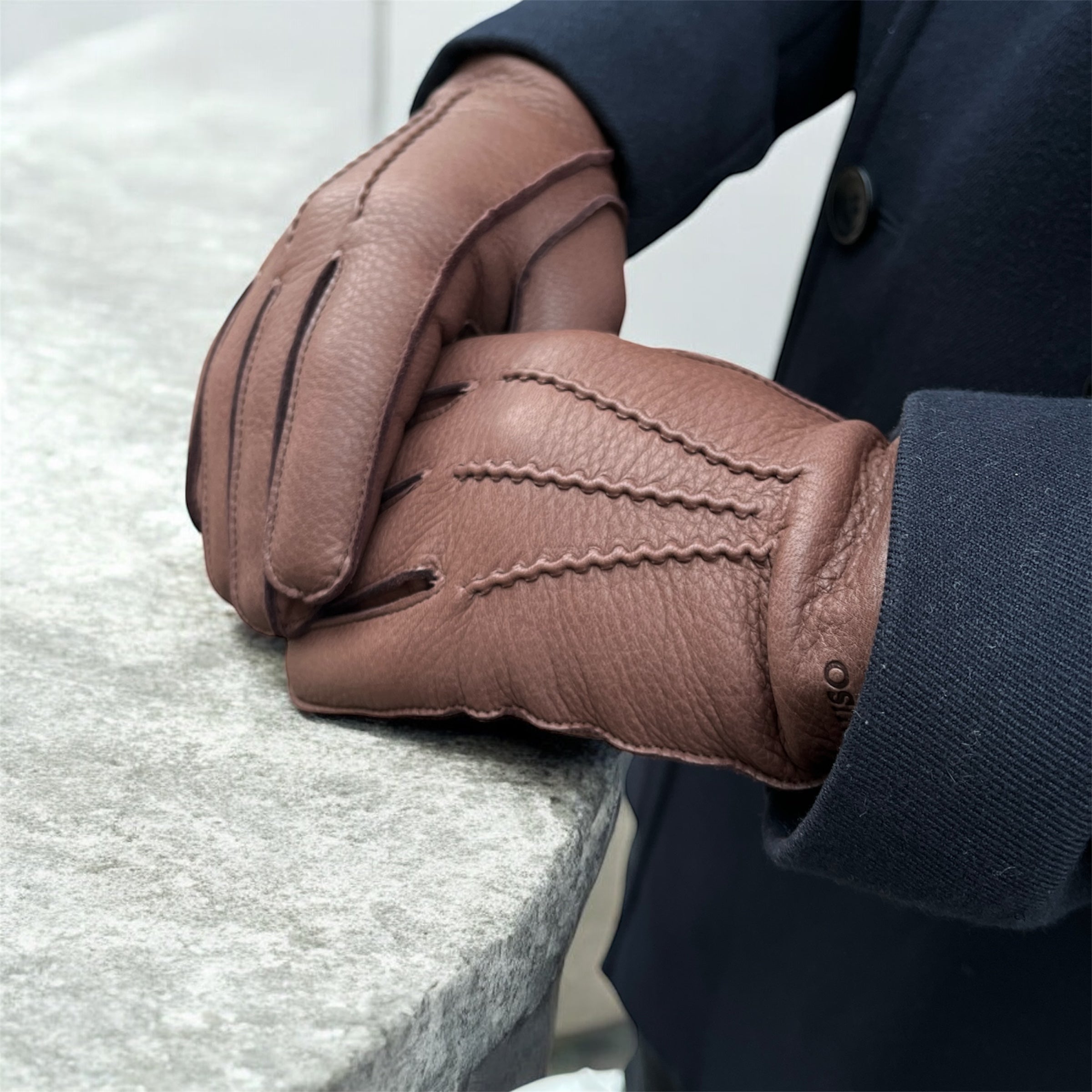 Deer leather, which is perfect for gloves, is a soft, thin and abrasion-resistant material. The glove has a wool-cashmere blend lining. Durable and warming wool combined with soft cashmere forms a comfortable lining on the skin. There are three decorative stitches on the back of the palm. There is an elastic band on the wrist that increases the fit. The length of the cuff is approx. 5 cm, so it covers the wrist. To ensure a perfect fit of the gloves They are made using the centuries-old table-cutting method. In this method, excess stretch is manually stretched out of the leather, but still leaves room to shape to the user's hand. This also means that the glove does not stretch, even after a long period of use.