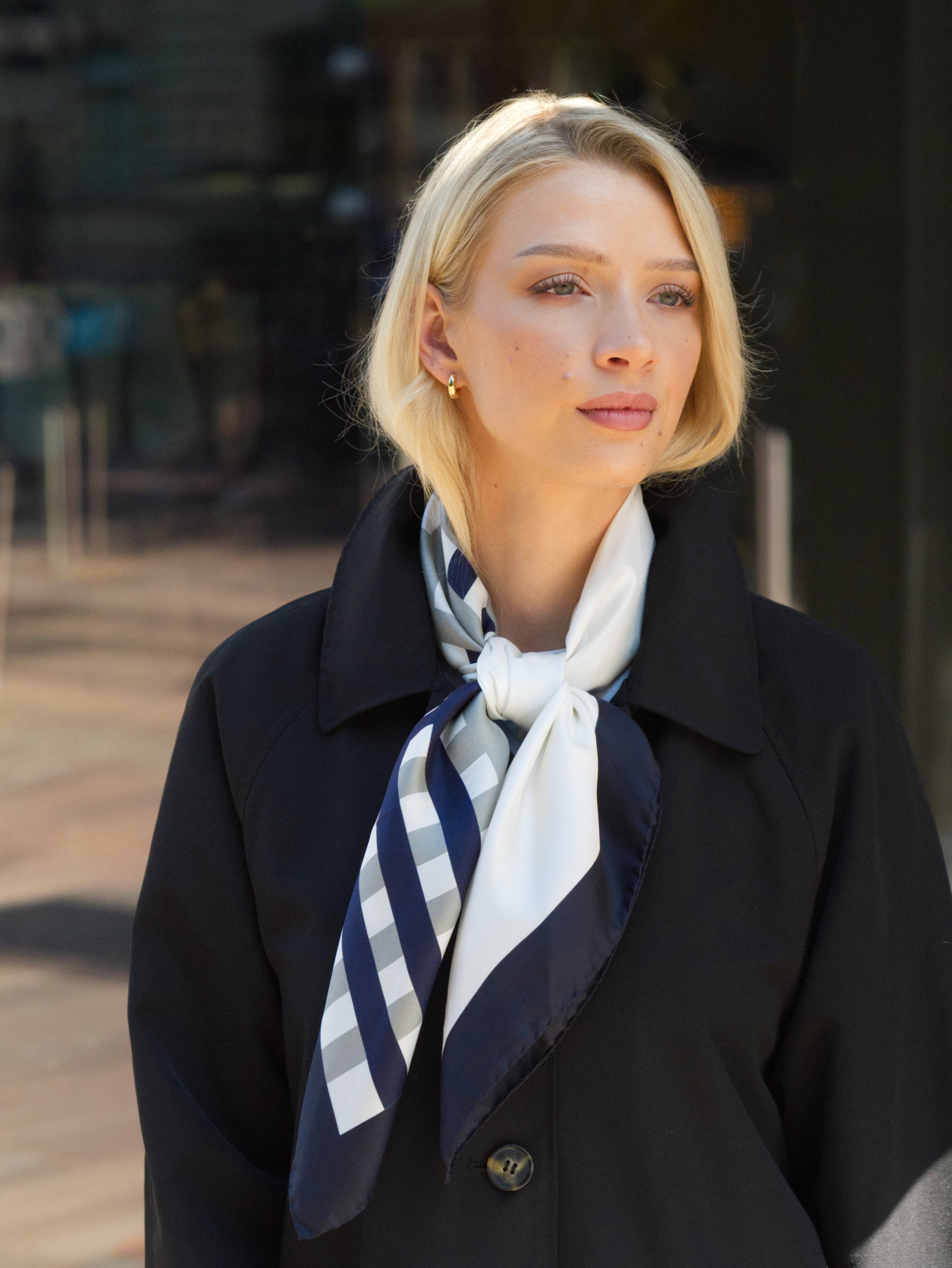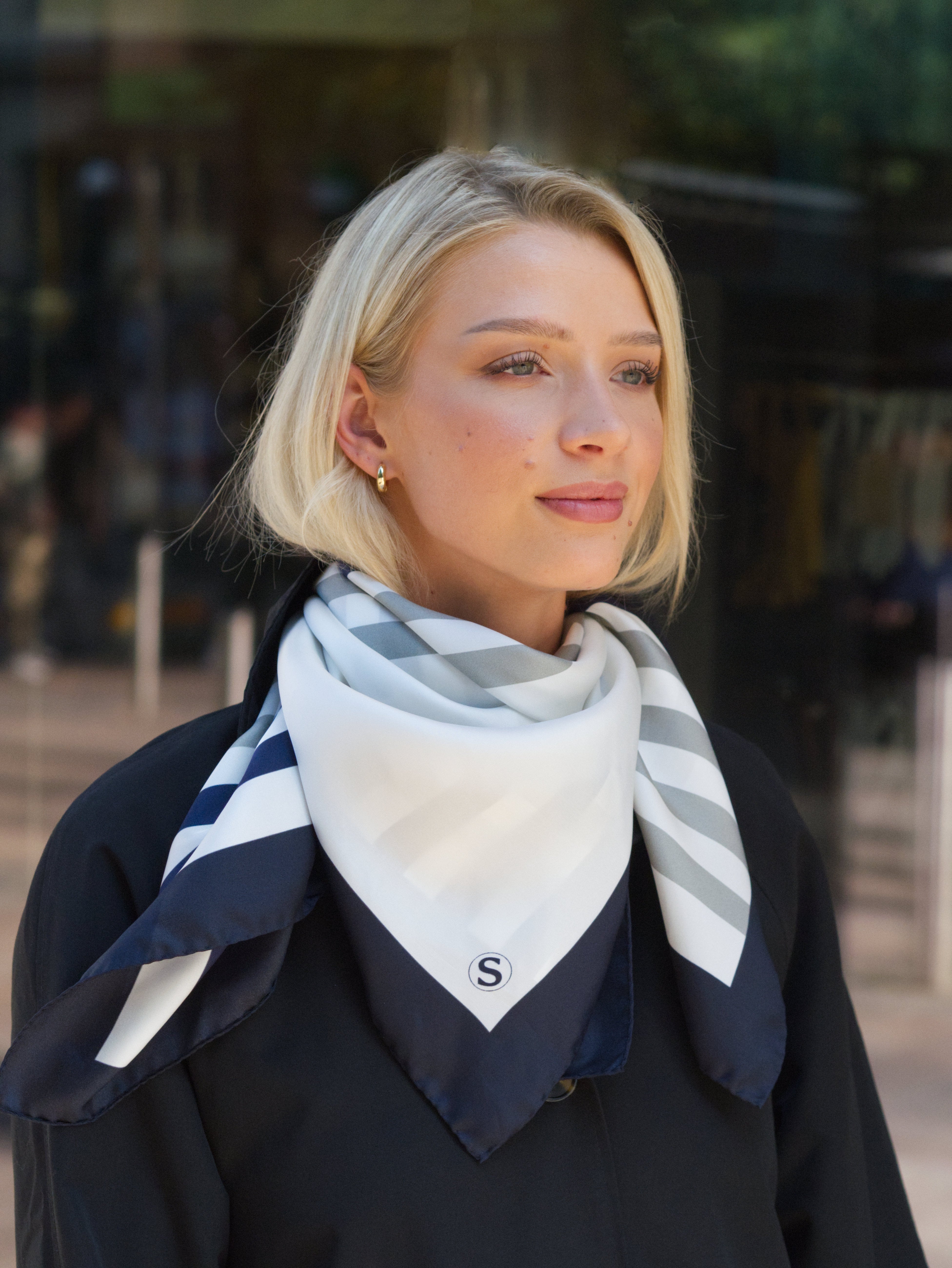 A classic silk scarf is one of the most versatile accessories that works from season to season. As a natural material, silk is unparalleled due to its durability and breathability. A silk scarf is a luxurious yet practical accessory. The base color of the scarf is white, the striped edges are dark blue and pearl gray. A fresh ensemble that illuminates the face.