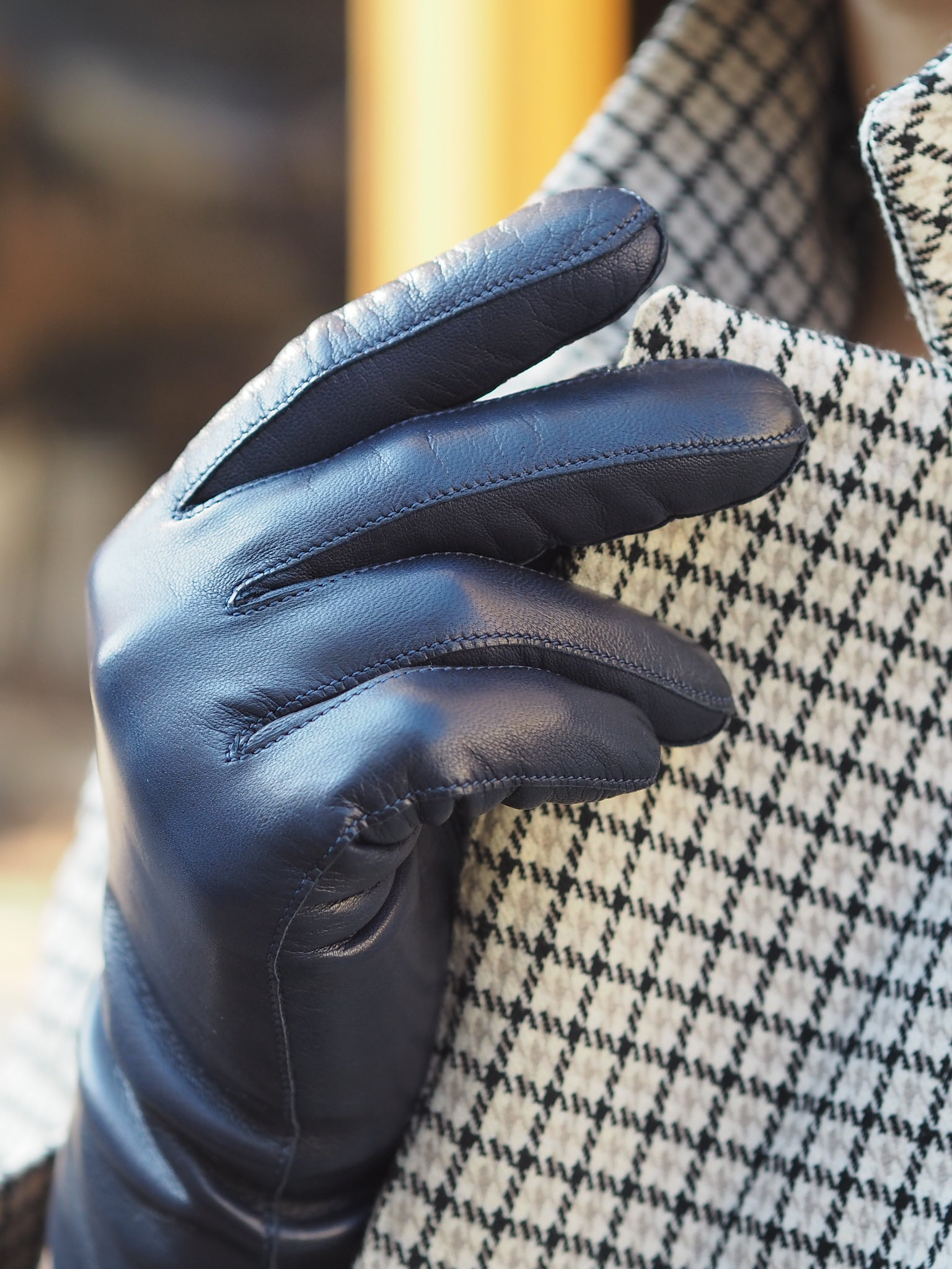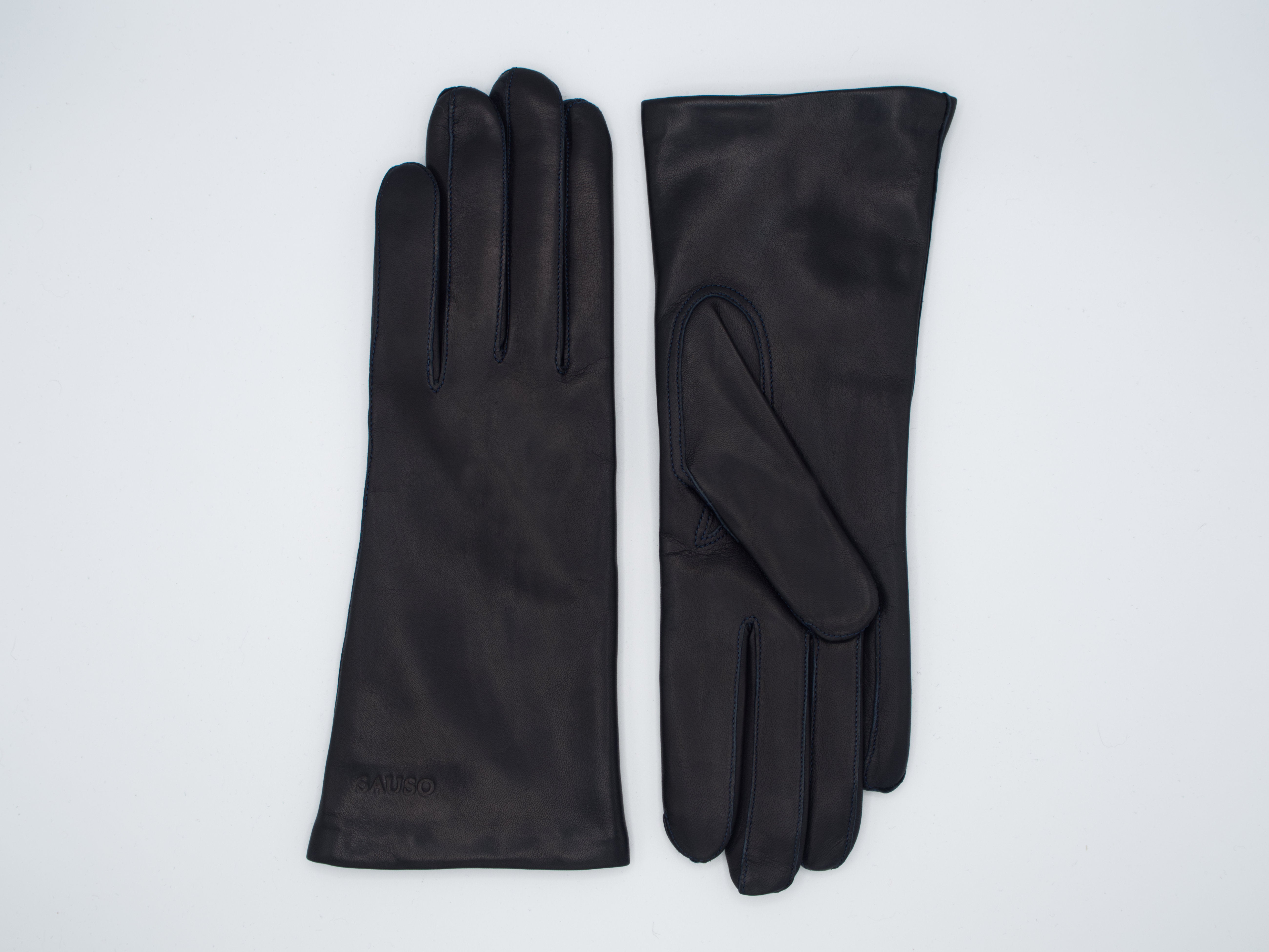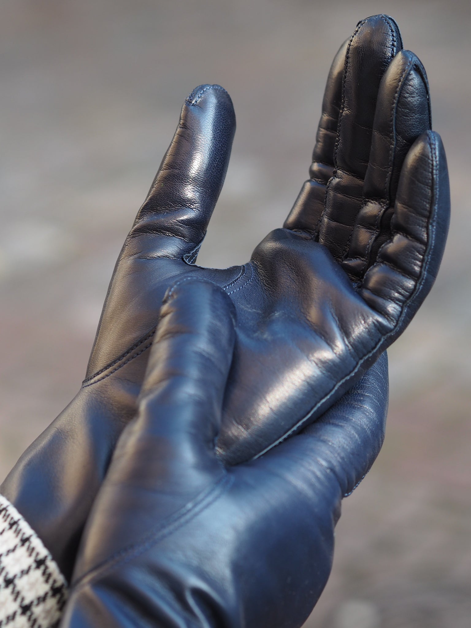 Dark blue, basic sheepskin gloves with a long, wrist-covering sleeve and a step seam. The cashmere-wool lining is wonderfully soft and warm.