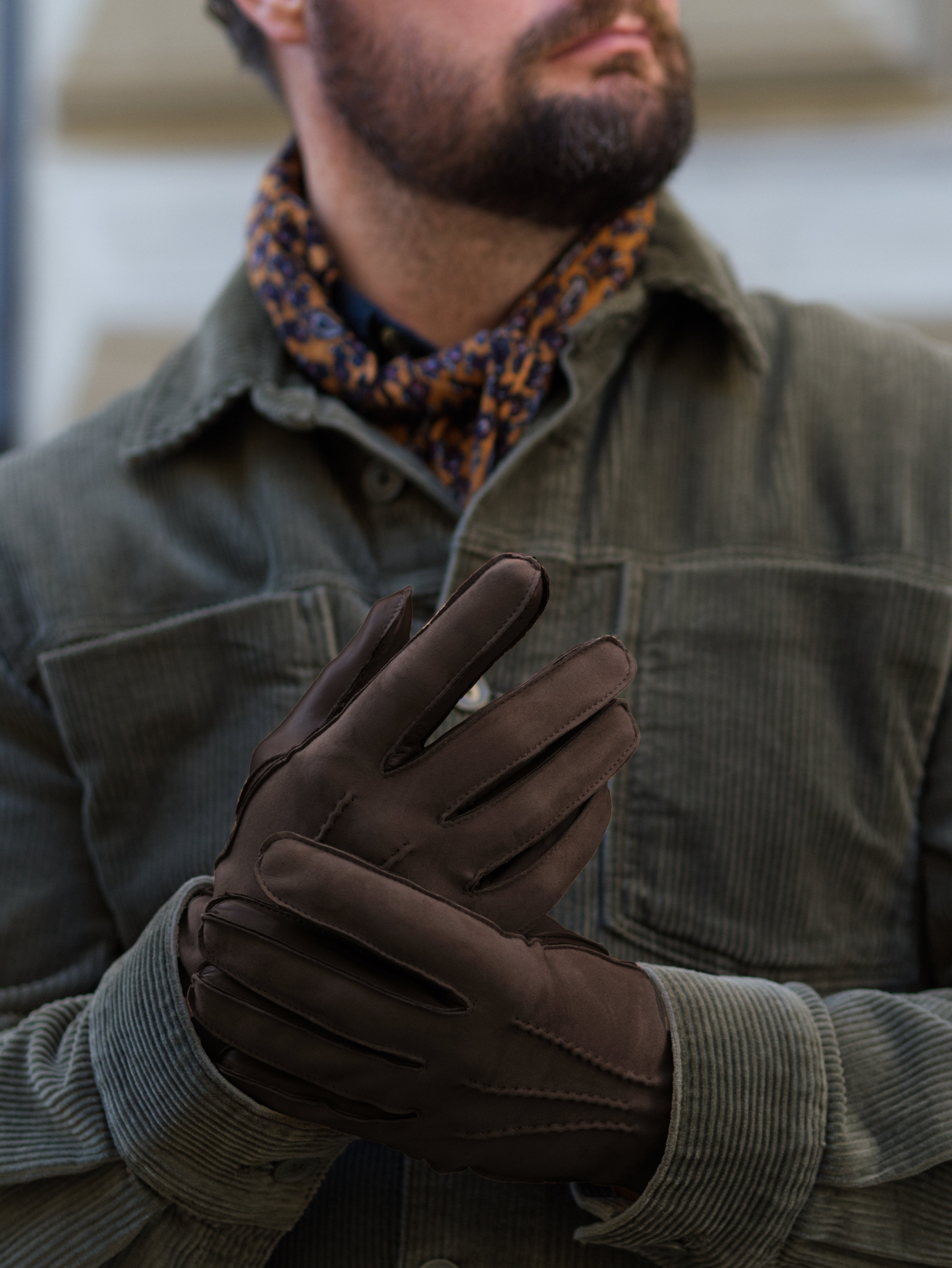 Handmade gloves made of soft hairsheep leather, with a suede back of the hand and nappa leather palm.