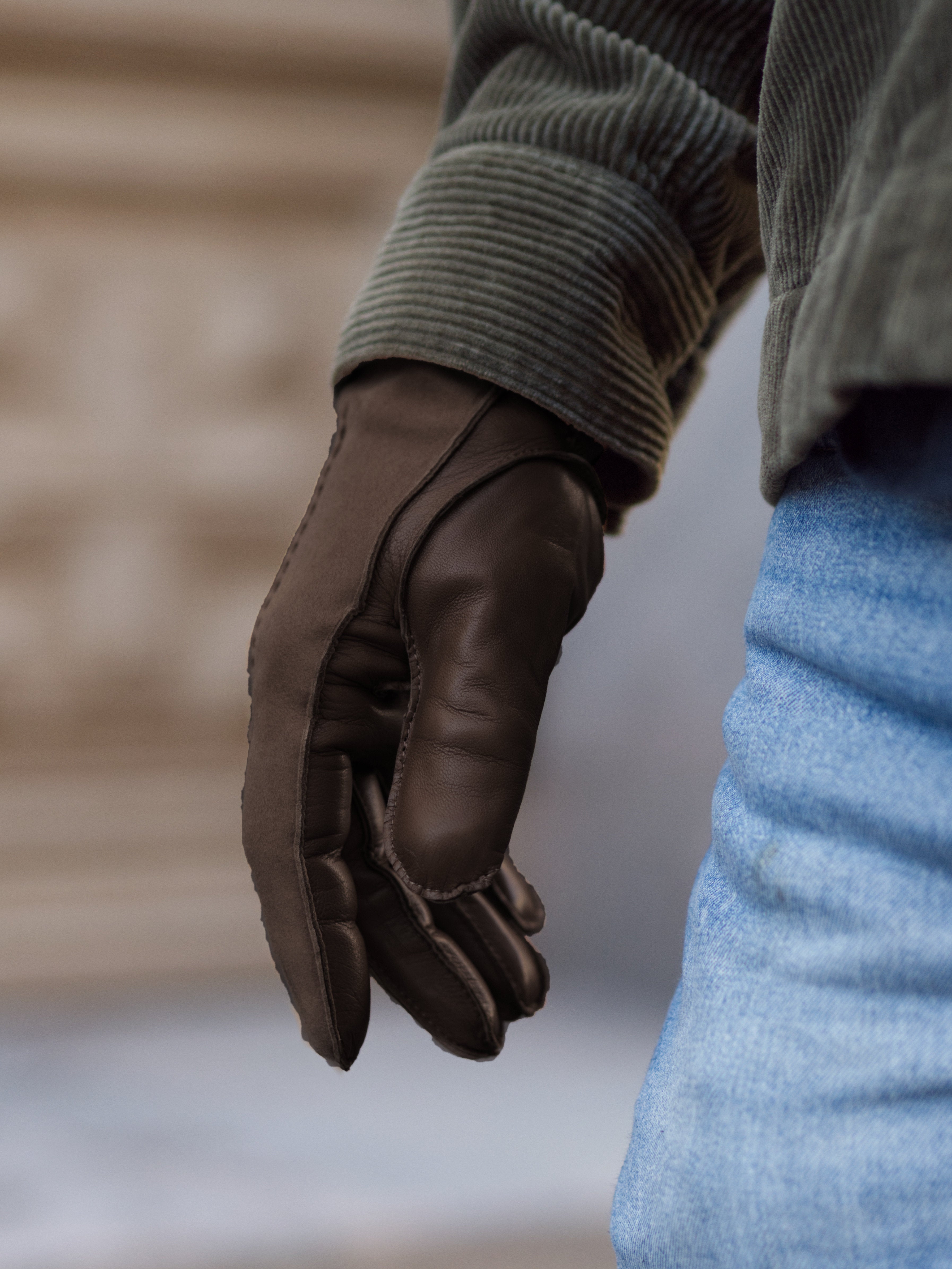 Men's cognac brown leather gloves. Handcrafted from soft, full-grain sheepskin, these gloves combine the best of nappa leather and suede. The back of the palm is made of soft suede and the palm is made of nappa leather. The leather is thin and flexible, so it feels comfortable and light in the hand.