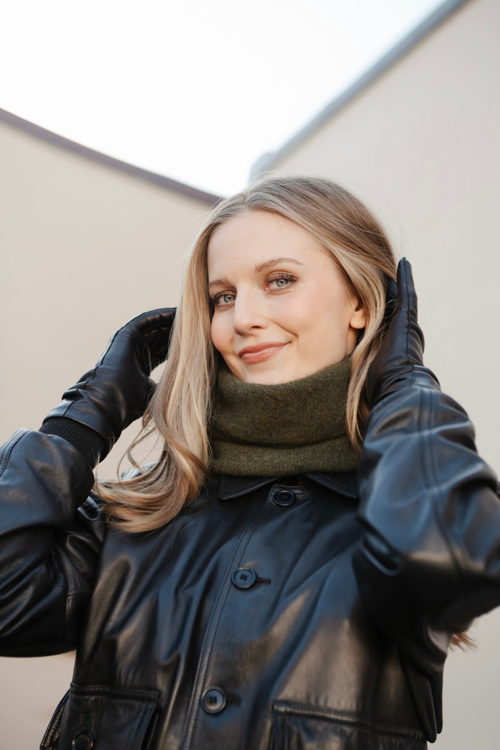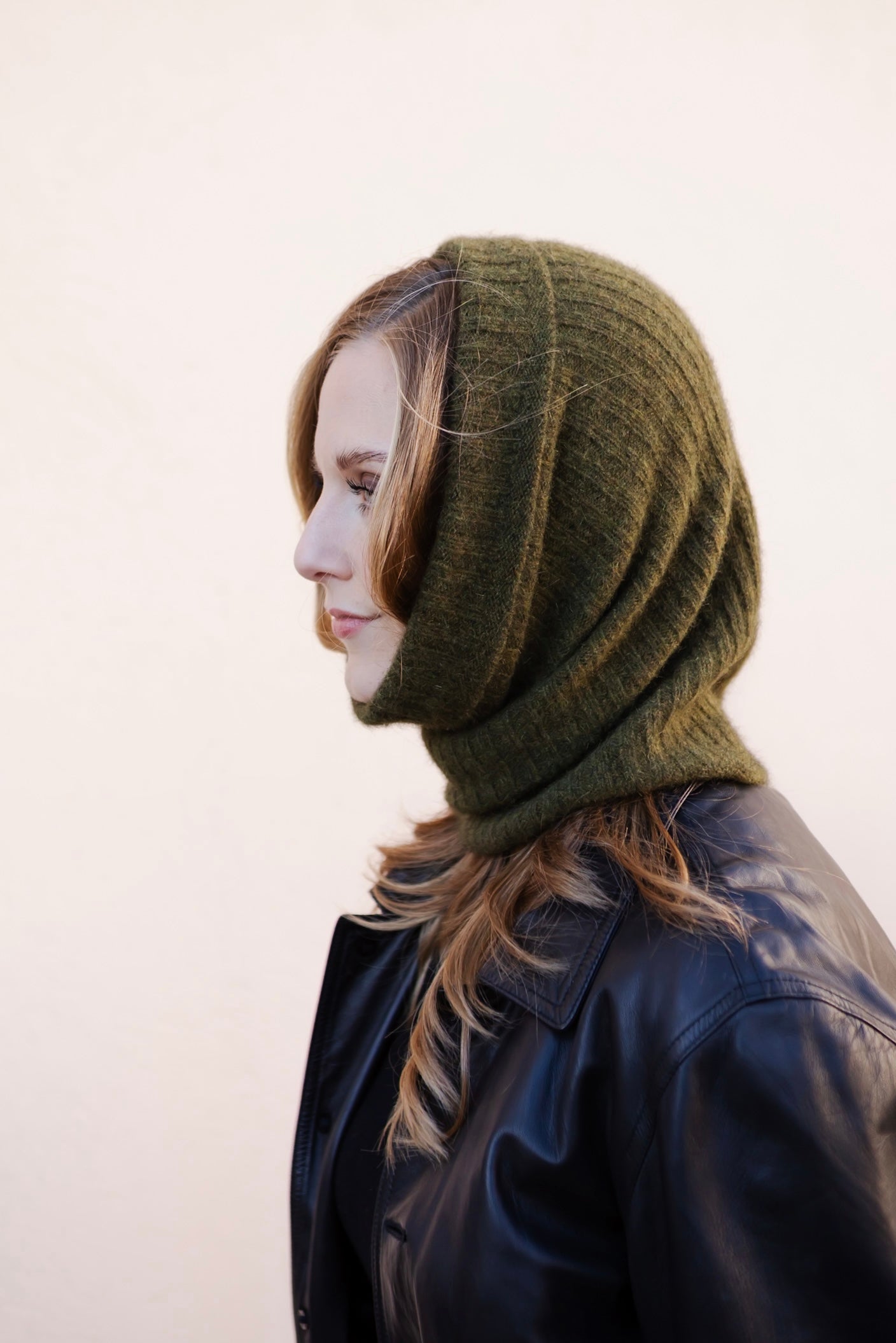Kestävästä ja lämpimästä merino-kettukusunkarvaneuleesta neulottu vihreä tuubihuivi.
