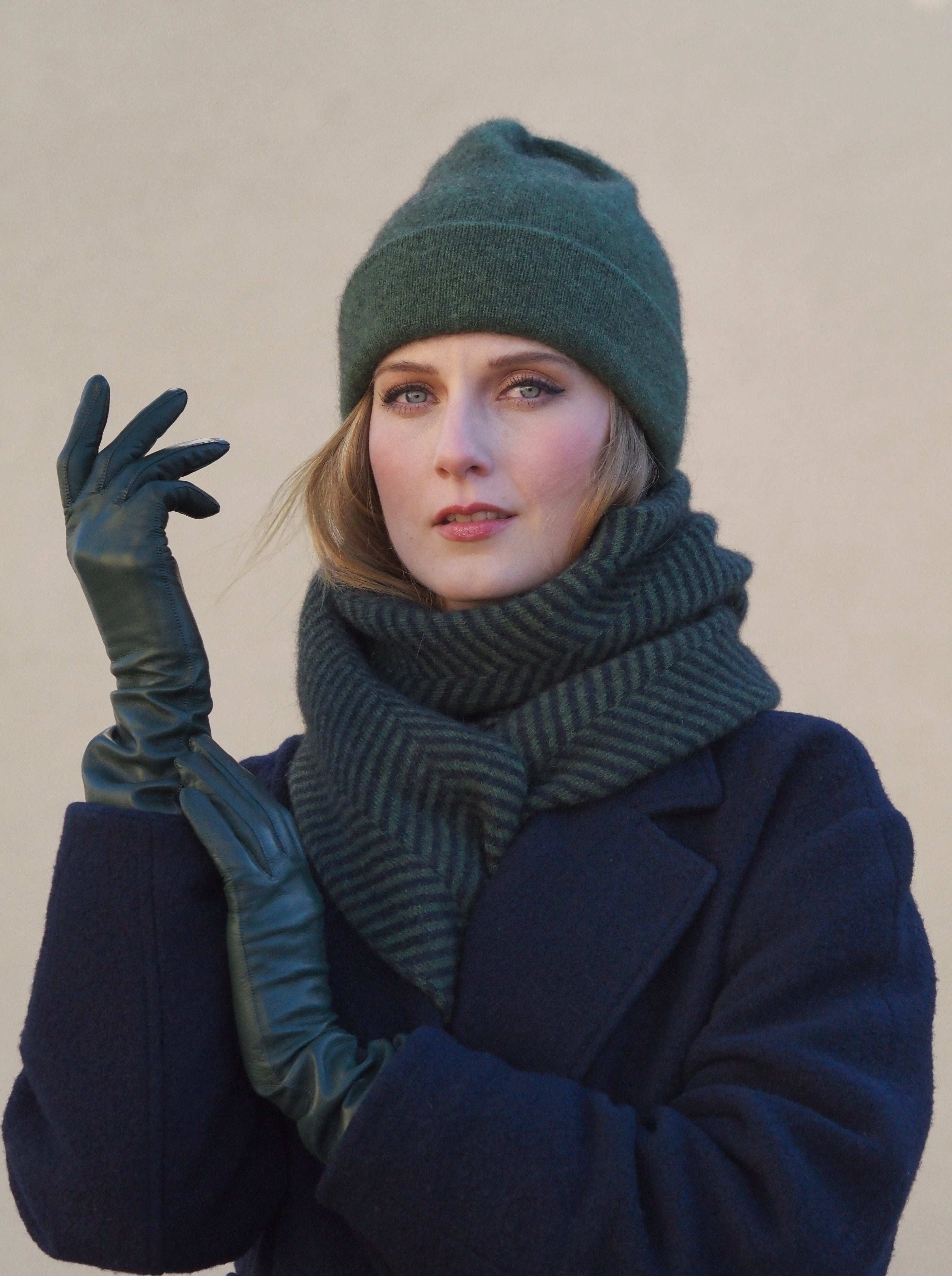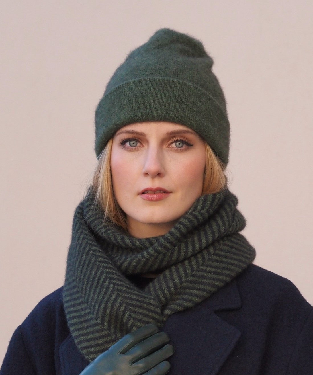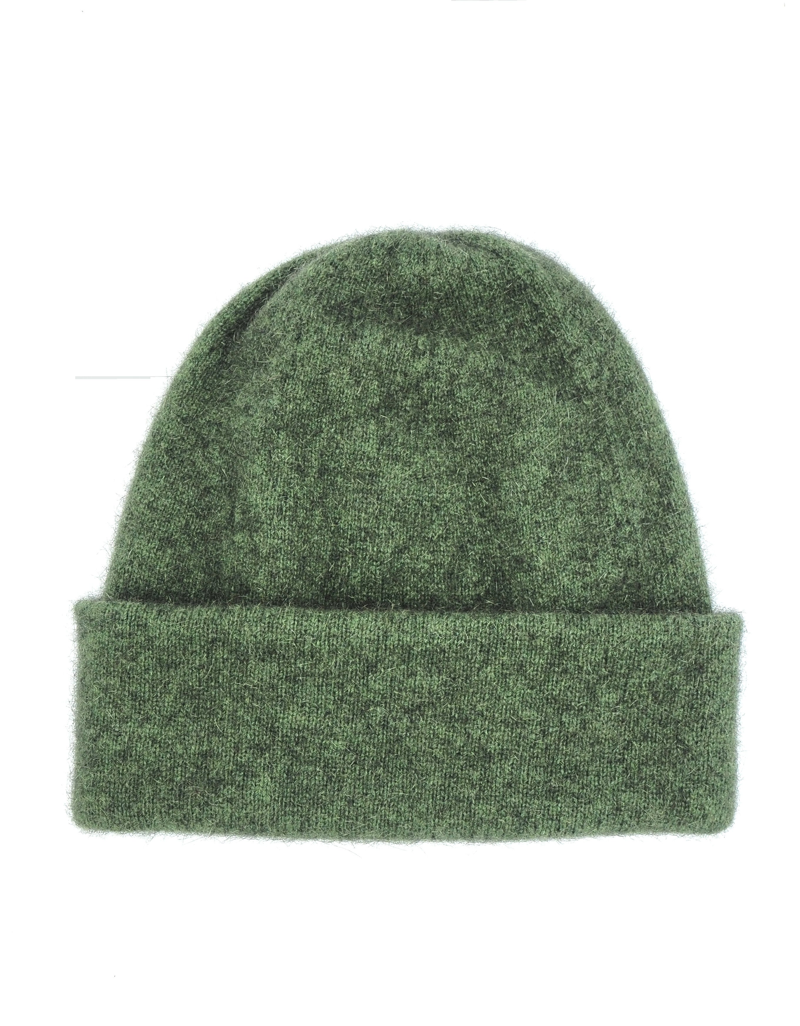 Lämmin ja pehmeä vihreä merinovilla/kettukusunkarva/silkki -pipo.