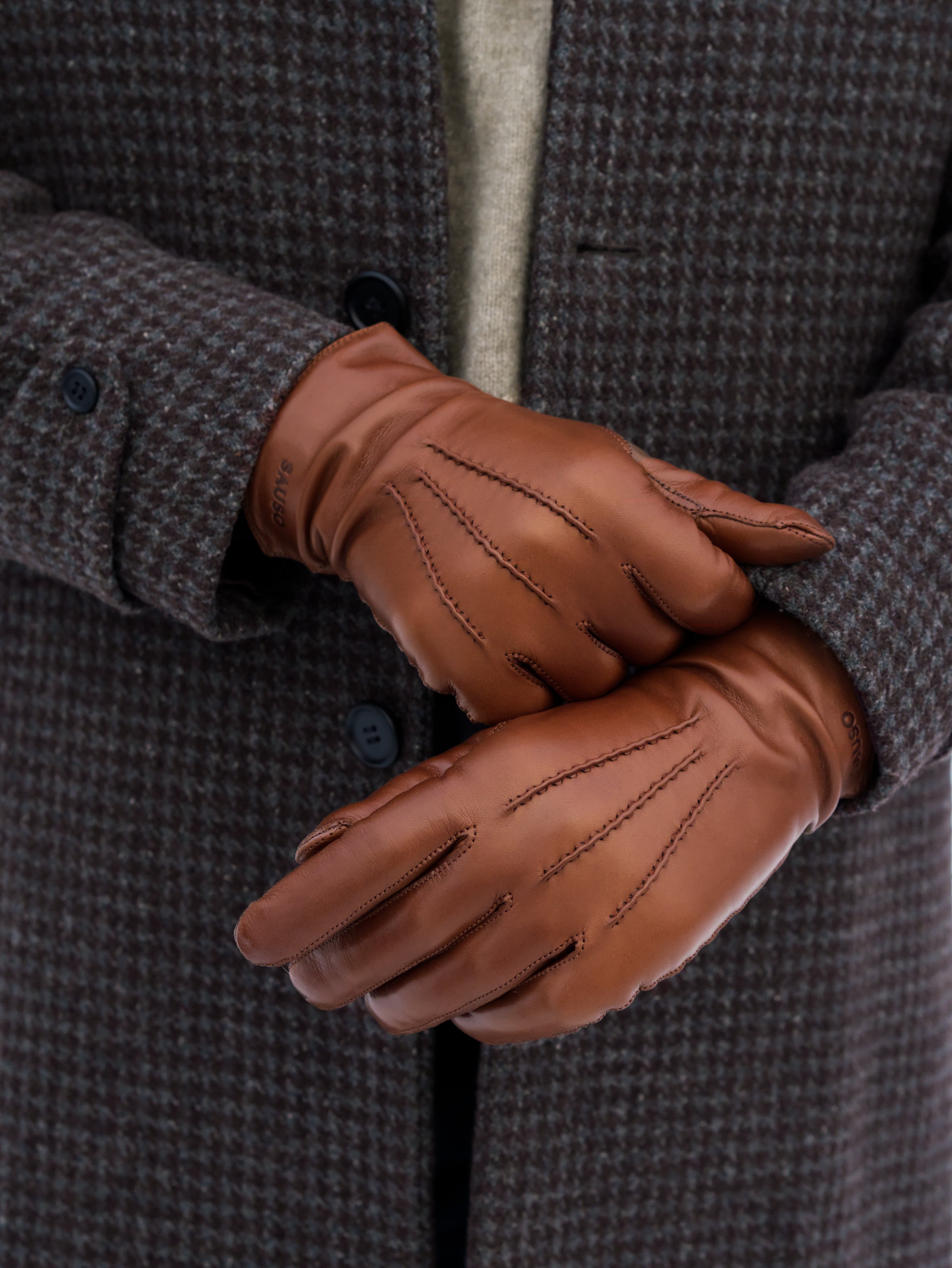 Classic men's cognac brown leather glove with a warm cashmere wool lining. These classic gloves are perfect for everyday and formal wear for a stylish man.
