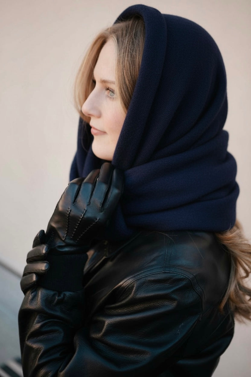 Scarf poncho. Made from merino fox fur, this navy blue scarf poncho is an easy and versatile piece of clothing for the whole family.