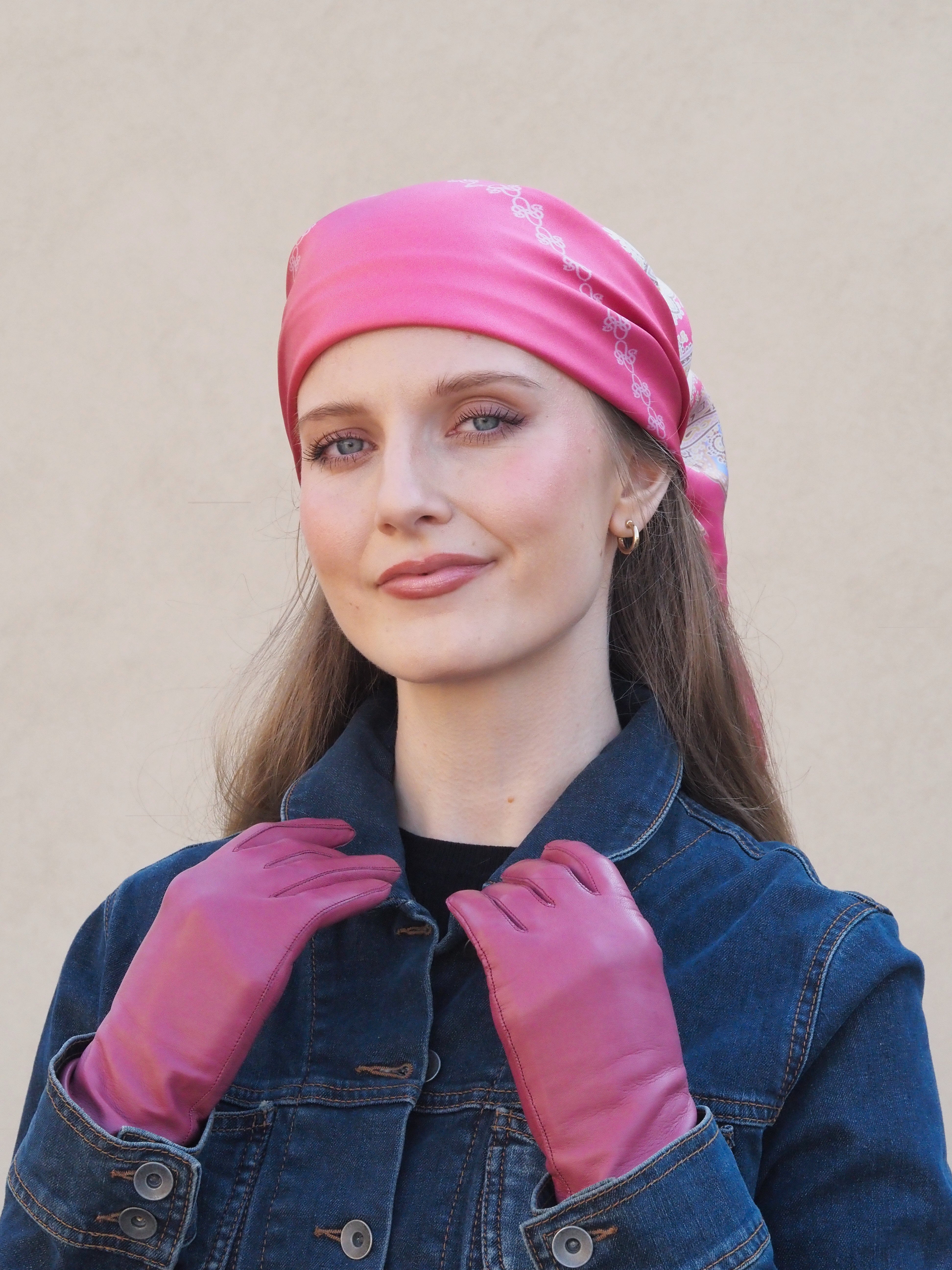 Tummatukkaisella mallilla Saana merino-possum pipo värissä Rosay. Vaalealla mallilla päässä silkkihuivi Corallo värissä Coral.