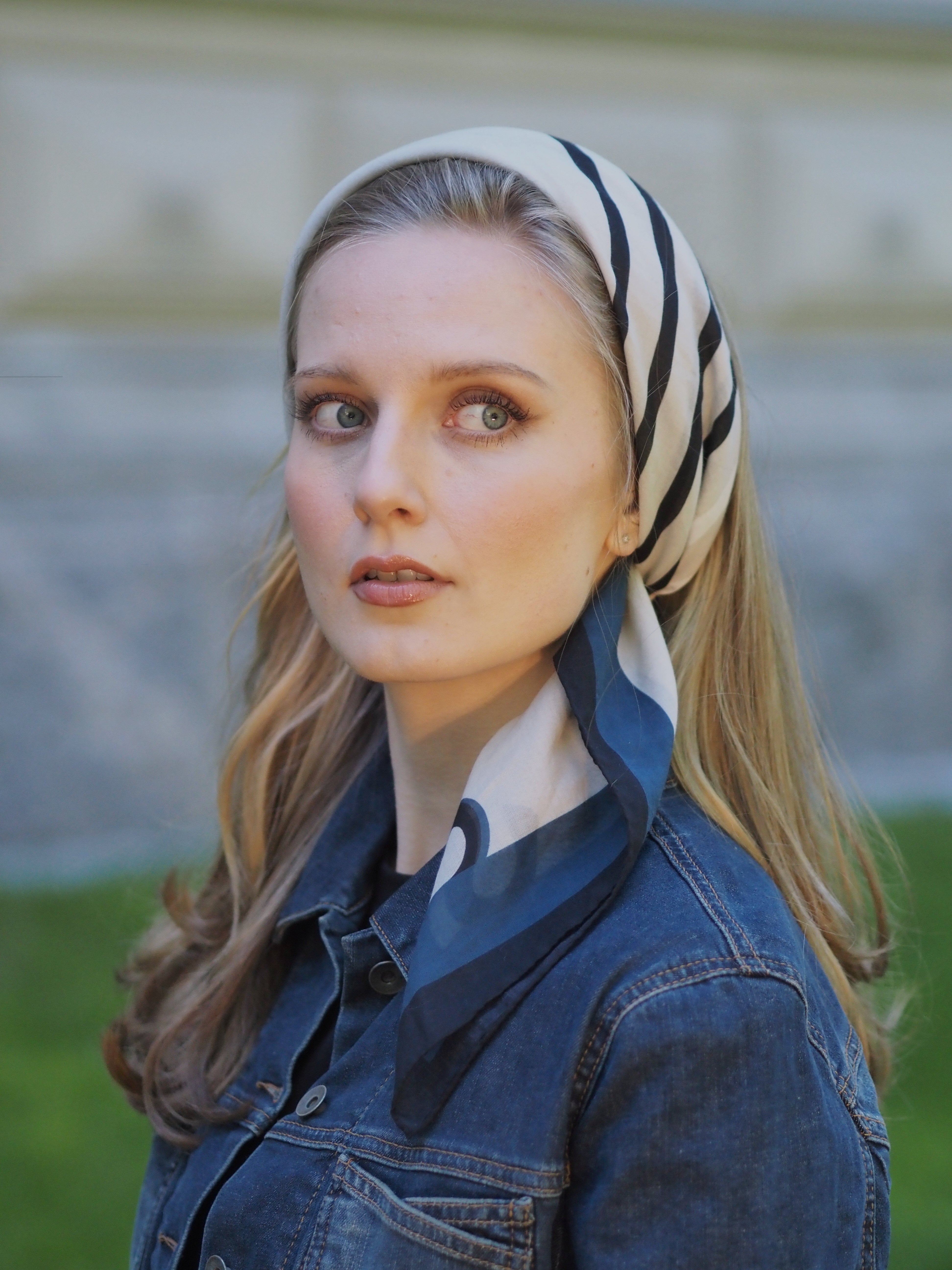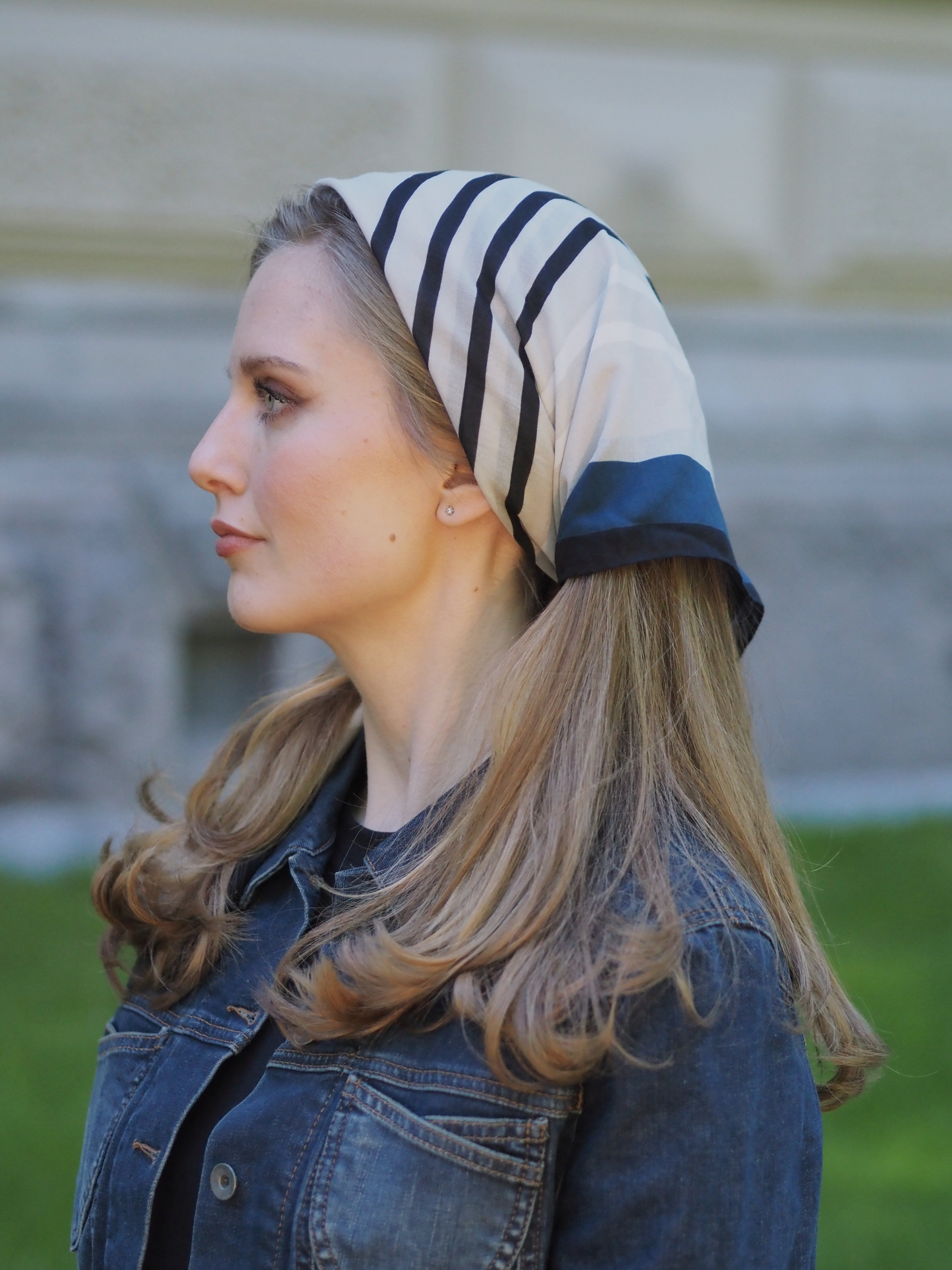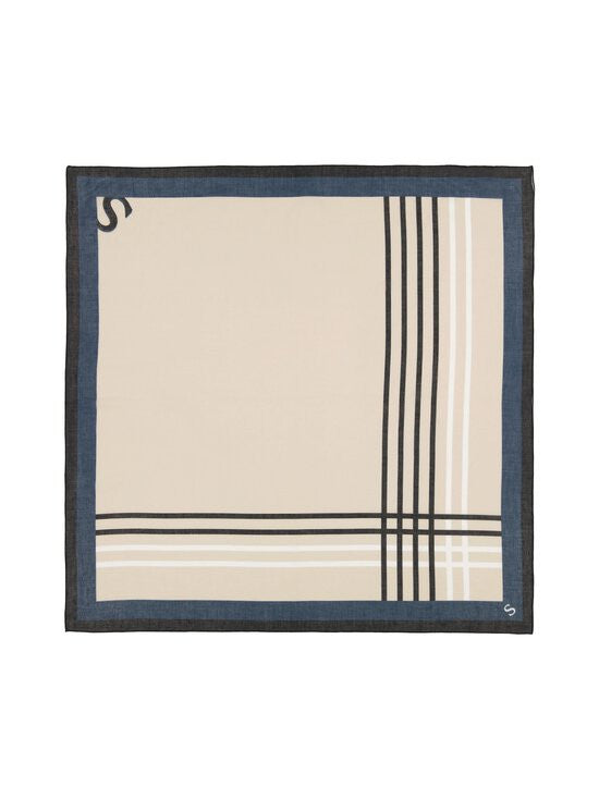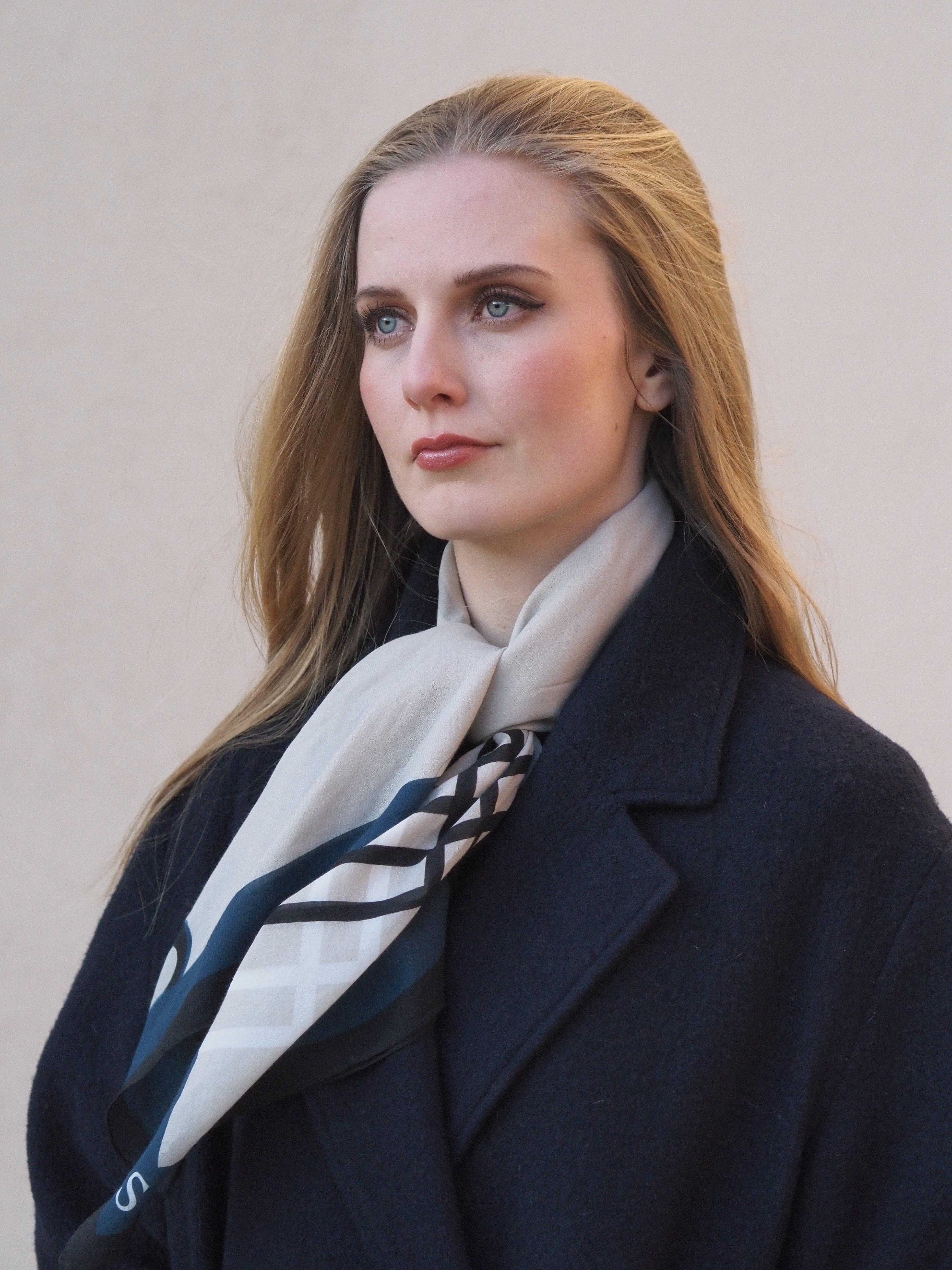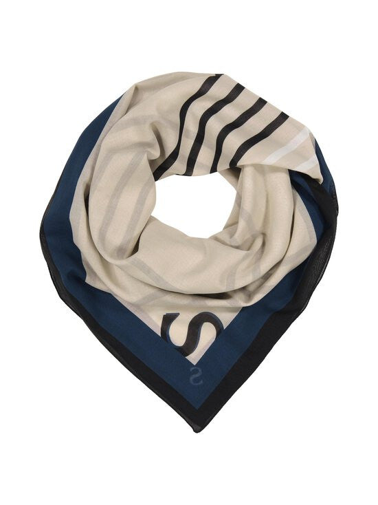 Italiassa tehty, pehmeä ja laadukas puuvillahuivi. Klassinen beige, jossa musta reuna, mustat ja valkeat raidat ja denimin sininen efekti raita. Koko 90x90cm menee kaulalle, päähän, vyötärölle vyöksi ja jopa topiksi. Huivi, jolla luot tyyliä vaikkapa perus T-paidalle tai kauluspaidalle tai suojaat kaulaa tai päätä tuulelta. Huivi, joka ei ole tukala ja vie tilaa kaulalla, mutta antaa paljon tyylikästä ilmettä ja suojaa. Italialainen puuvillakangas on ihanan pehmeä ihoa vasten.