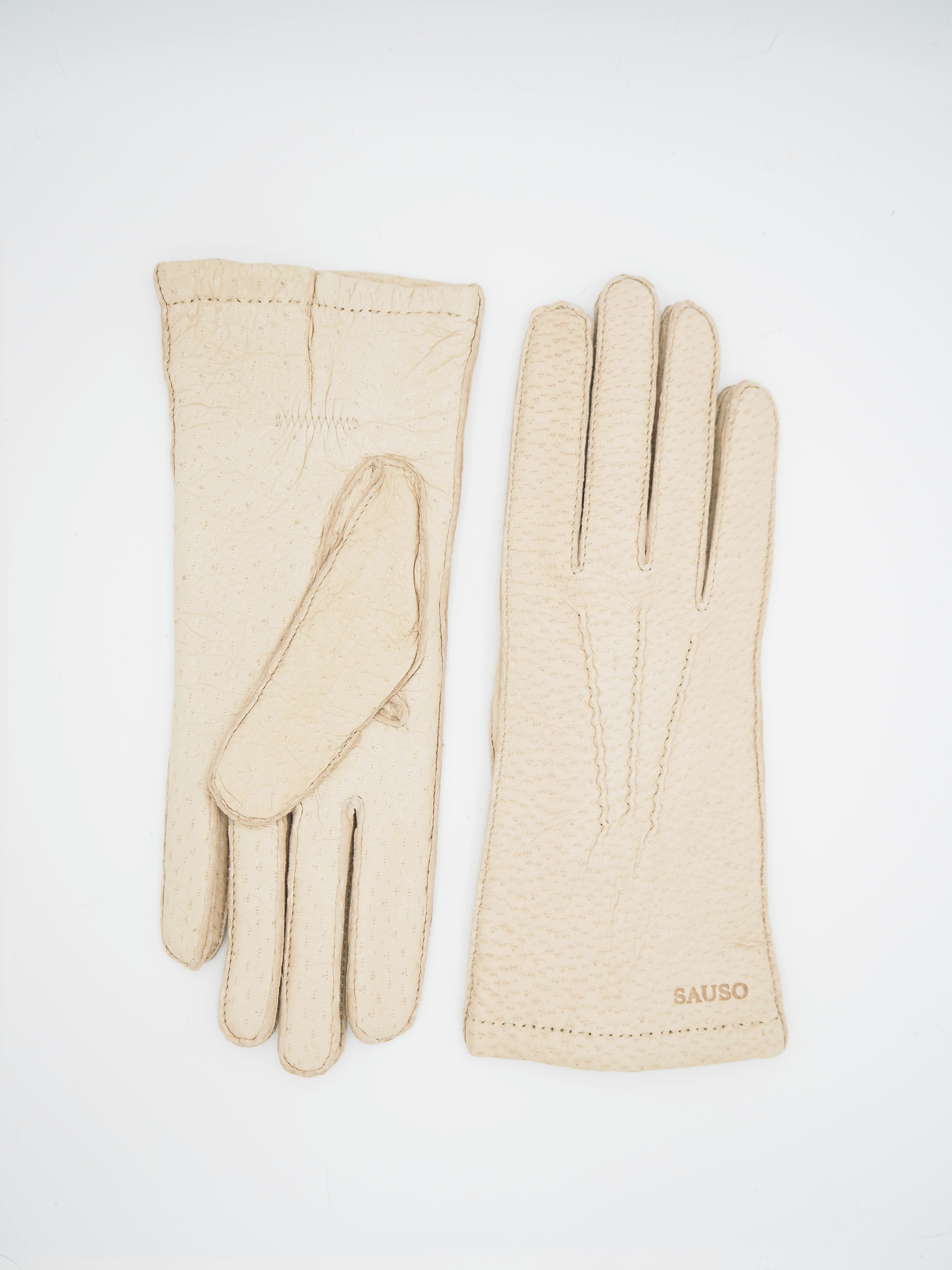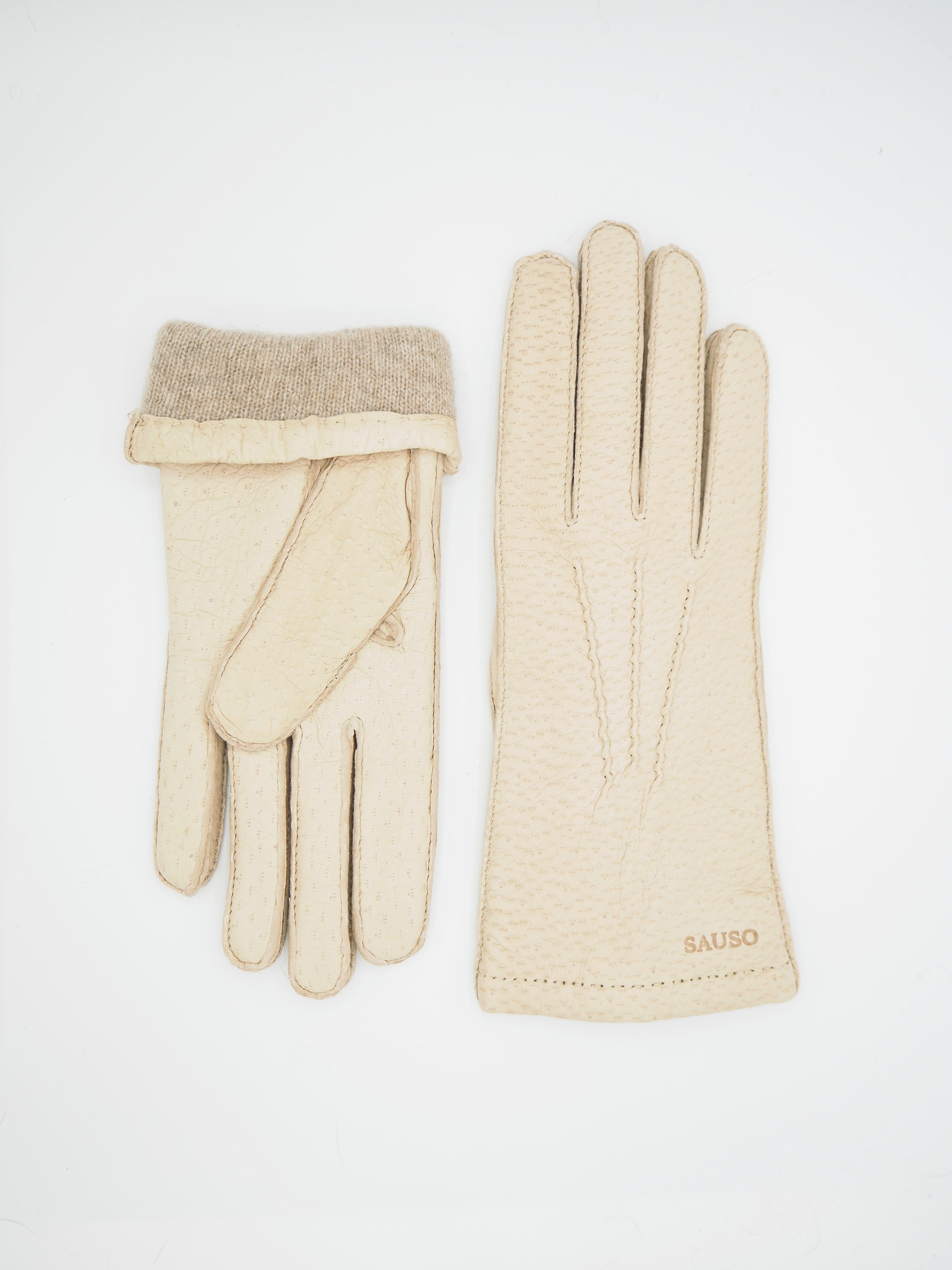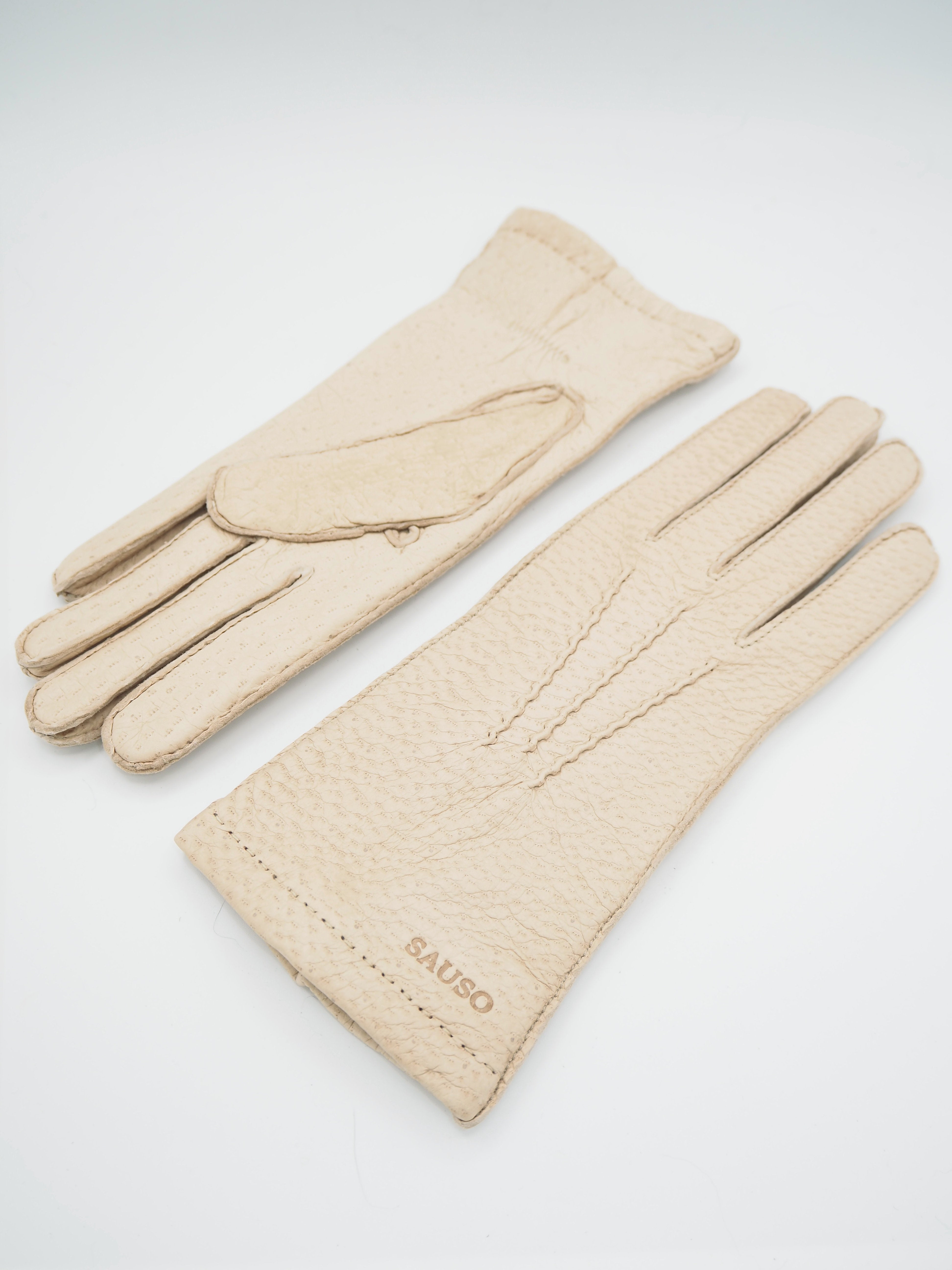 Peccary- villisiasta käsityönä valmistetut vaalean beiget käsineet ovat todellinen klassikko. Ajattomissa käsineissä on samettisen pehmeä nahka, lämmin kashmir-villavuori ja klassinen malli. Loistava tuntuma ja kestävyys tekevät siitä käsineiden aatelia. Villisian nahassa on aivan erityinen pintastruktuuri. Raflaava nahkan luontainen kuvio tekee käsineistä erityiset.