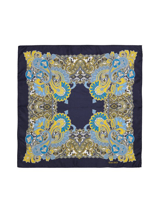 Danna silkkihuivin koko on 70x70cm. Koko on mainio sekä kaulalla, päässä että solmukkeen sijaan miehellä, jopa taskuliinana tai vyönä. Kuvion väreissä hohtavat aina tyylikkäät ja klassiset sinisten, keltaisten ja kullan eri sävyt.