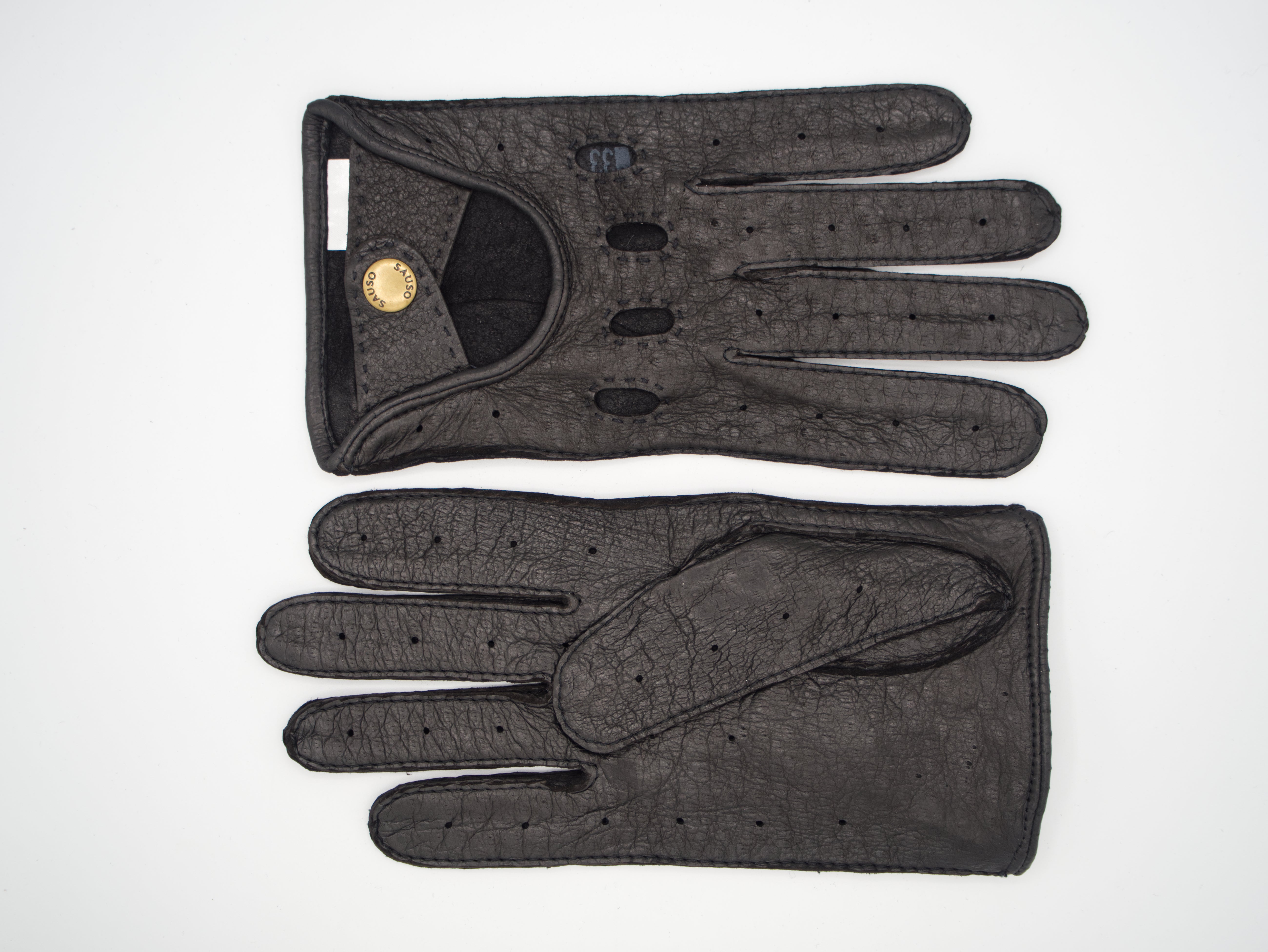Klassiset peccary-villisiannahkaiset mustat ajokäsineet, jossa rystysreiät ja painonapilla suljettava ranne.