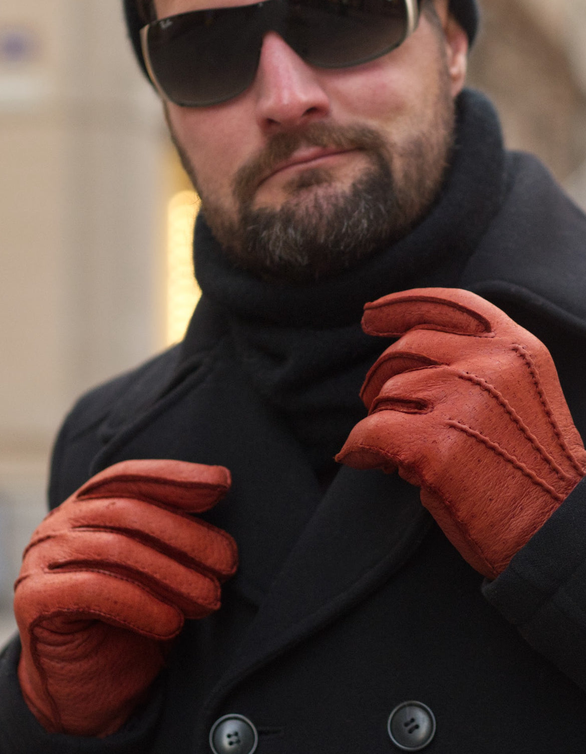 Peccarykäsineet. Miesten punertavanruskeat peccaryhanskat pitävät kädet lämpiminä kylmälläkin talvisäällä. Käsityönä valmistettu klassikkokäsine on käsineiden ja nahkojen aatelia.
