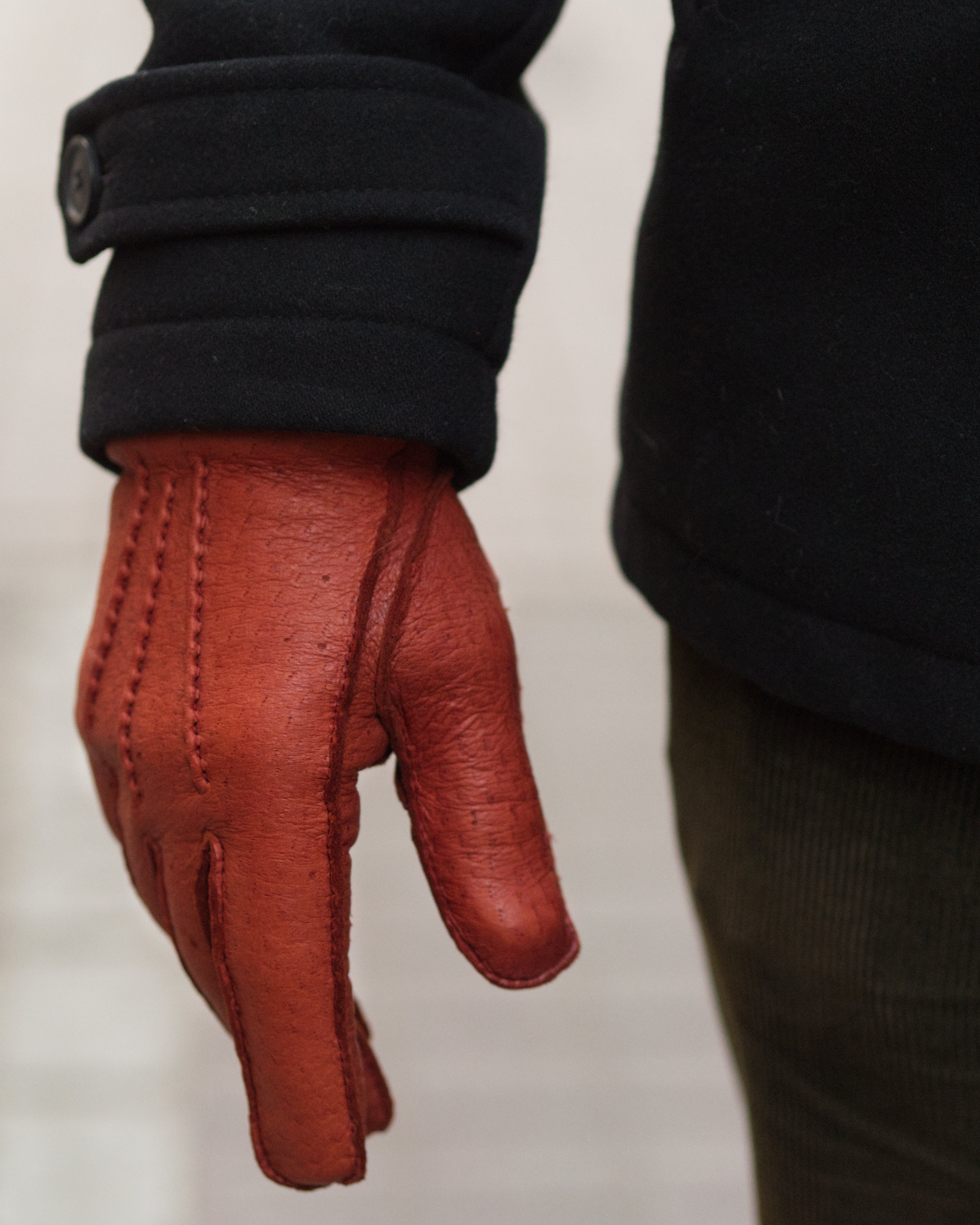Lämpimänsävyisessa punertavanruskeassa näkyy myös hienosti nahan kaunis rakenne. Villieläimen nahasta valmistettujen käsineiden persoonalliseen luonteeseen kuuluvat pienet elämän jäljet, joten jokainen pari on uniikki. Aidon peccarynnahan tunnistaa helposti nahassa näkyvistä karvatupinrei'istä, jotka esiintyvät aina kolmen reiän ryhmissä. Nahan värissä voi aina esiintyä hiukan luonnollista vaihtelua eri parien välillä, eli käsineiden väri voi olla hiukan erilainen kuin kuvissa.