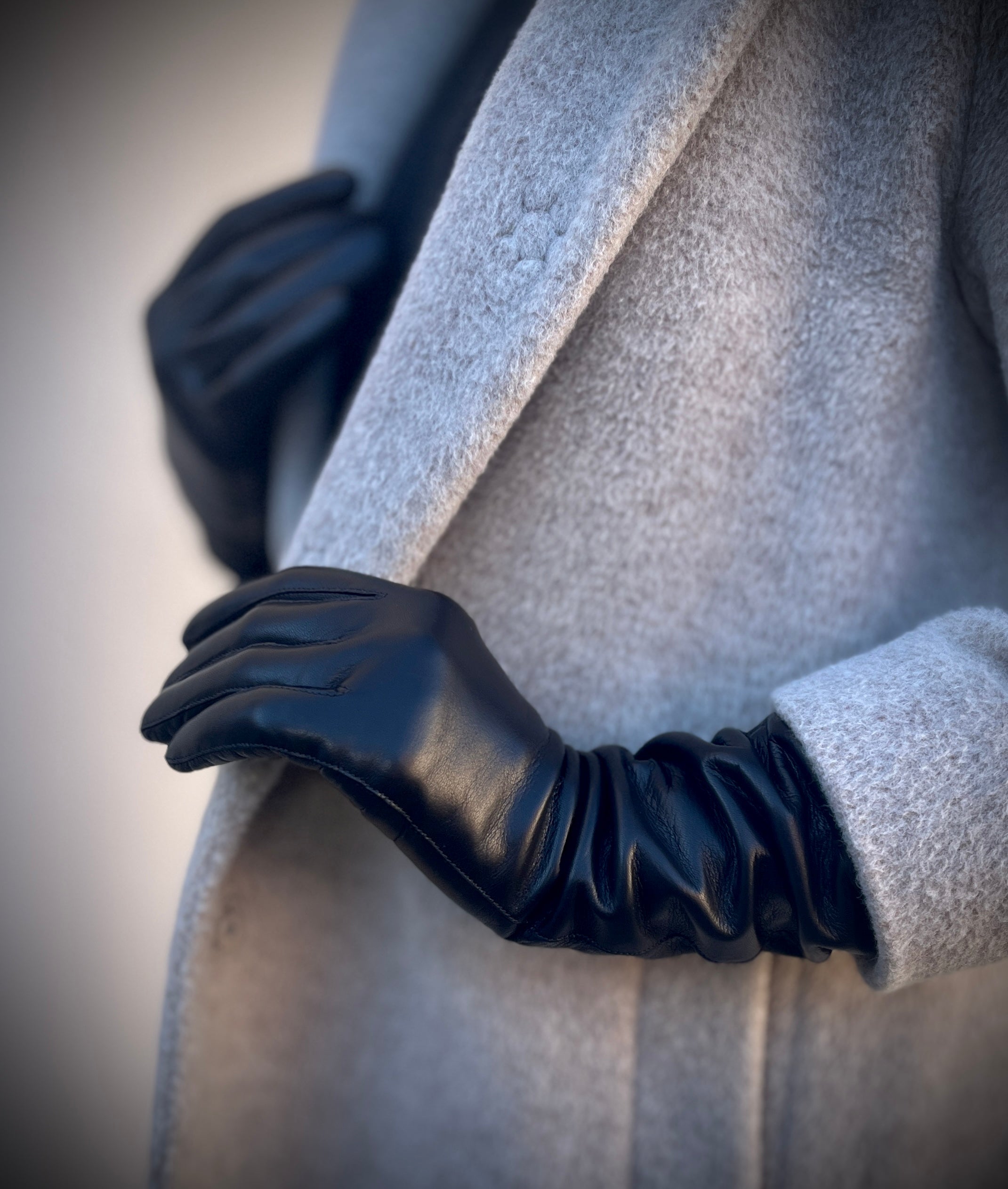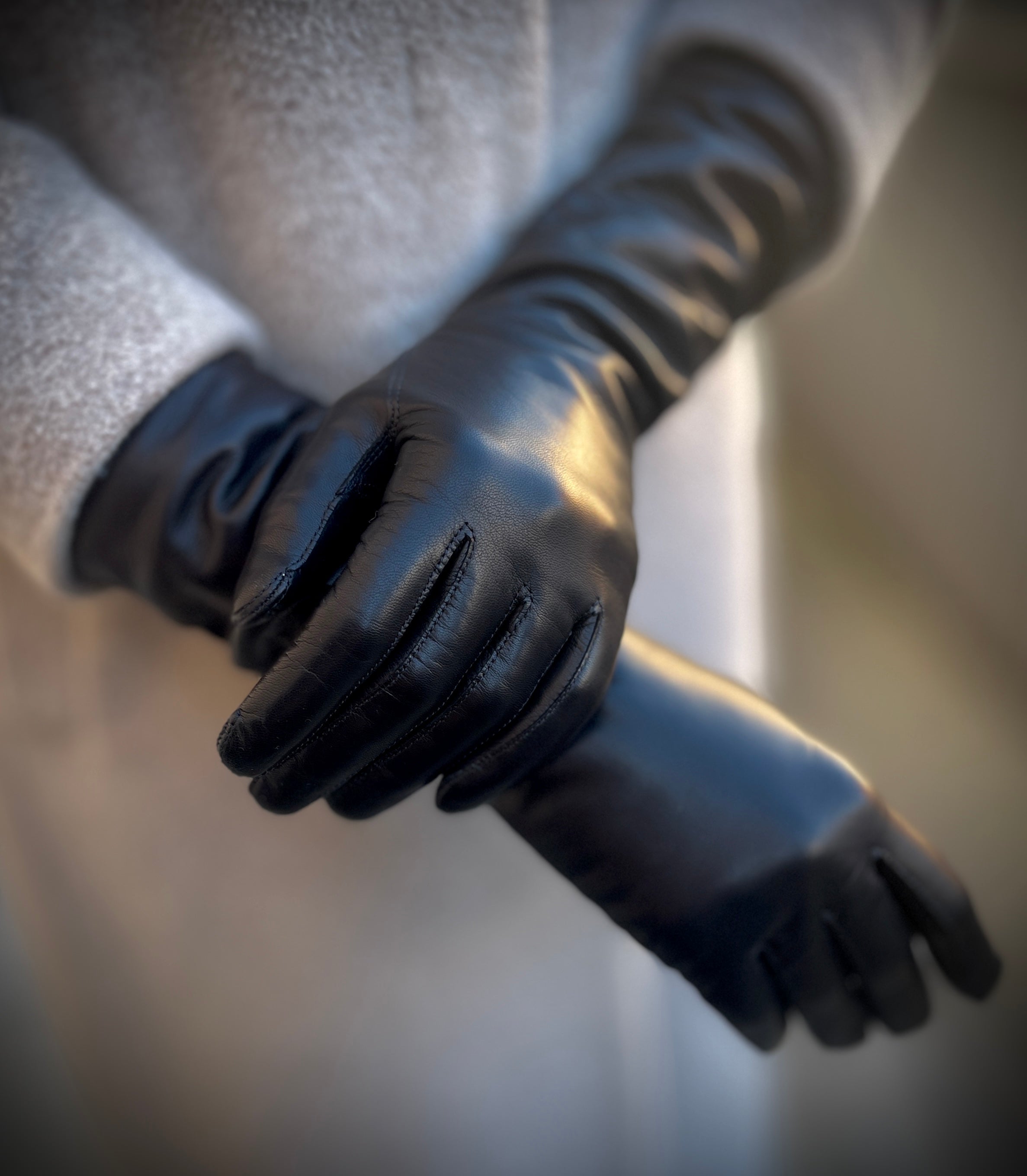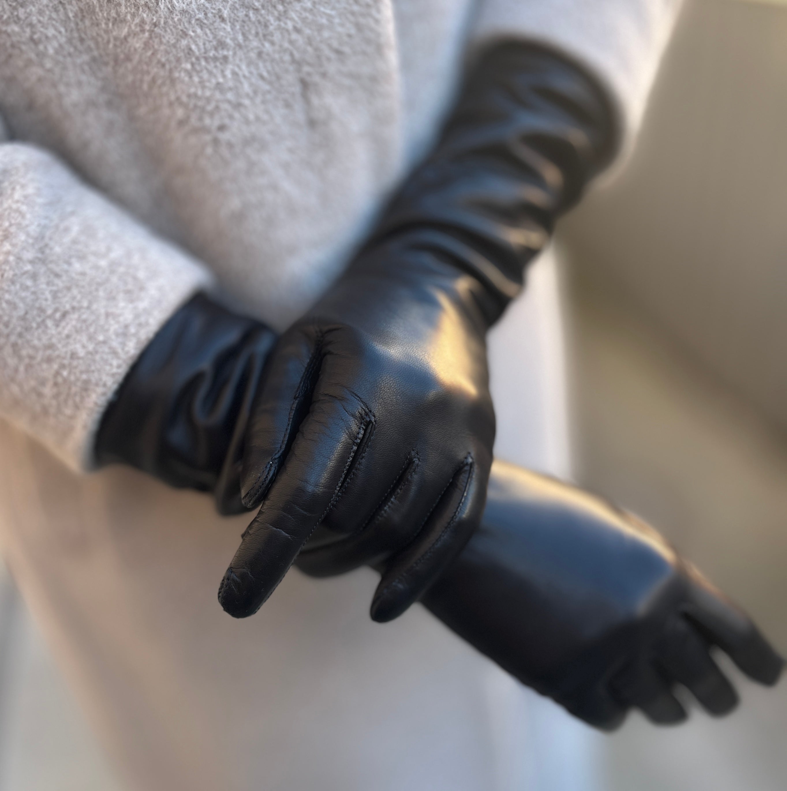 Lumoavat pitkävartiset käsineet. Lempi käsineet sopivat niin arkeen kuin juhlaankin. Käsineen varren pituus on 8” (n.20cm) joten se käy loistavasti myös näyttäväksi juhlakäsineeksi! Elegantti pitkä varsi sopii mainiosti myös lyhyt- ja/tai leveähihaisten takkien tai viittojen kanssa. Koska nahka ja silkkivuori ovat niin ohuet, käsineen varsi istuu hyvin takin hihan alle. Monikäyttöiset käsineet ovat myös käytännölliset lämmittäen käsivartta lyhythihaisten yläosien kanssa takin alla.