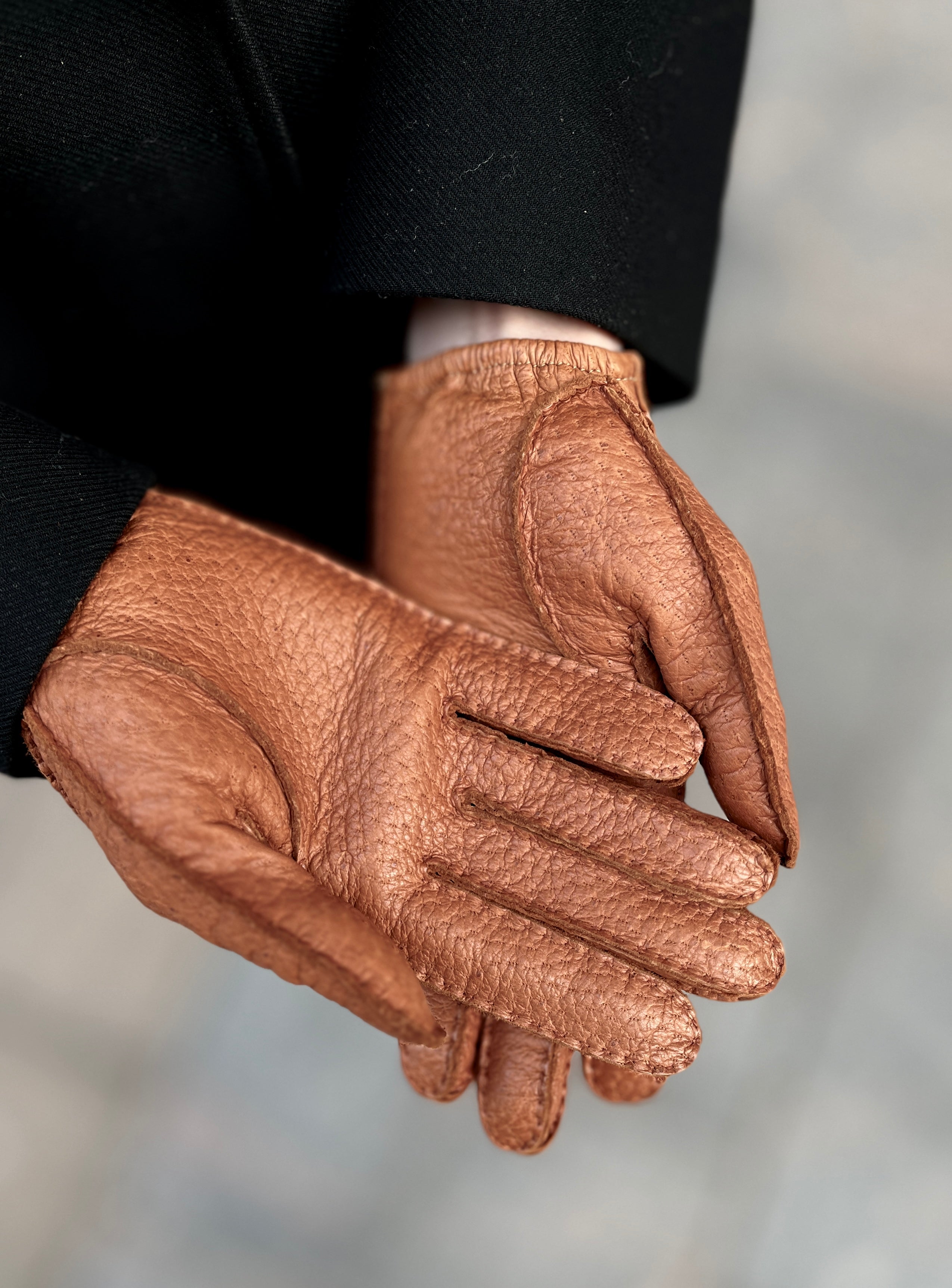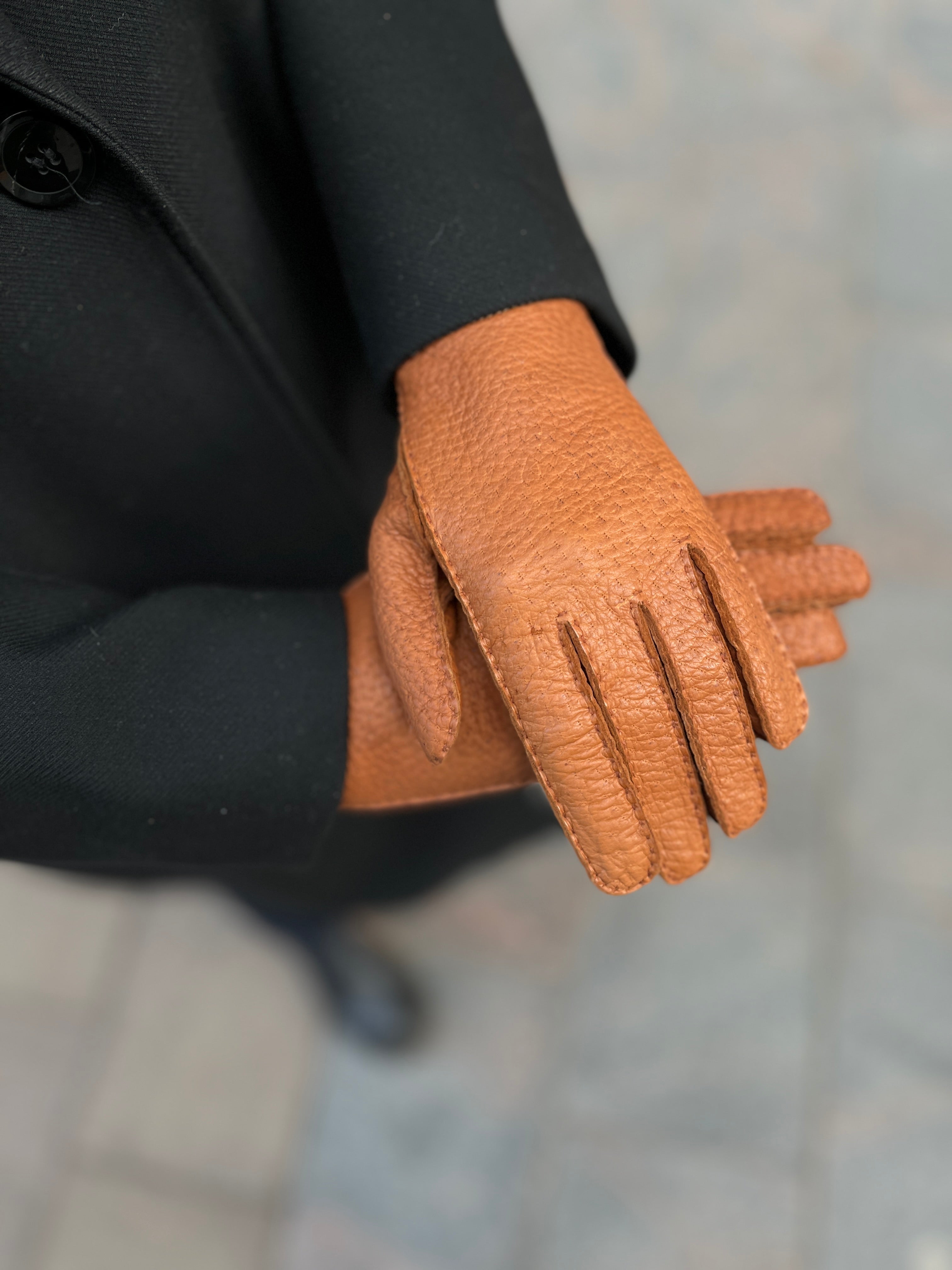 Hienostuneet vuorittoman peccaryhanskat. Kaunis klassinen korkinruskea väri.