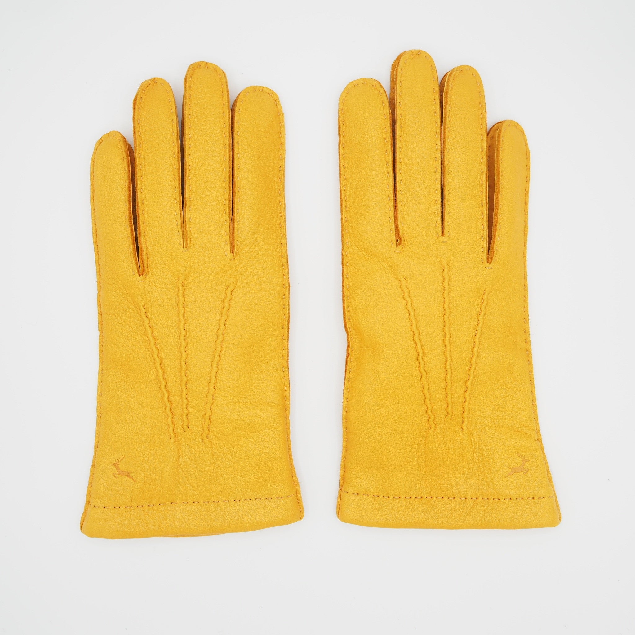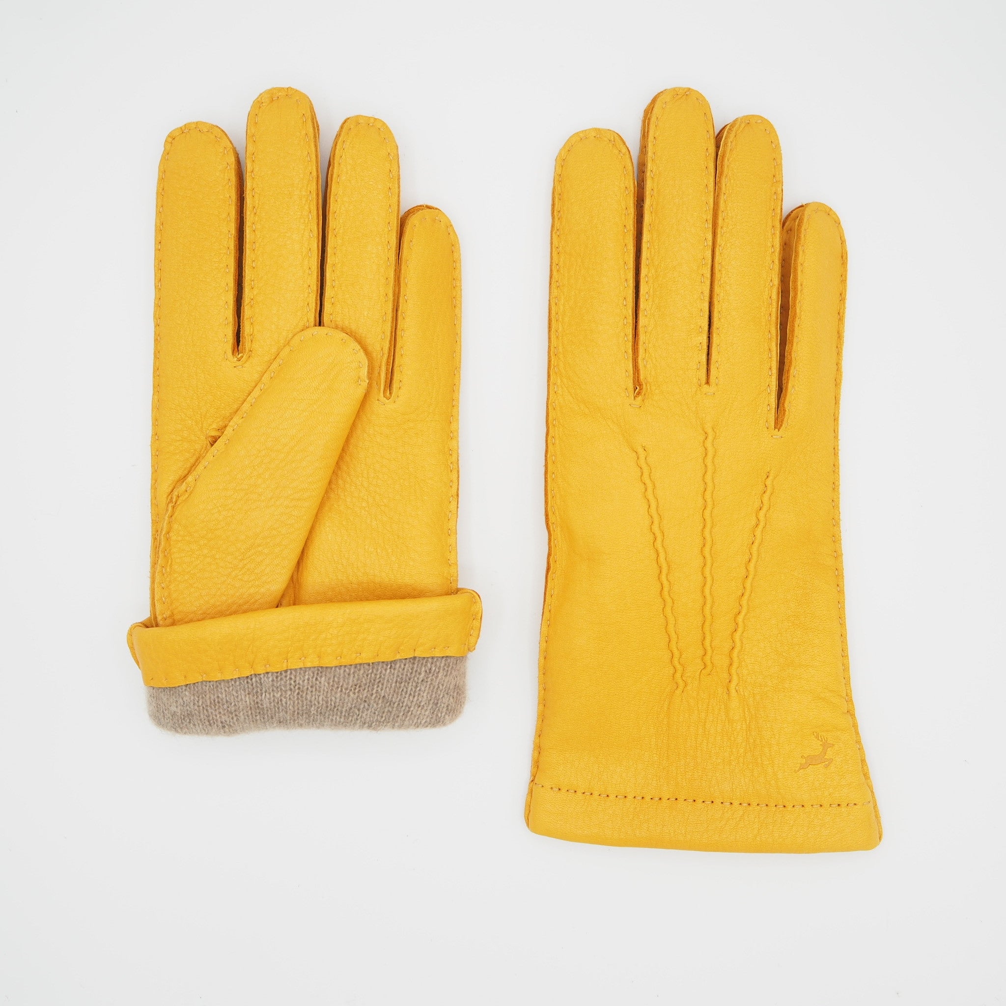 Miesten keltaiset nahkahanskat pehmeästä ja kestävästä peurannahasta. Käsityönä ommellut.