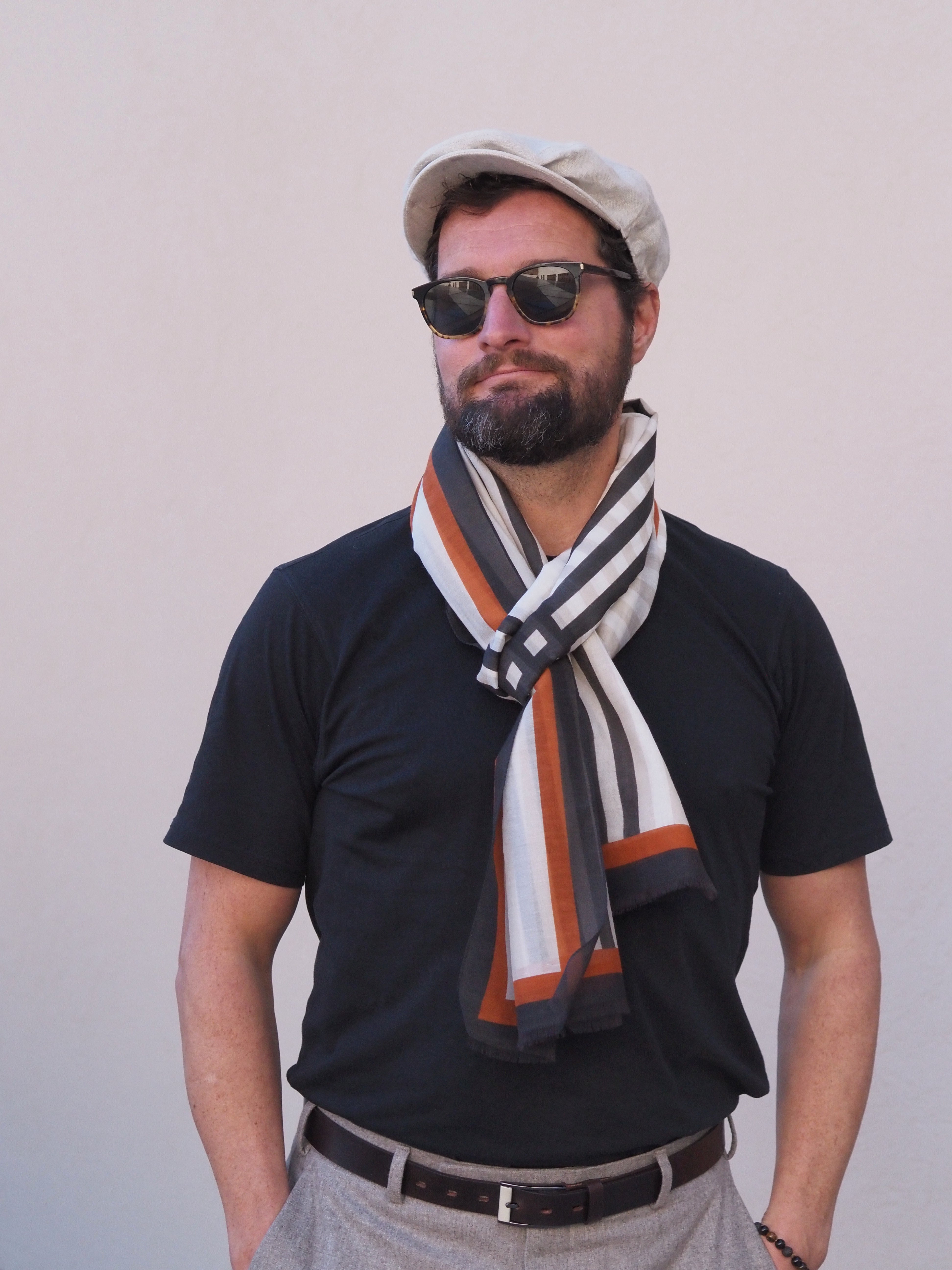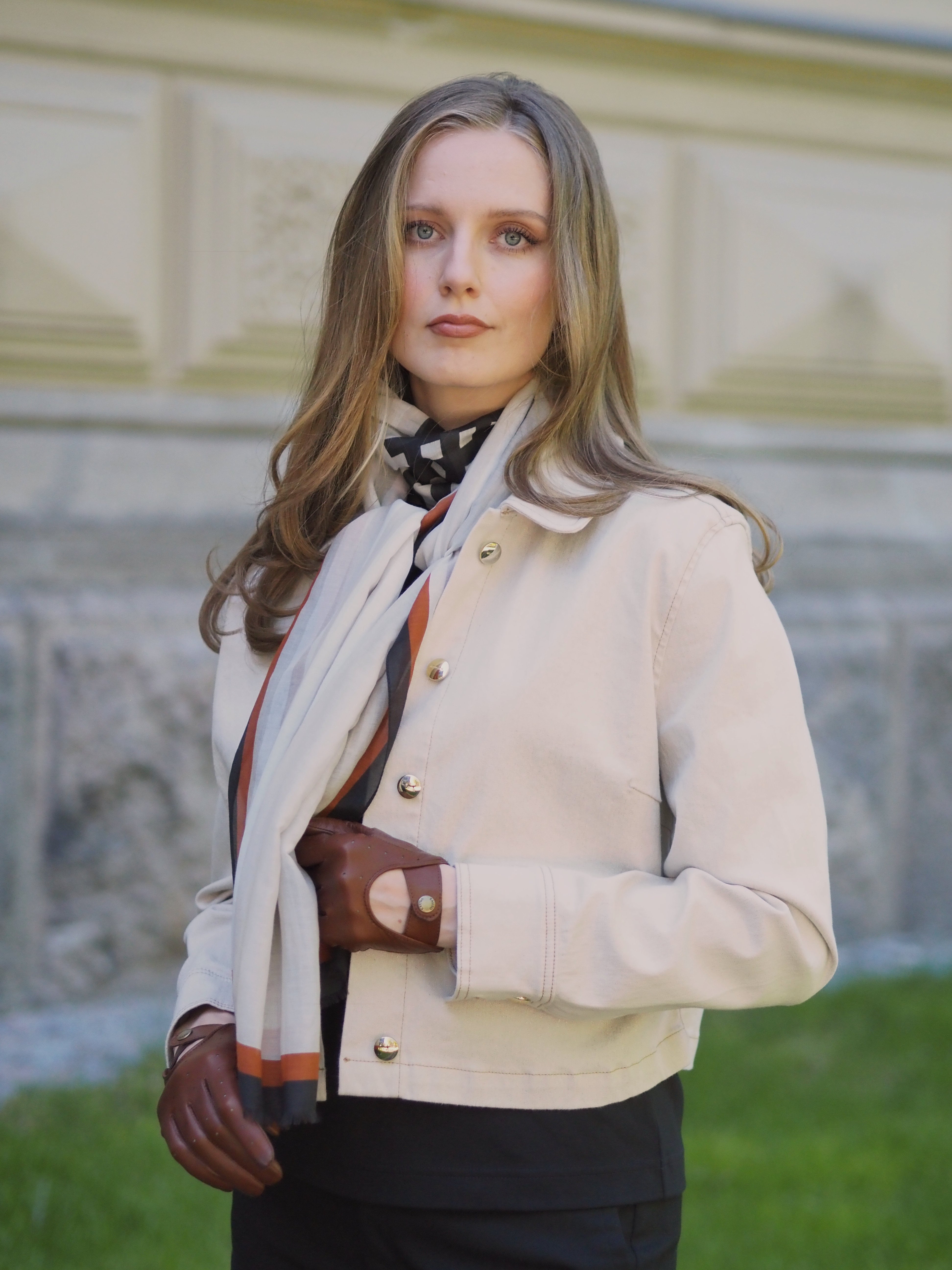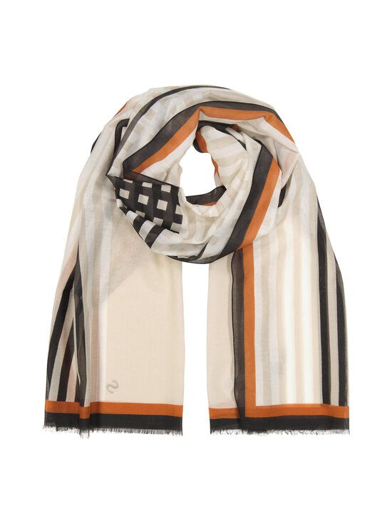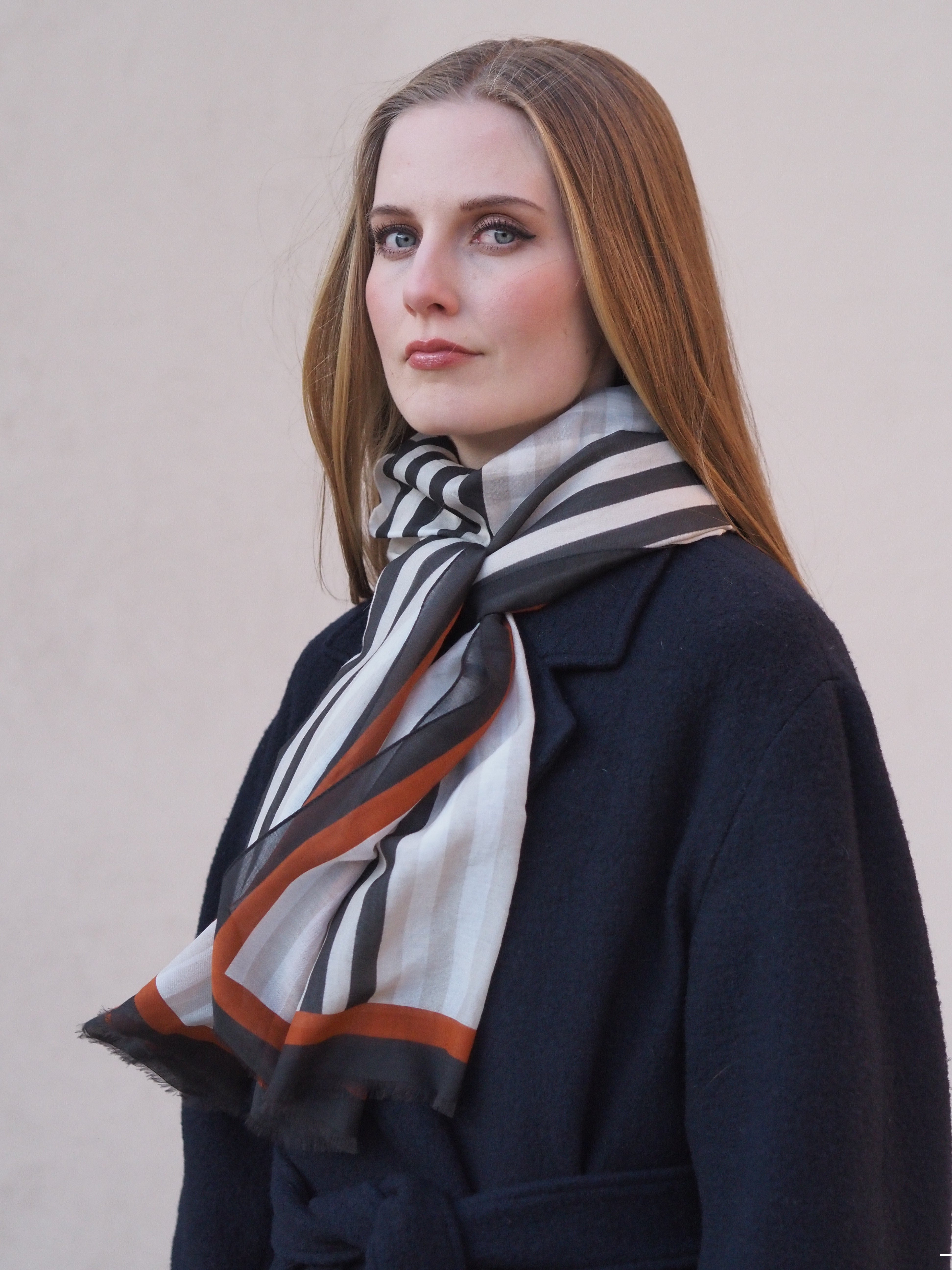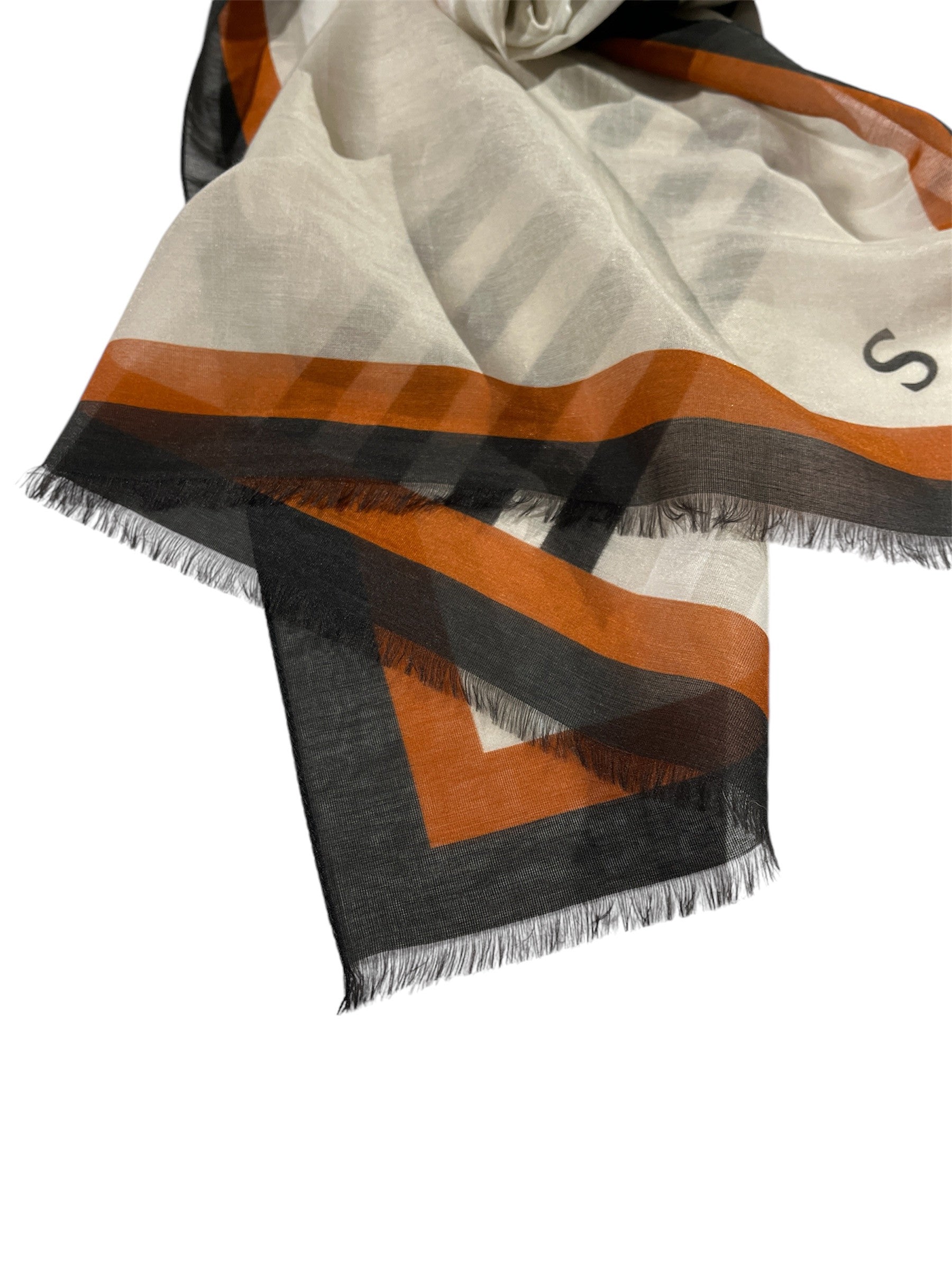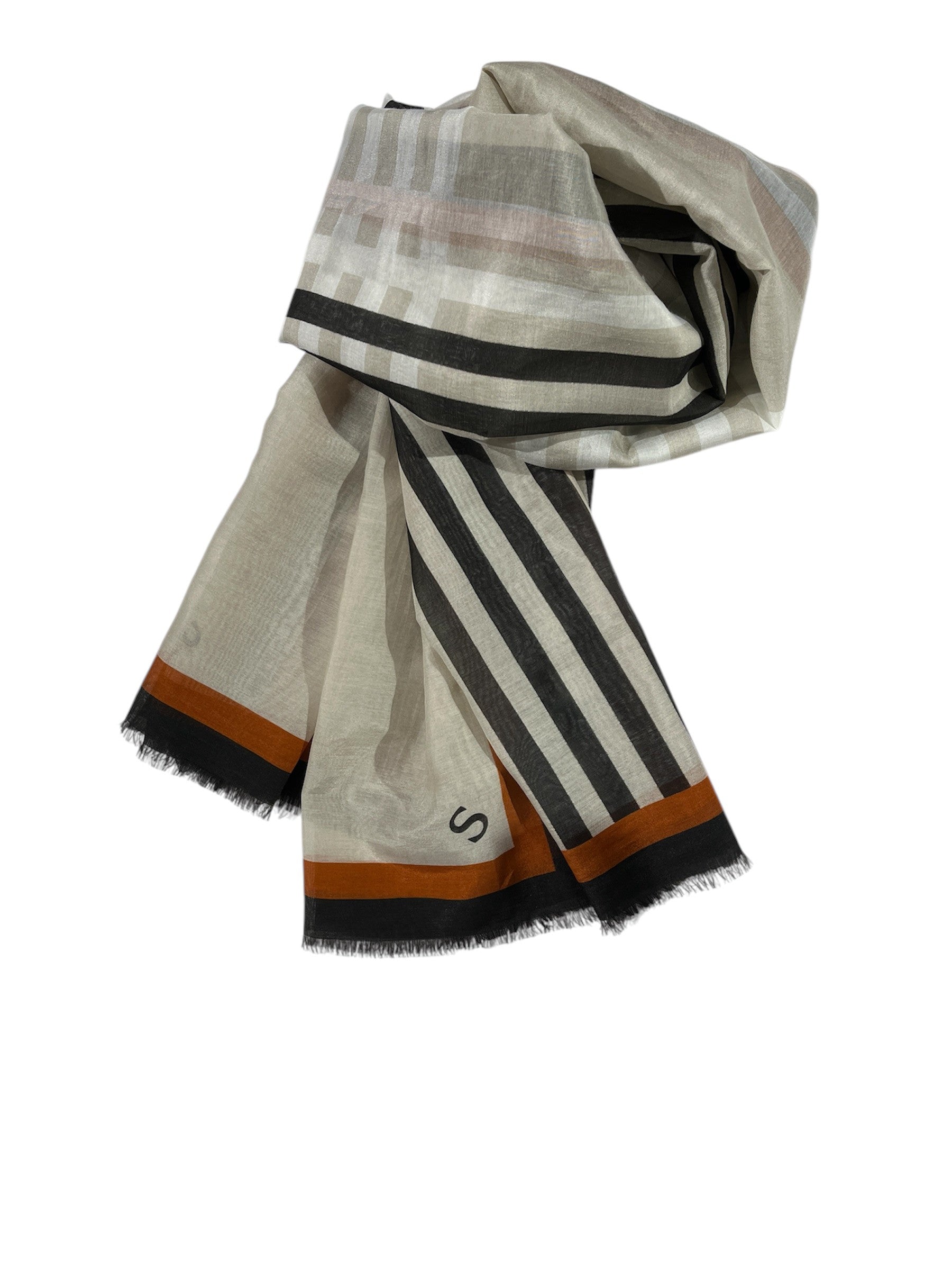 Italiassa tehty unelmaisen kevyt ja pehmeä puuvilla/silkki shaali. Tyylikäs vaalea beige maustettuna mustalla ja valkealla ja klassisella terralla ei mene koskaan pois trendeistä. Ajaton väriyhdistelmä ja koko 70x200cm tekee huivista sopivan asusteen moneen vuoden aikaan ja erilaisiin käyttötilanteisiin. Unisex huivi sopii niin trenssin, farkkutakin, kuin nahkatakinkin kanssa tai neuletta tai T-paitaa tyylittämään. Kevyt puuvillan ja silkin sekoitus tekee kankaasta muokkautuvan ja tarvittaessa vähän tilaa vievän. Huivin saa mainiosti esimerkiksi trenssi takin kauluksen sisäpuolelle antamaan suojaa tuulelta ja viimalta.