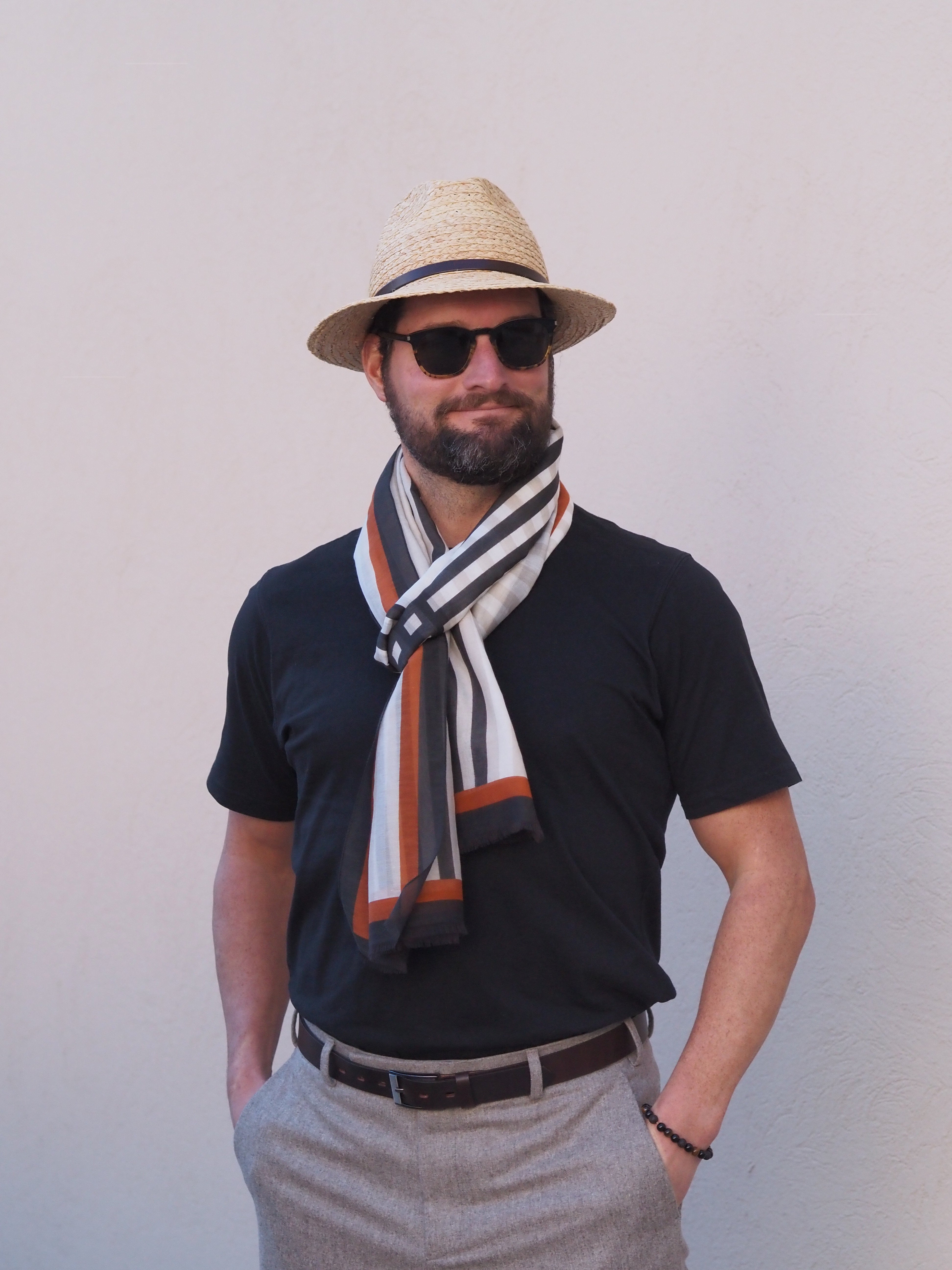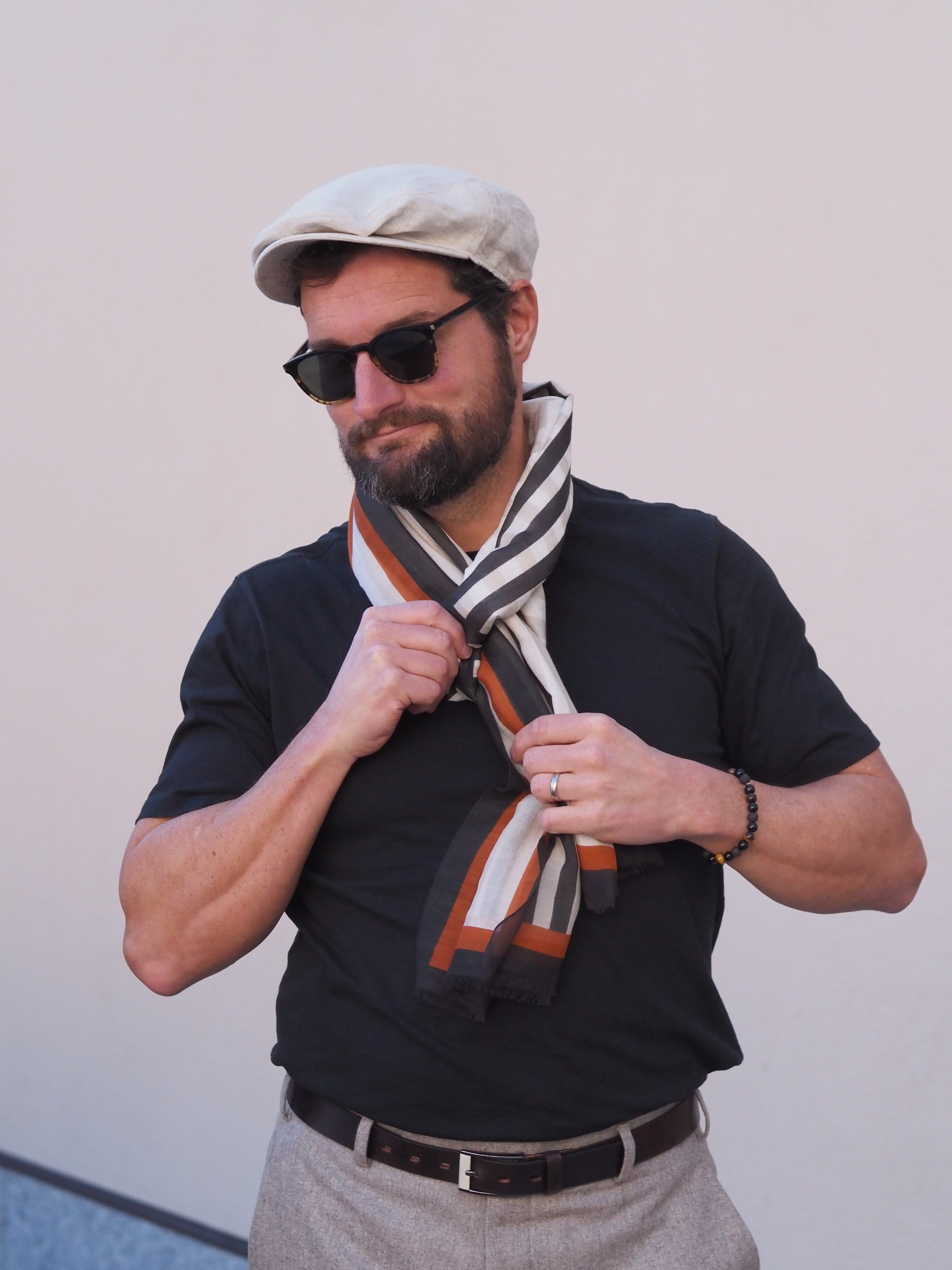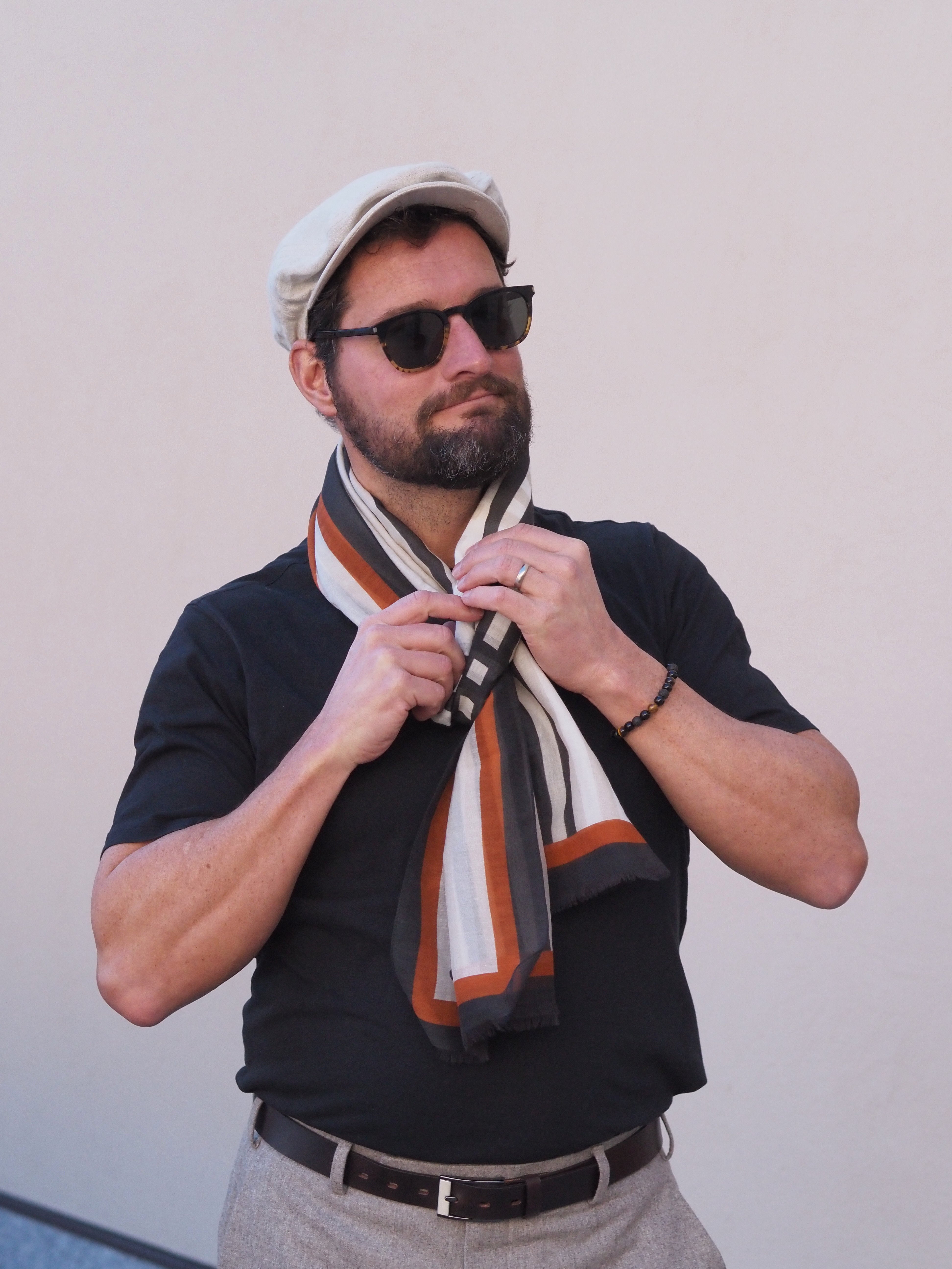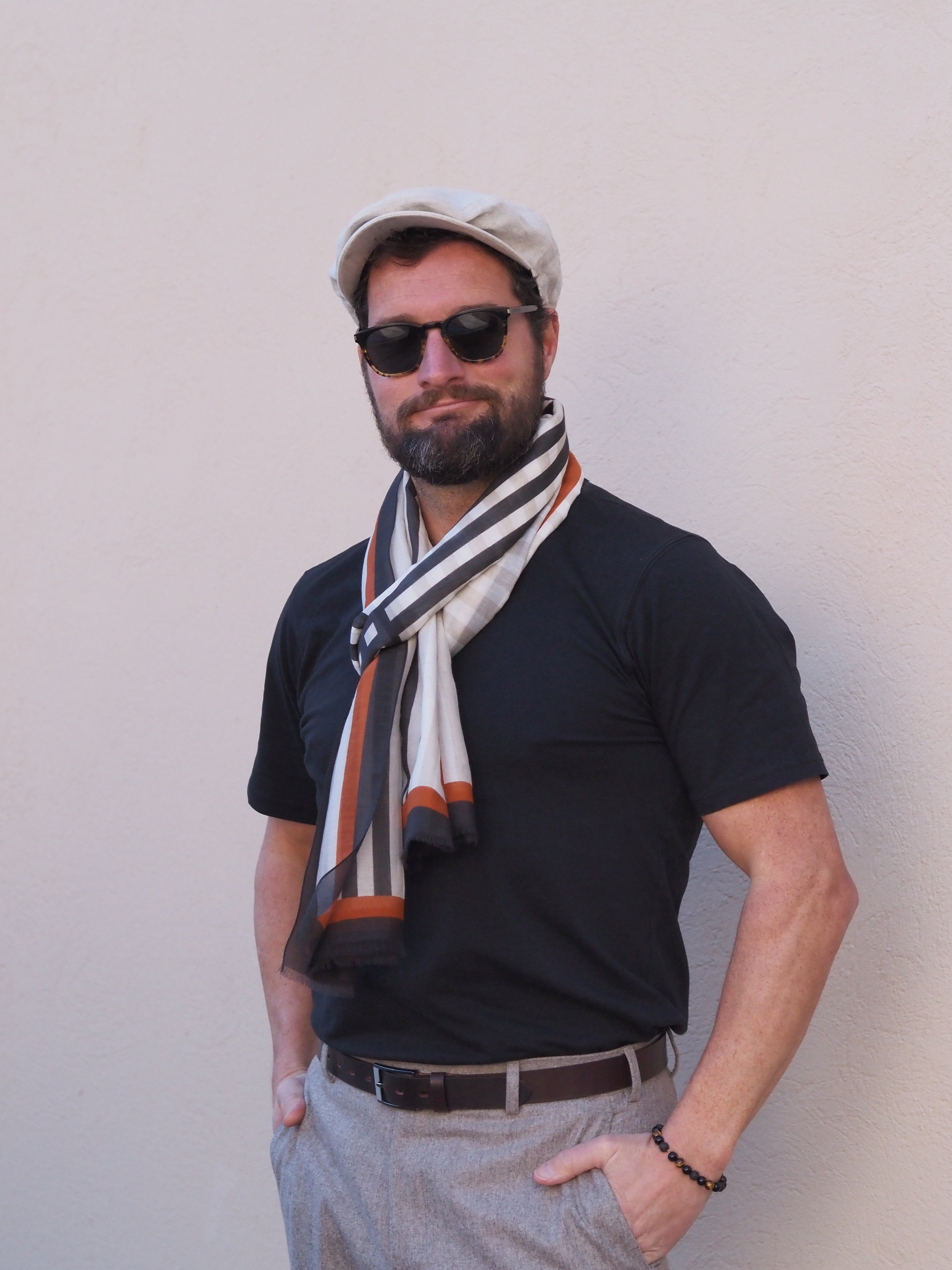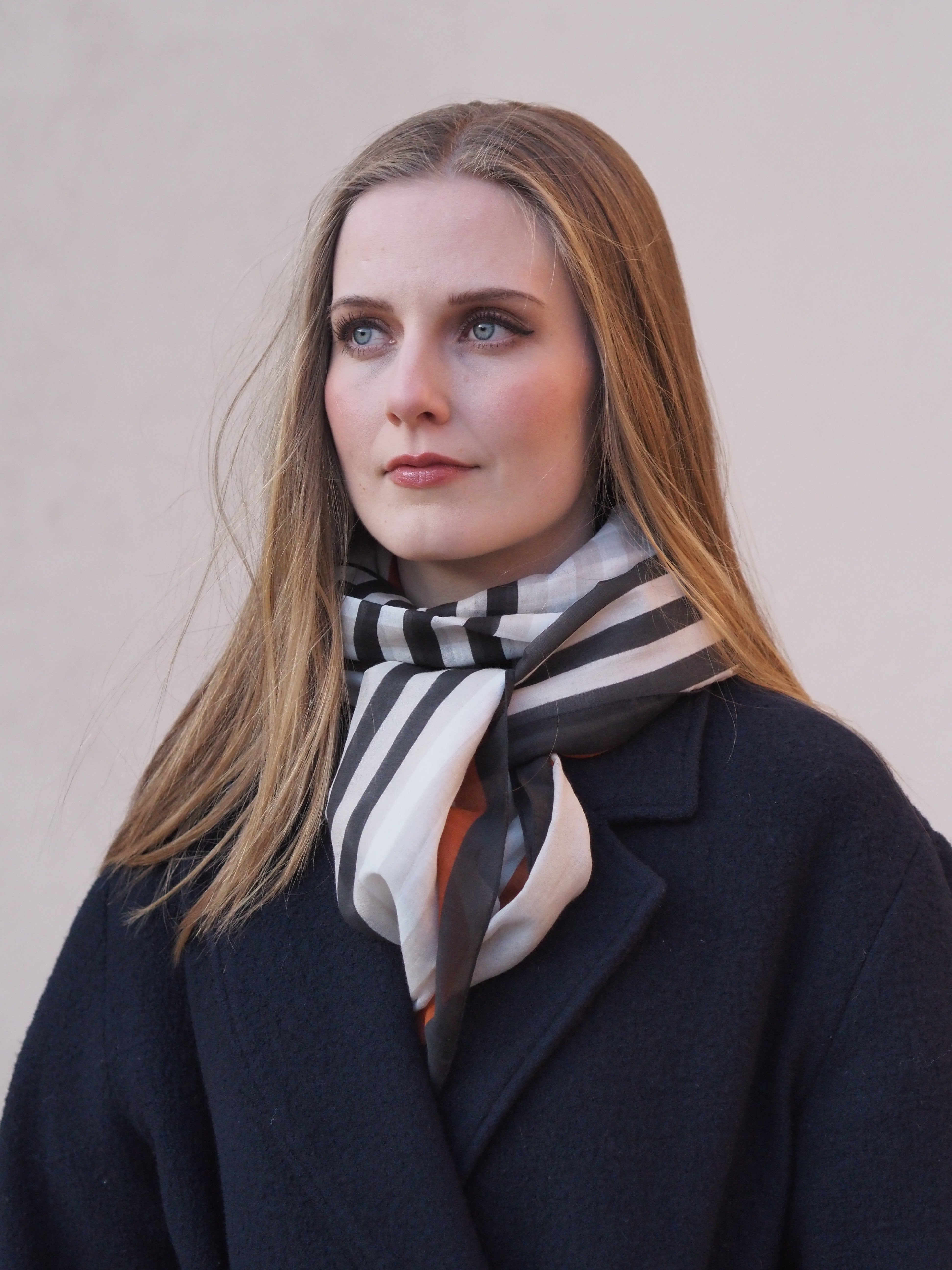Italiassa tehty unelmaisen kevyt ja pehmeä puuvilla/silkki shaali. Tyylikäs vaalea beige maustettuna mustalla ja valkealla ja klassisella terralla ei mene koskaan pois trendeistä. Ajaton väriyhdistelmä ja koko 70x200cm tekee huivista sopivan asusteen moneen vuoden aikaan ja erilaisiin käyttötilanteisiin. Unisex huivi sopii niin trenssin, farkkutakin, kuin nahkatakinkin kanssa tai neuletta tai T-paitaa tyylittämään. Kevyt puuvillan ja silkin sekoitus tekee kankaasta muokkautuvan ja tarvittaessa vähän tilaa vievän. Huivin saa mainiosti esimerkiksi trenssi takin kauluksen sisäpuolelle antamaan suojaa tuulelta ja viimalta.