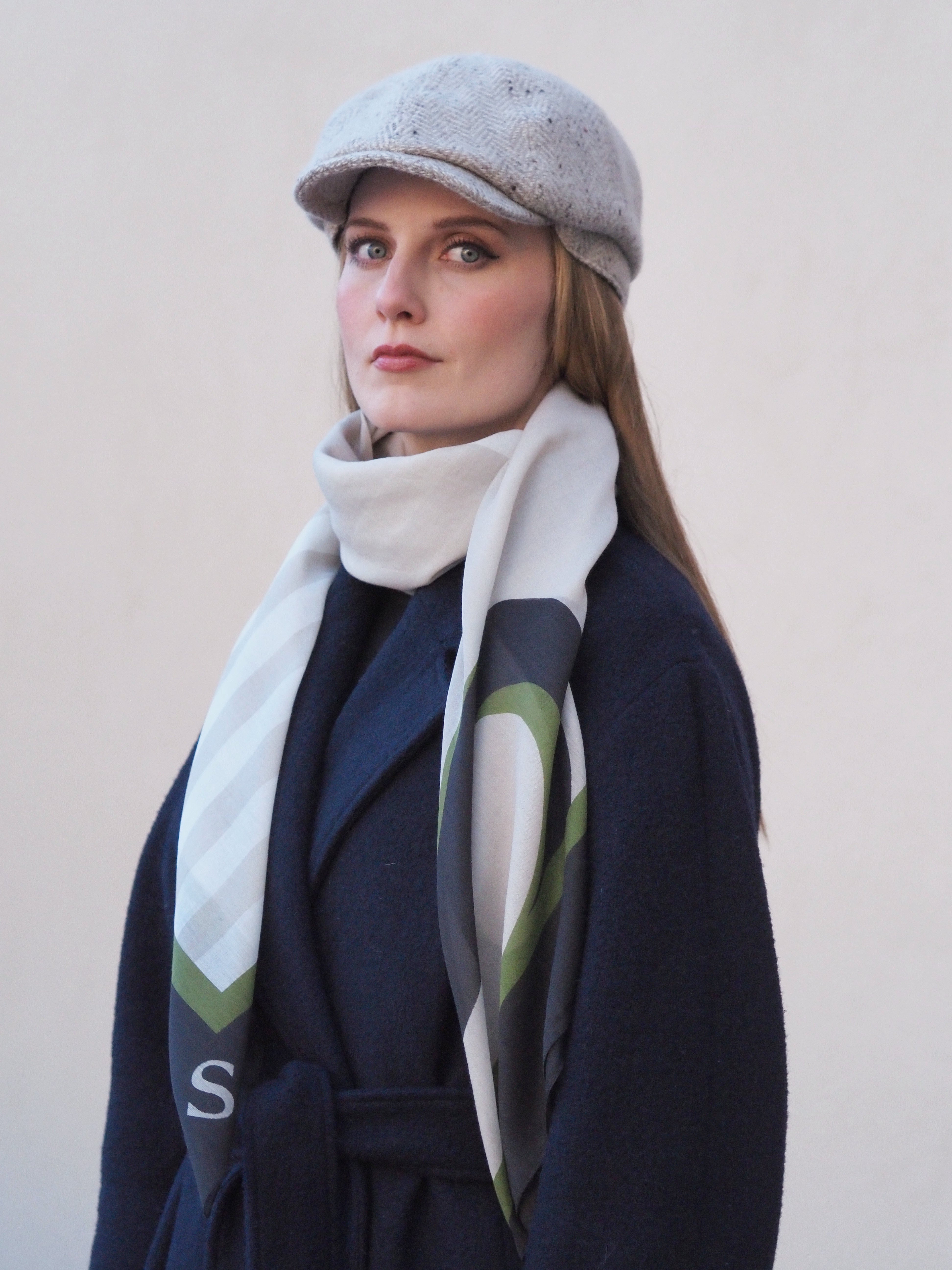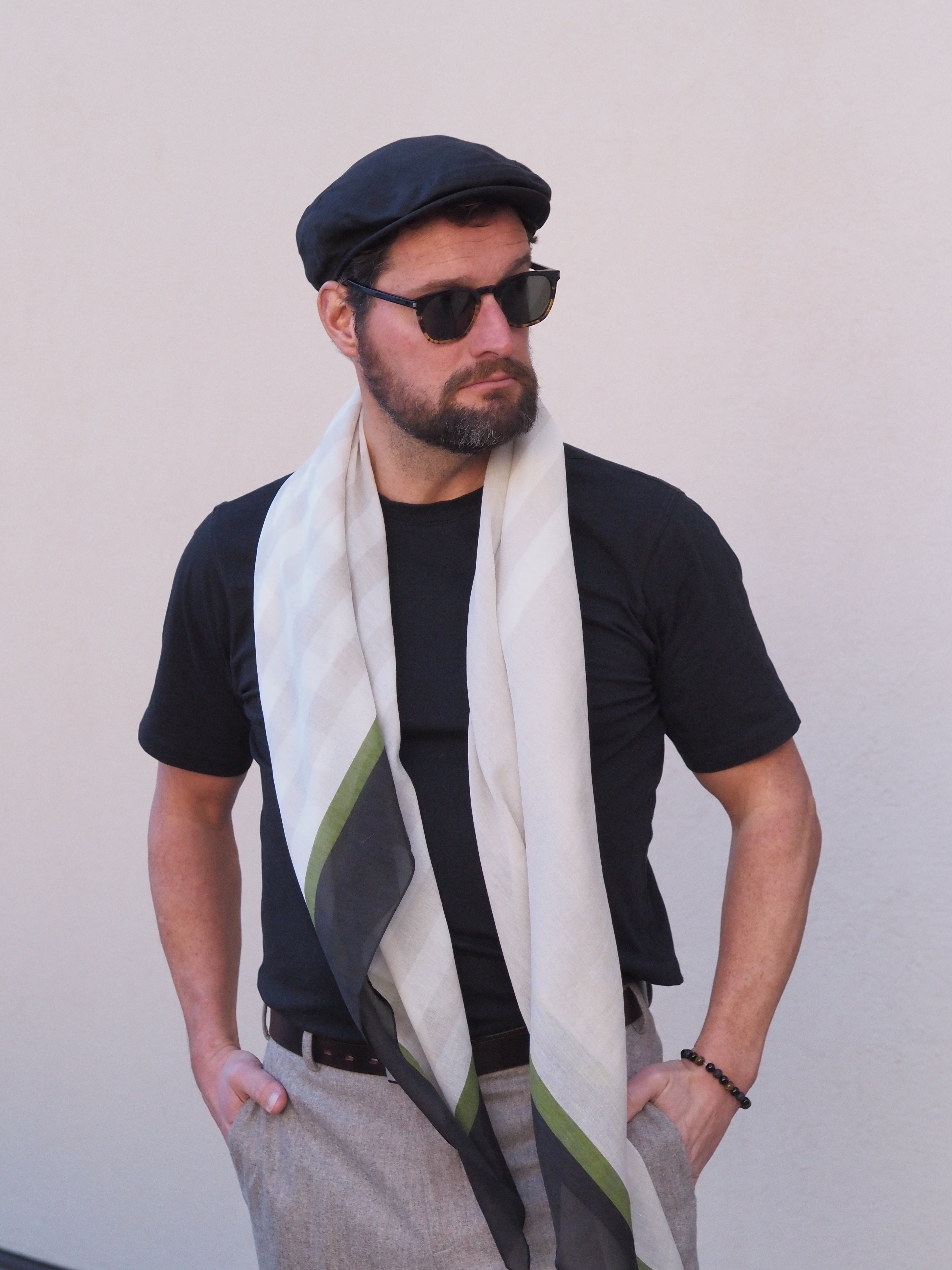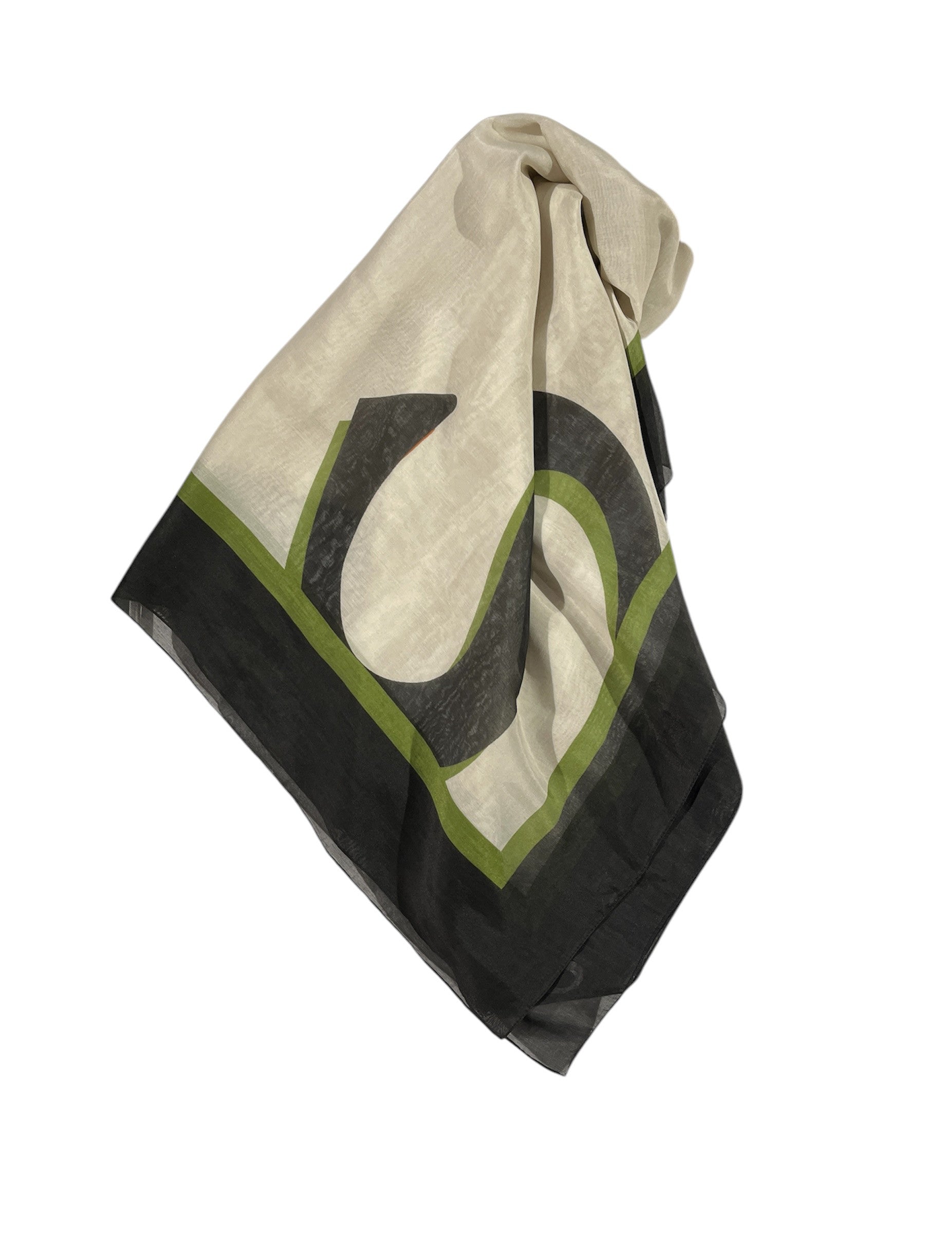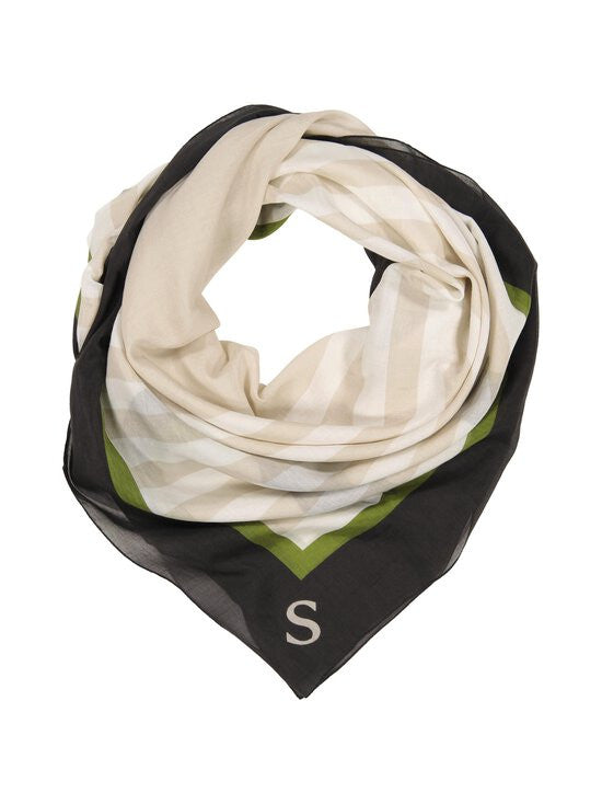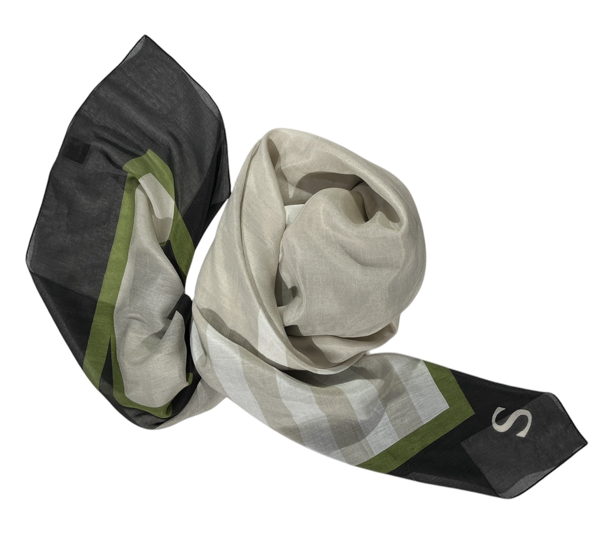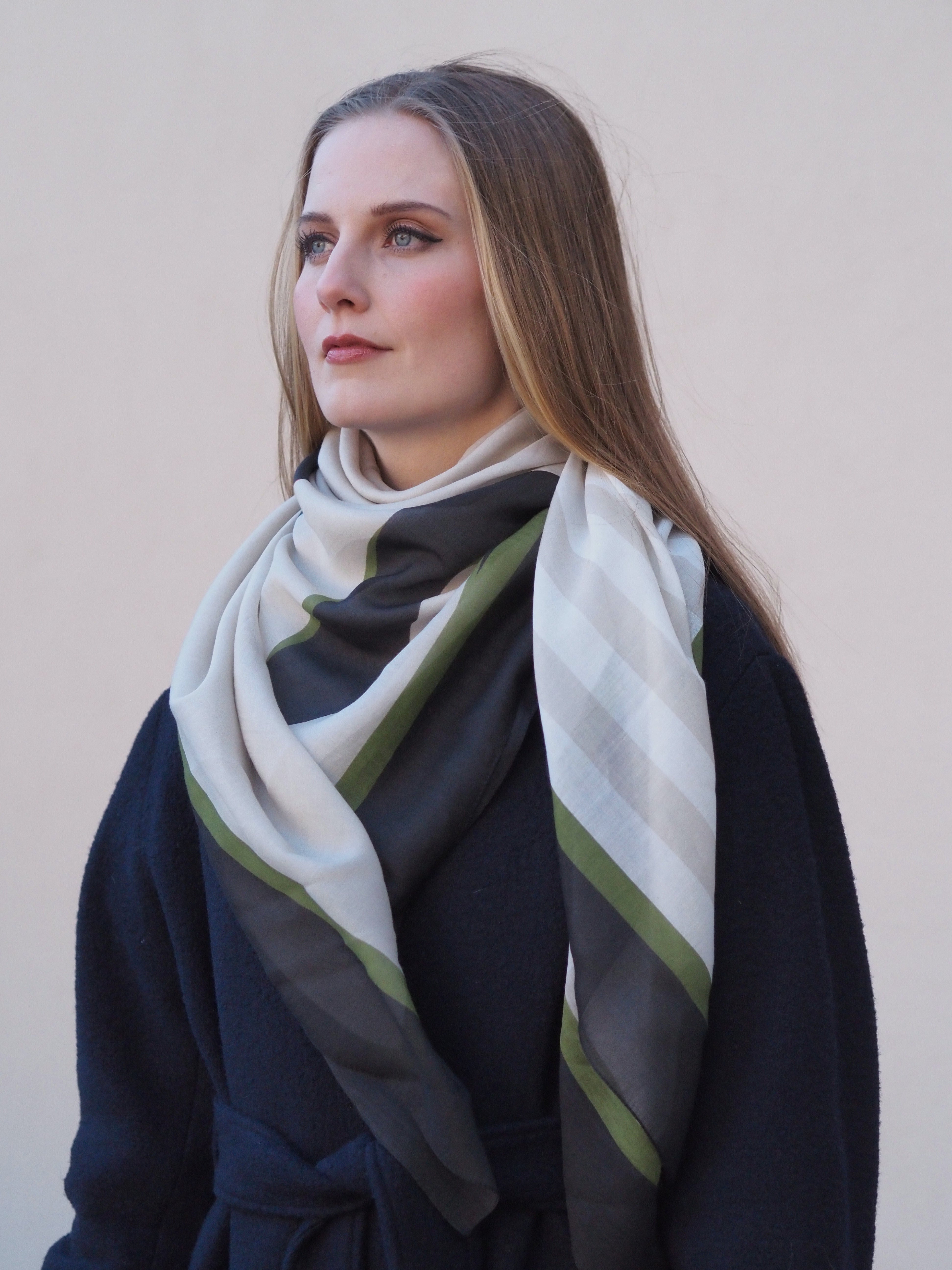 Italiassa valmistettu, unelman kevyt ja laadukas puuvilla/silkki shaali. Tyylikäs vaalean beige pohjaväri tehostettuna mustalla, luonnonvalkoisella ja oliivilla on värikombo, joka ei koskaan jää vanhaksi. Koko 140 x 140cm antaa mahdollisuuden käyttää huivia monella eri tapaa. Kolmioksi taiteltuna tai kapeammaksi, kaulaliinamaiseksi taiteltuna. Valitse ja vaihda solminta ja käyttötapaa tarpeidesi ja muun vaatetuksen mukaan. Huivissa eri kulmat näyttävät erilaisia kuvioita. Saat siis esiin yksivärisyyttä, hentoa raitaa tai mustaa ja oliivia esiin makusi mukaan. Huivi peittää paahteella niskan ja hartiat, mutta viimalla se suojaa kaulan ja rinnan alueen. Myös pareoksi tai topiksi huivin voi solmia vaikka bikineiden tai shortsien kanssa.