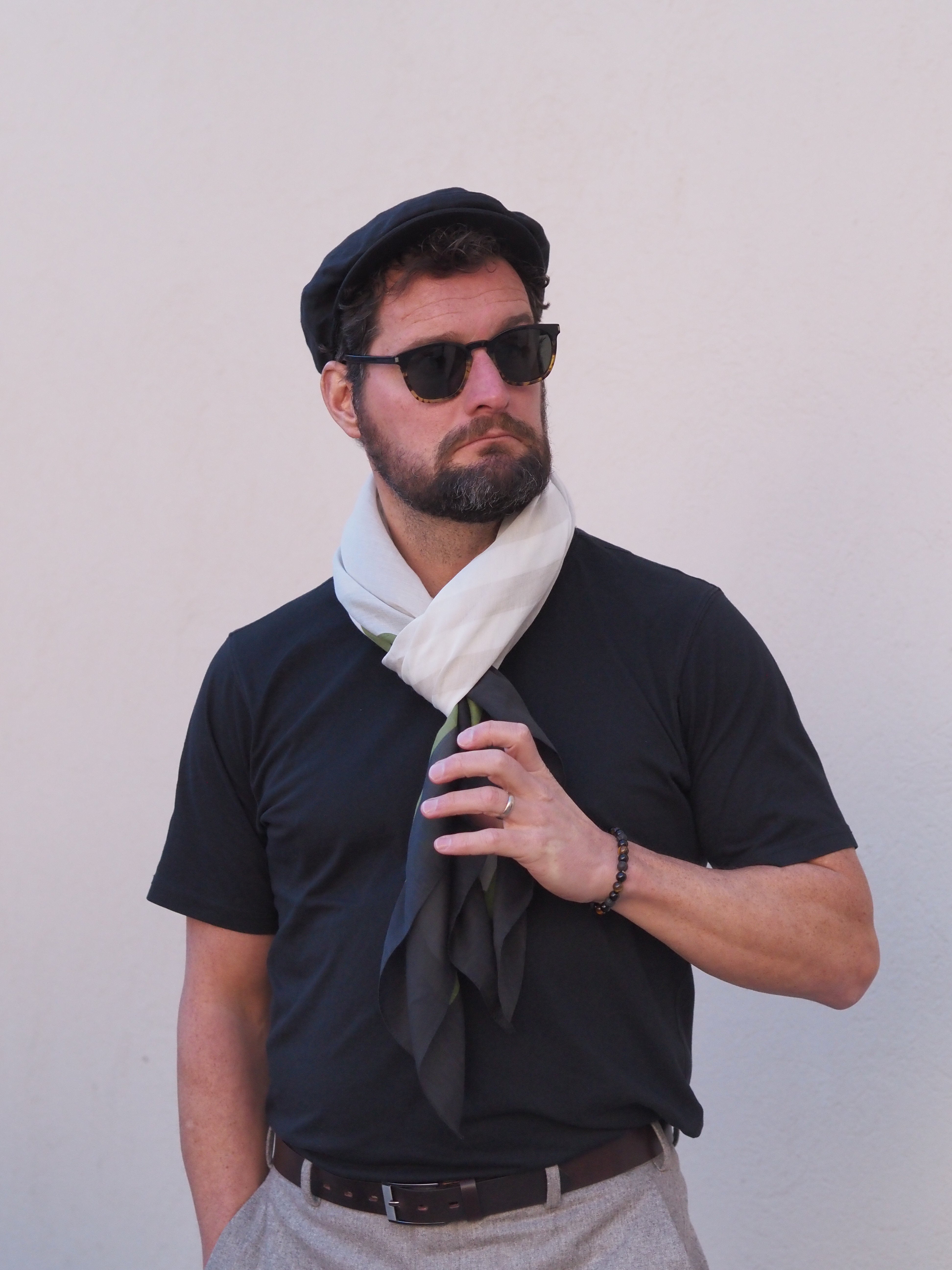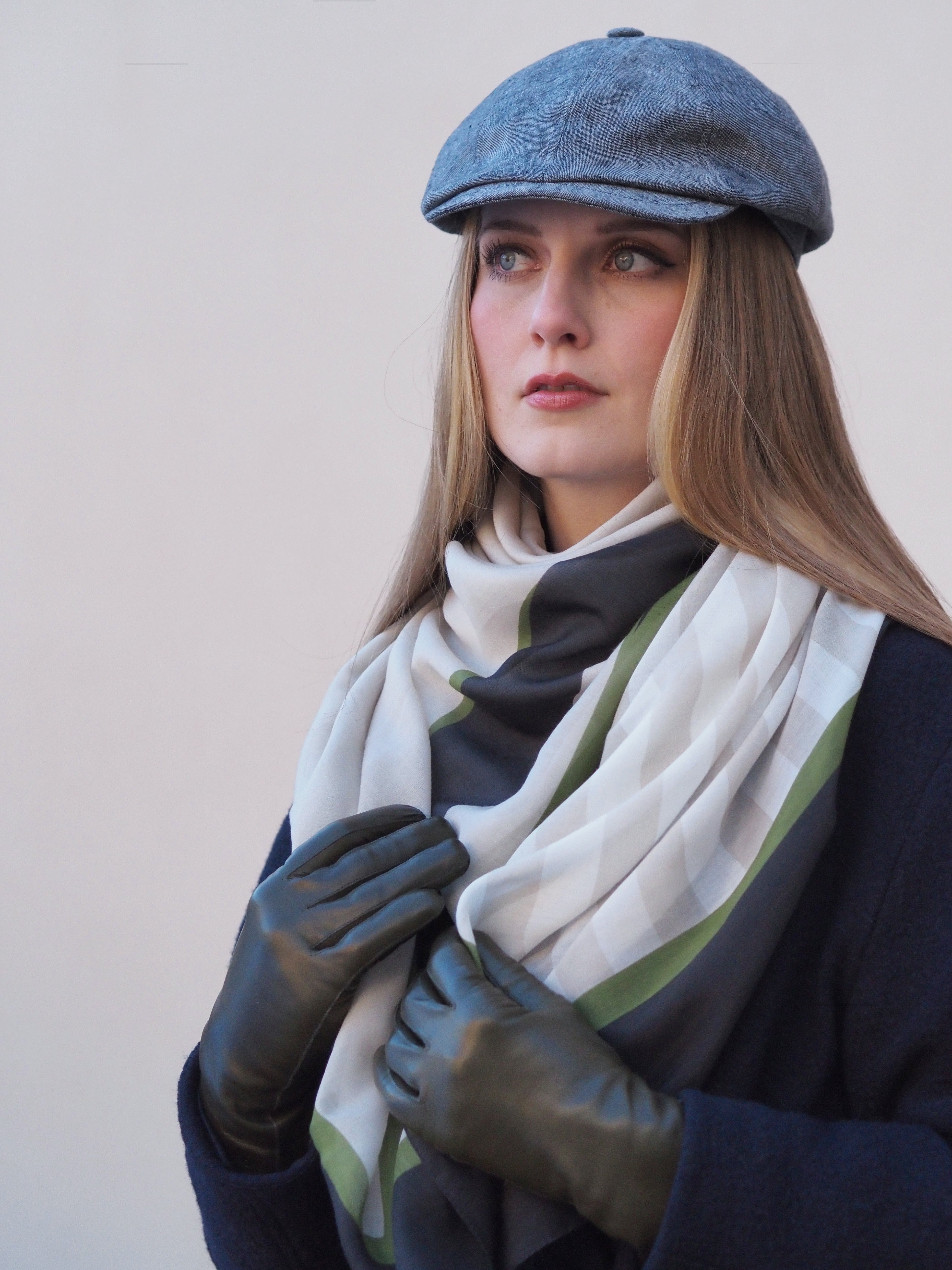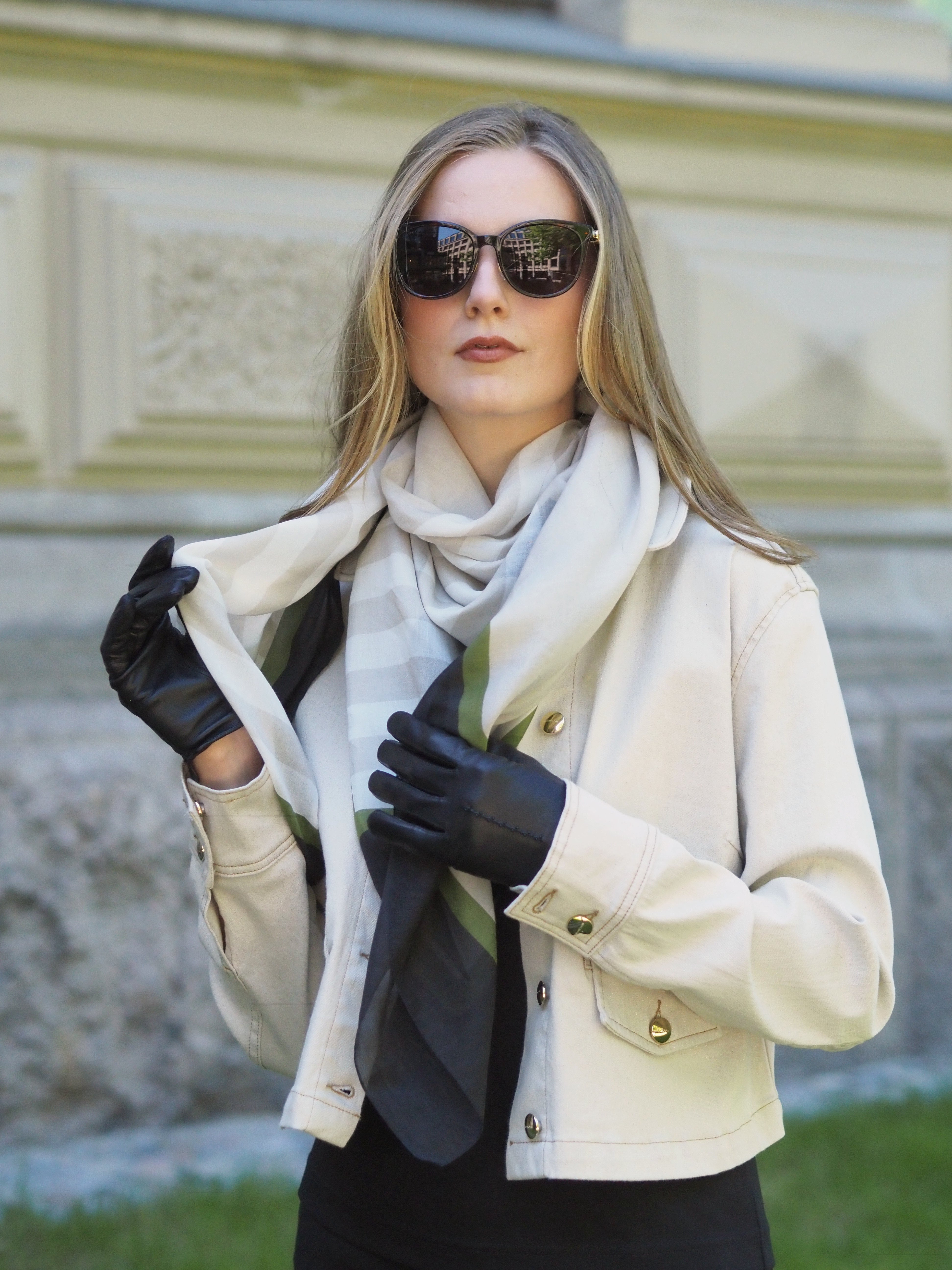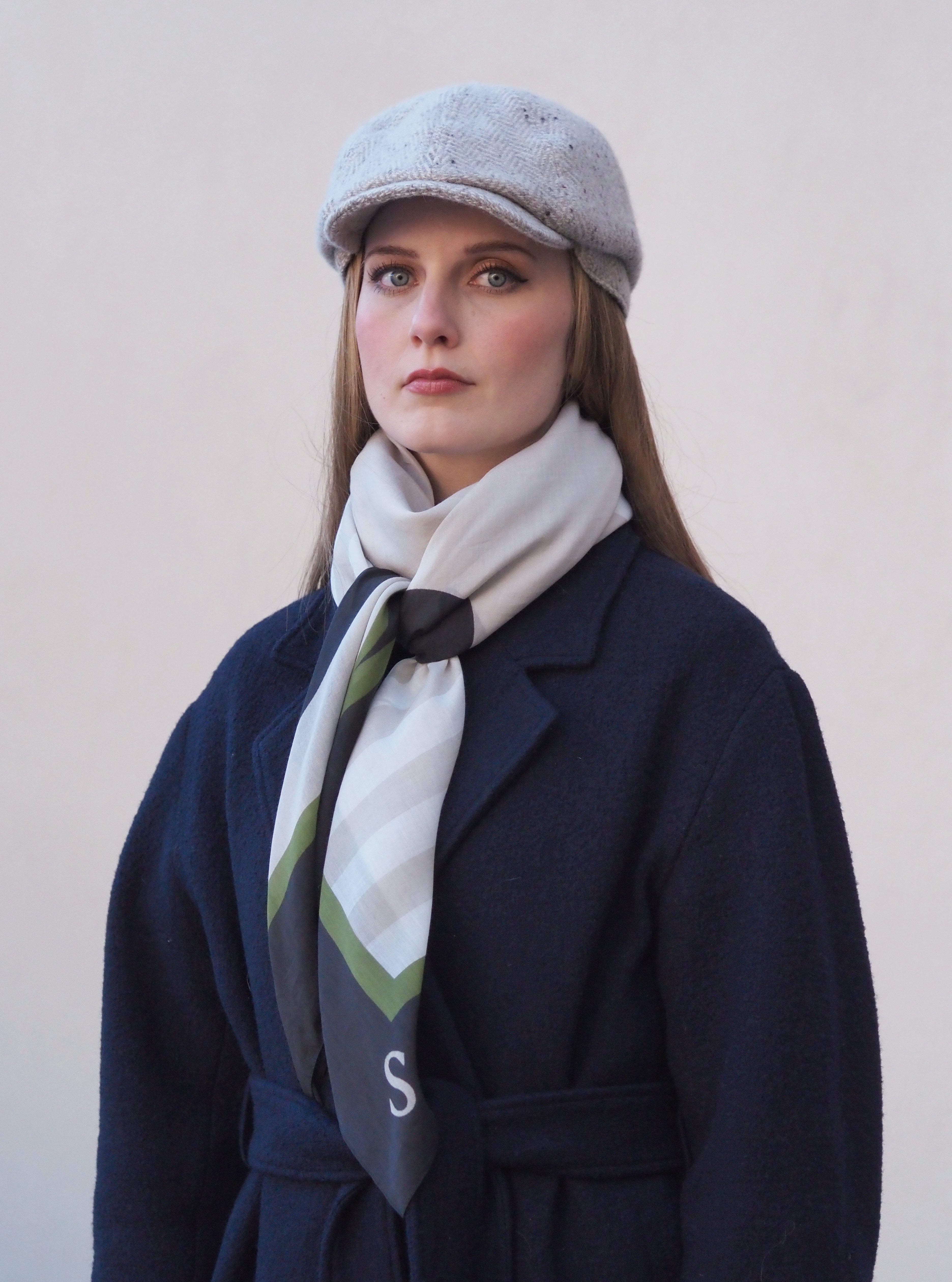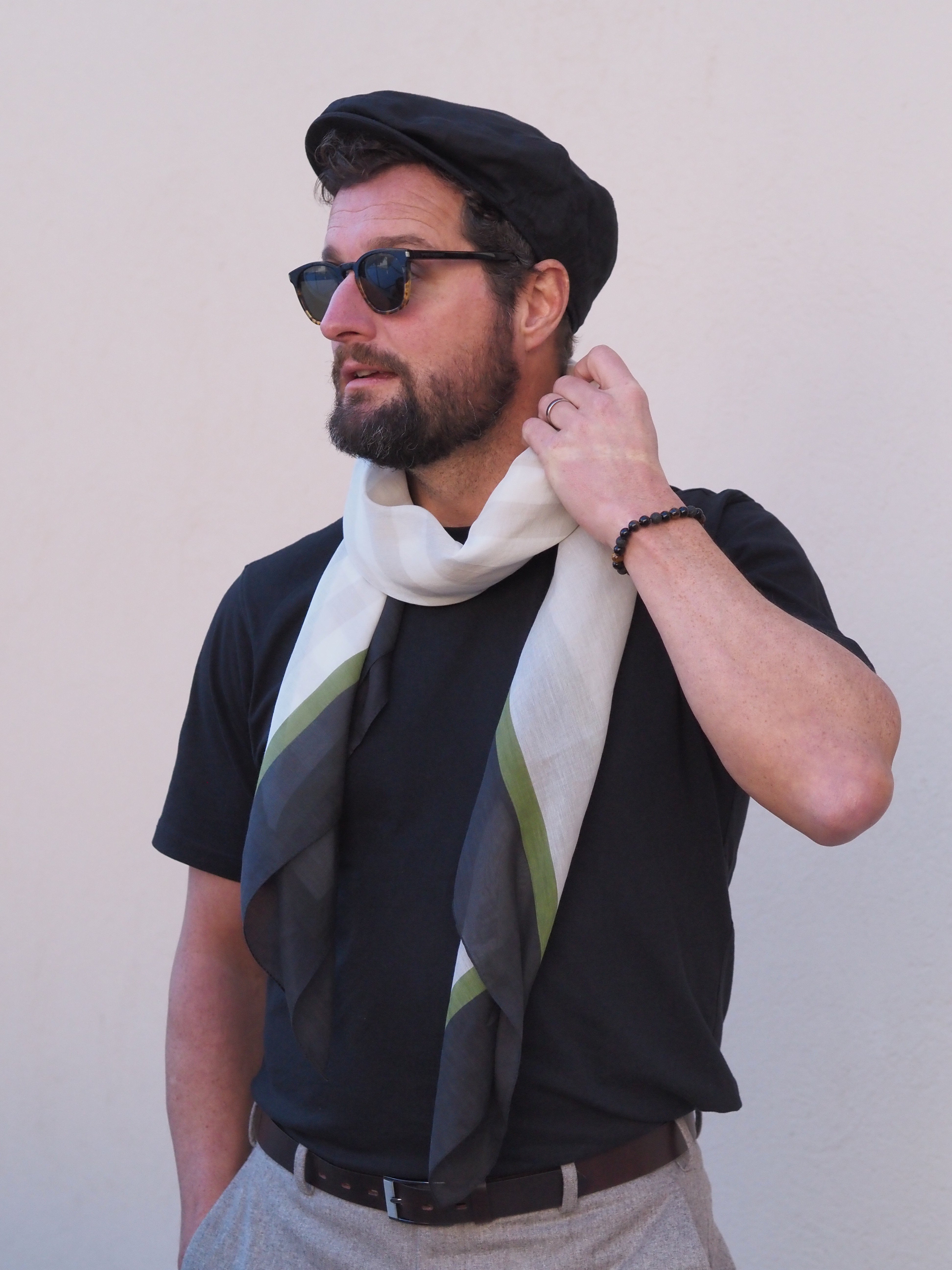 Italiassa valmistettu, unelman kevyt ja laadukas puuvilla/silkki shaali. Tyylikäs vaalean beige pohjaväri tehostettuna mustalla, luonnonvalkoisella ja oliivilla on värikombo, joka ei koskaan jää vanhaksi. Koko 140 x 140cm antaa mahdollisuuden käyttää huivia monella eri tapaa. Kolmioksi taiteltuna tai kapeammaksi, kaulaliinamaiseksi taiteltuna. Valitse ja vaihda solminta ja käyttötapaa tarpeidesi ja muun vaatetuksen mukaan. Huivissa eri kulmat näyttävät erilaisia kuvioita. Saat siis esiin yksivärisyyttä, hentoa raitaa tai mustaa ja oliivia esiin makusi mukaan. Huivi peittää paahteella niskan ja hartiat, mutta viimalla se suojaa kaulan ja rinnan alueen. Myös pareoksi tai topiksi huivin voi solmia vaikka bikineiden tai shortsien kanssa.