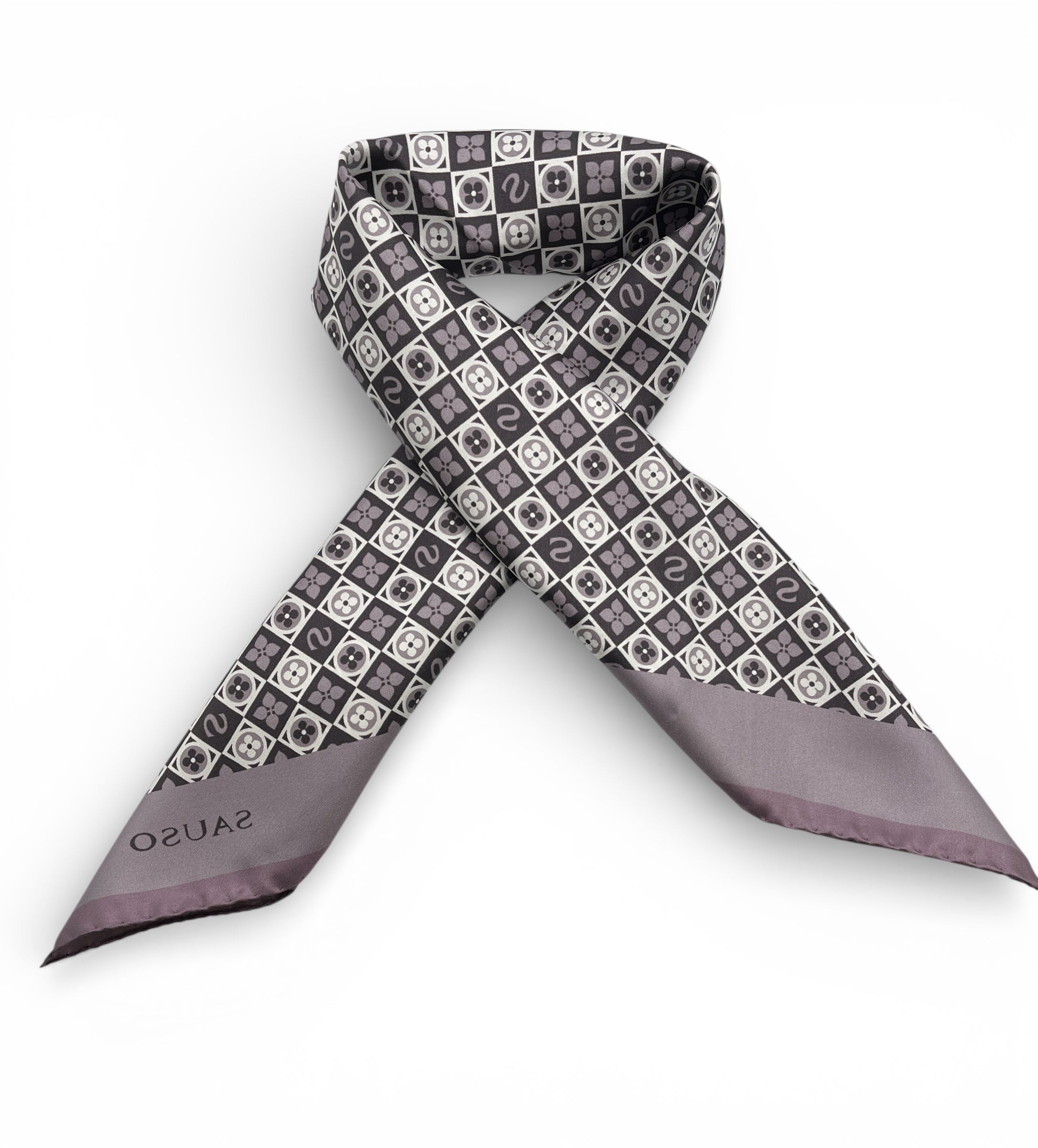 - Klassinen silkkihuivi, jossa hienovarainen kuviointi.