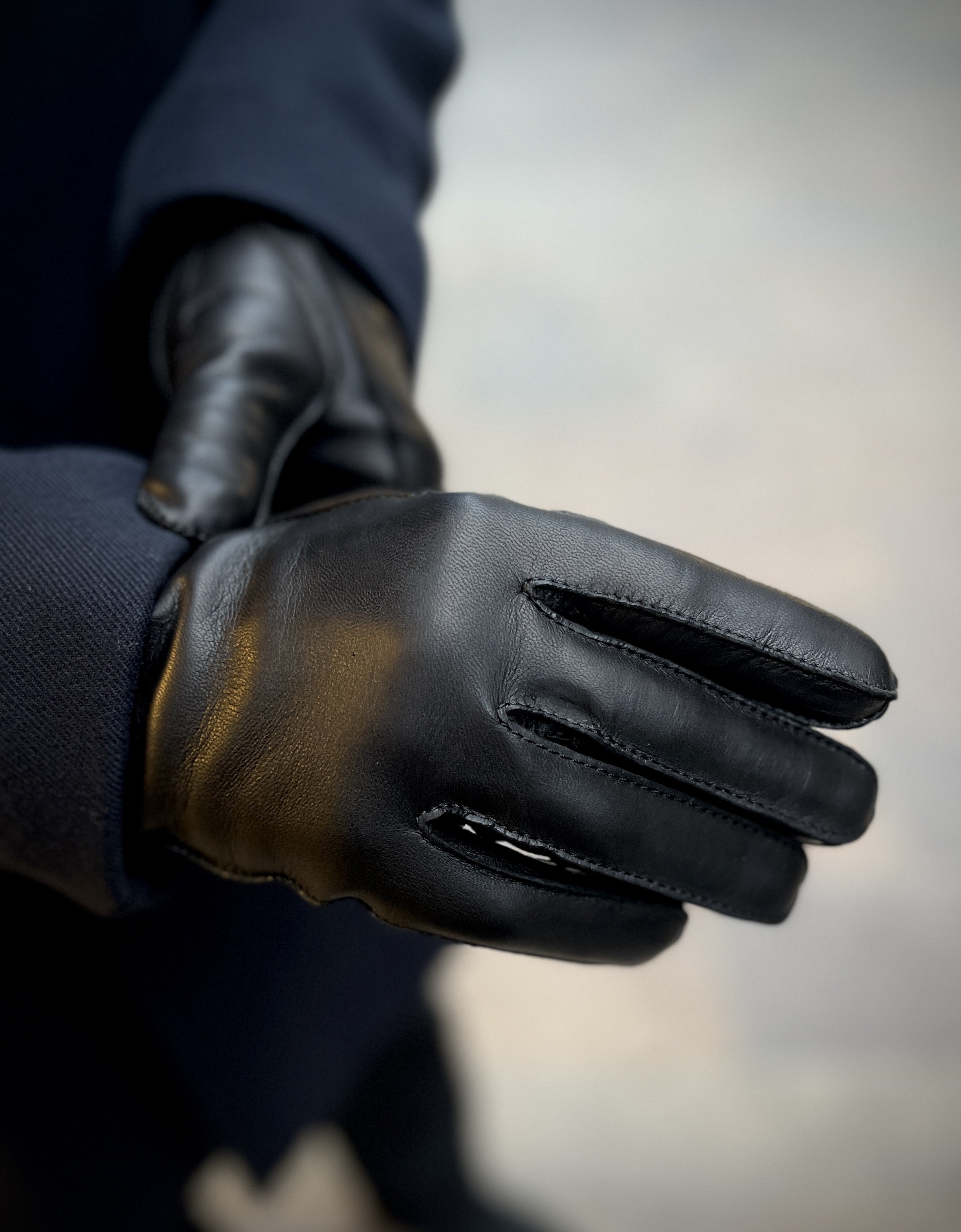 Mustat lammasnappa käsineet. Sporttinen ja sormille tilaa antava vastasauma. Sileä päälliosa ja rannekuminauha. 100% villavuori. Hieman lyhyempi 1,6 tuuman varsi, joka antaa tilaa paidan ja takin hihalle ja kellolle.