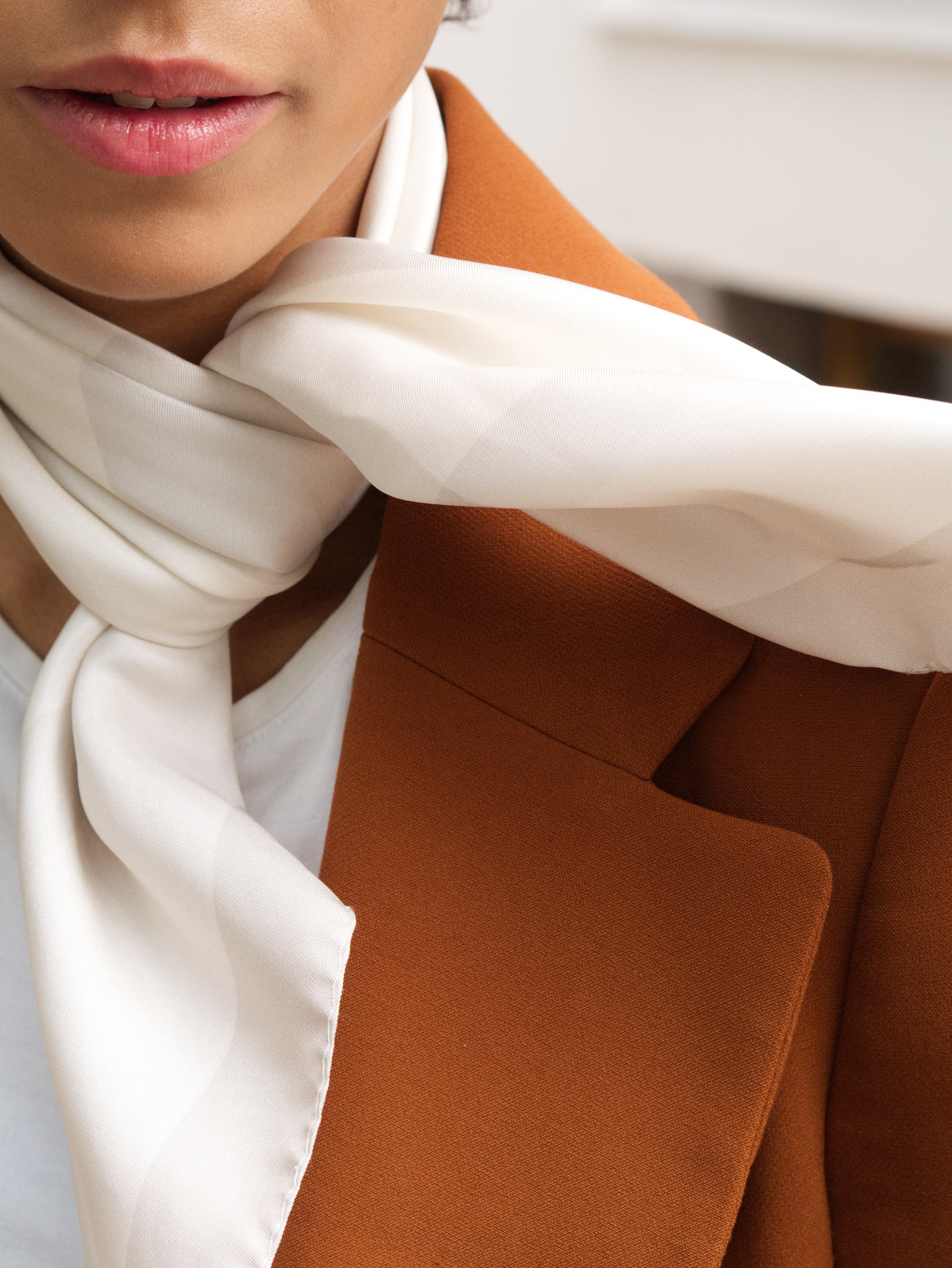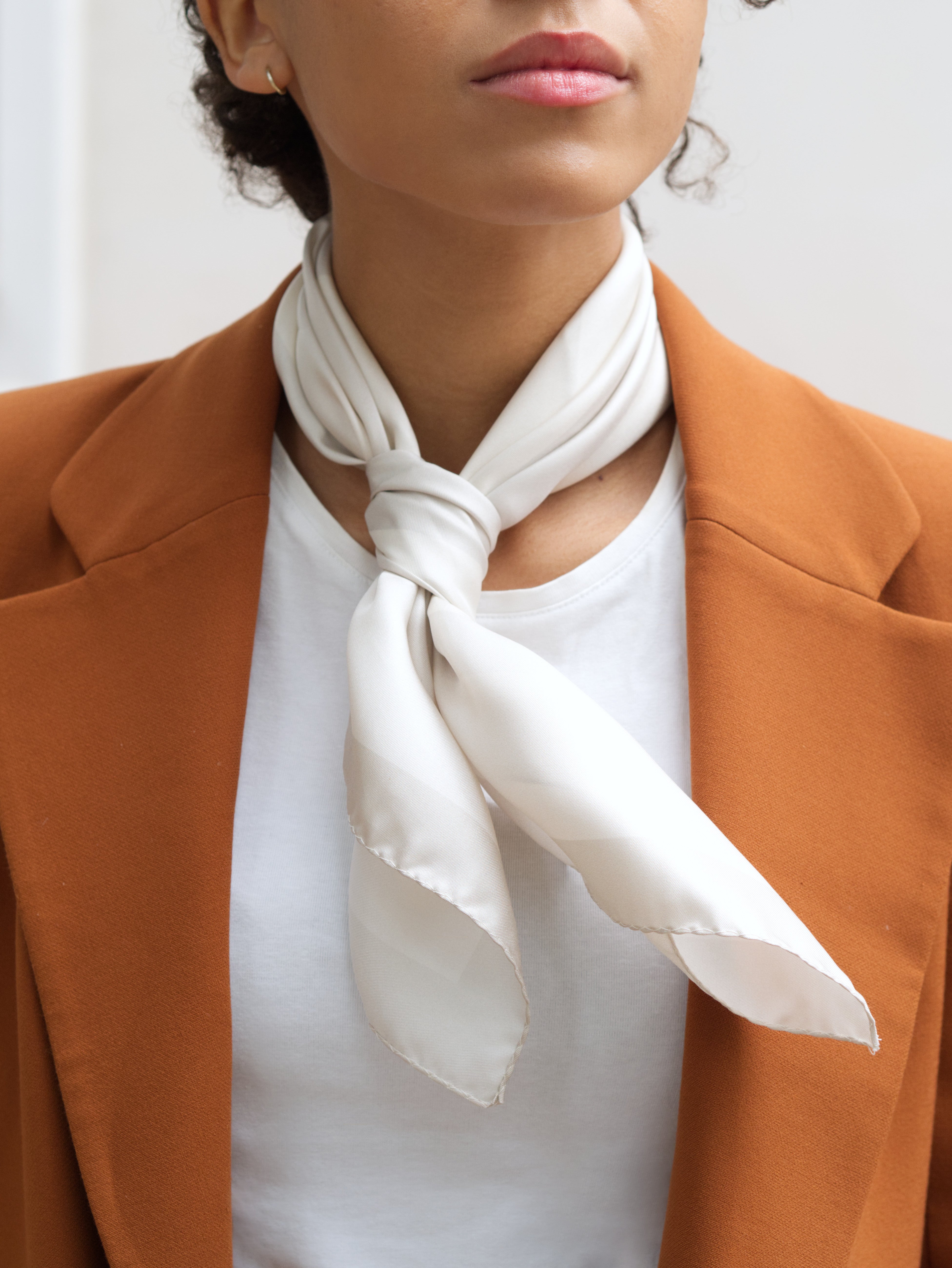 Klassinen valkoinen silkkihuivi on yksi monikäyttöisimmistä asusteista, joka toimii vuodenajasta toiseen. Luonnonmateriaalina silkki on vertaansa vailla sen kestävyyden ja hengittävyyden ansiosta. Silkkihuivi on ylellinen mutta samaan aikaan käytännöllinen asuste.