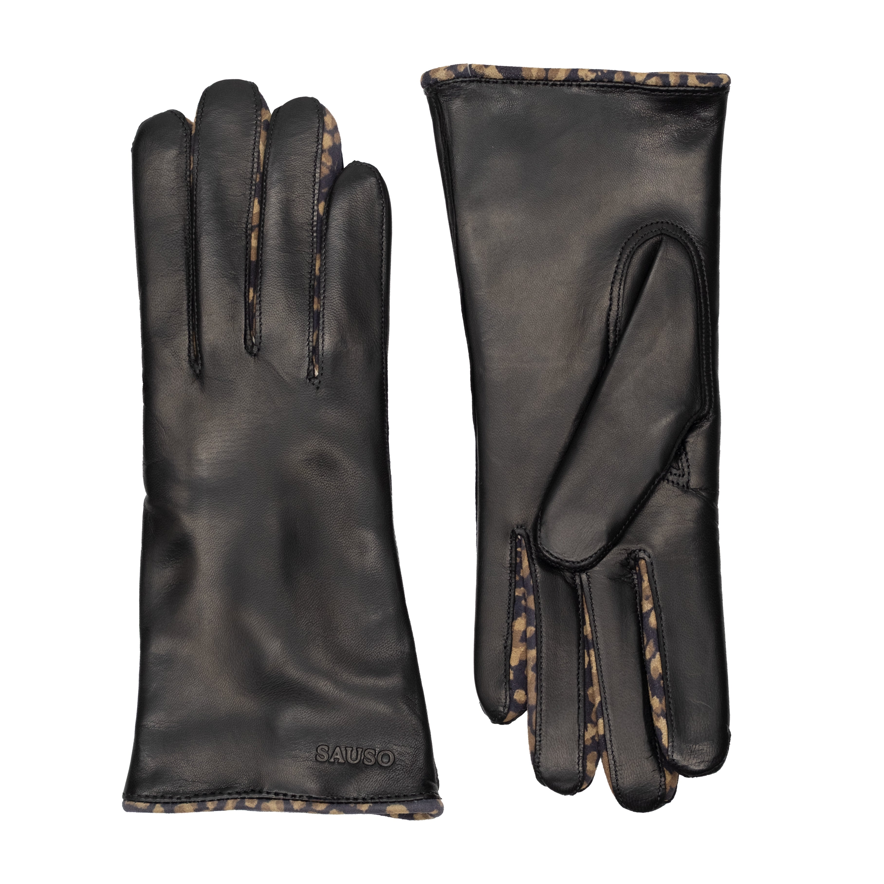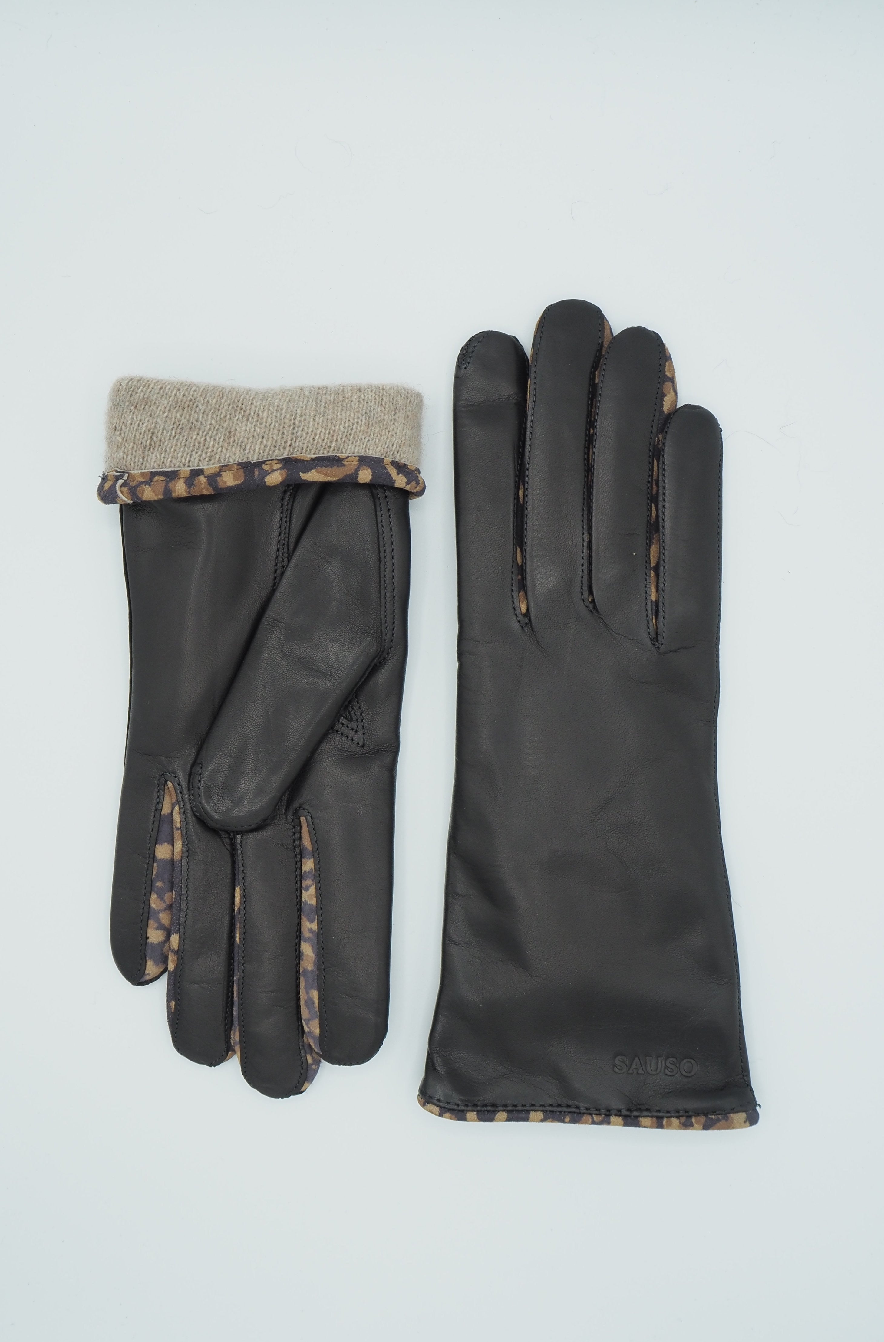 Mustat, lammasnappaiset peruskäsineet, joissa leopardi nahalla tehty sormenväleihin ja suuosaan ripaus meininkiä ja rohkeutta . Sopivan pitkä varsi, step sauma ja kasmiiri-villavuori.