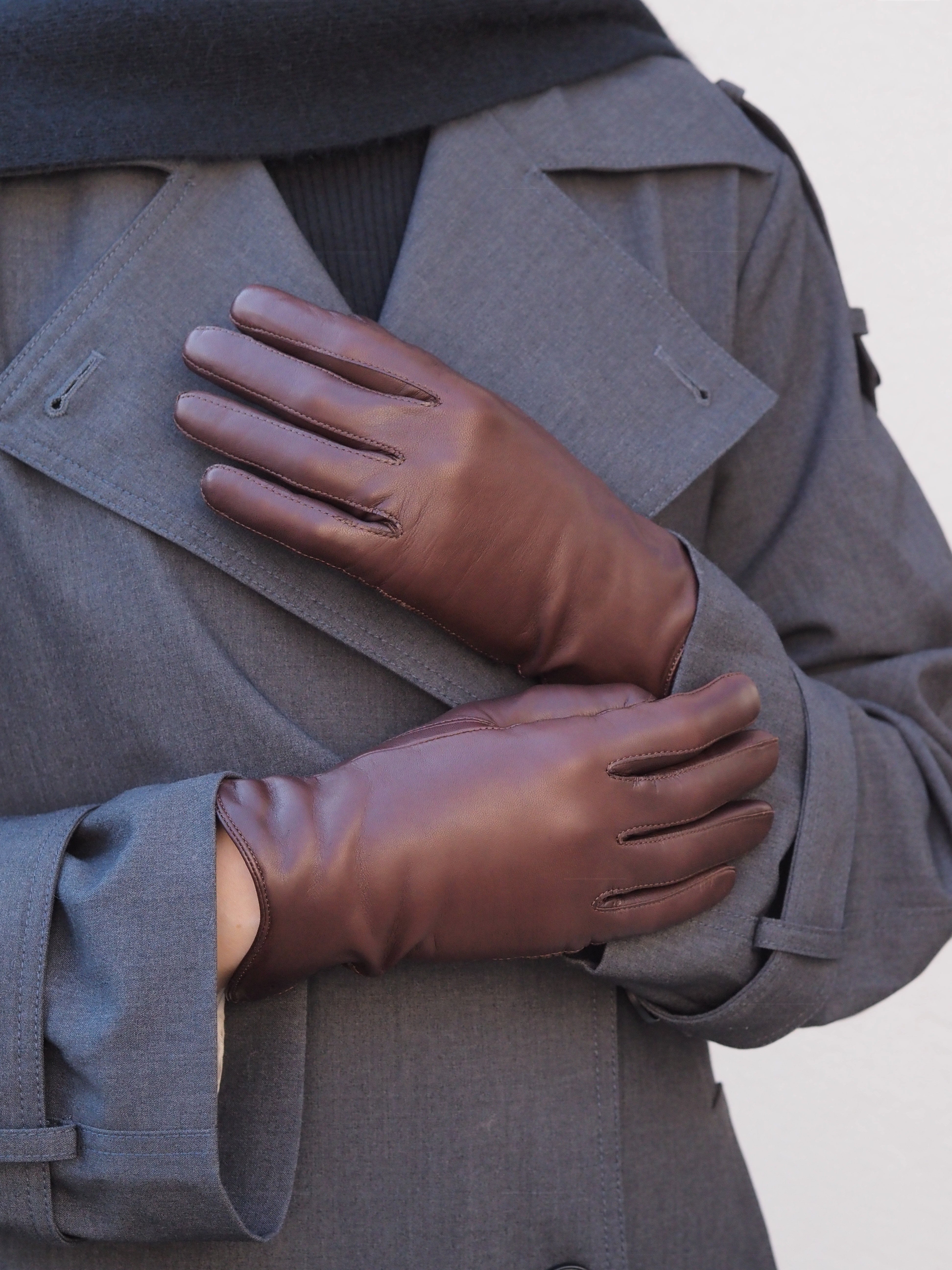 Kastanjan ruskeat käsineet, joissa pukemista helpottava, kaareva suuosa, step sauma ja kasmiiri-villasekoite vuori. 2,5 tuuman mittainen varsi suojaa ranteen. Kaareva suuosa antaa tilaa kellolle tai rannekorulle.