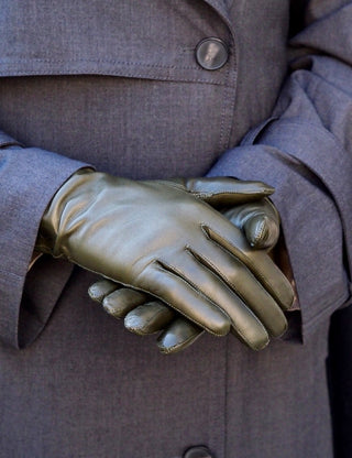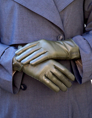 Tumman oliivin vihreät käsineet, joissa pukemista helpottava, kaareva suuosa, step sauma ja kasmiiri-villasekoite vuori. 2,5 tuuman mittainen varsi suojaa ranteen. Kaareva suuosa antaa tilaa kellolle tai rannekorulle.