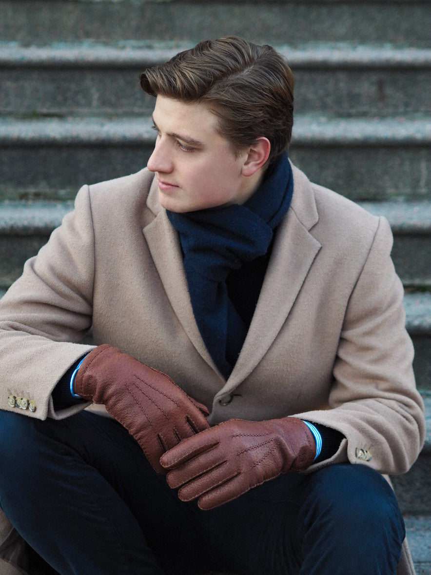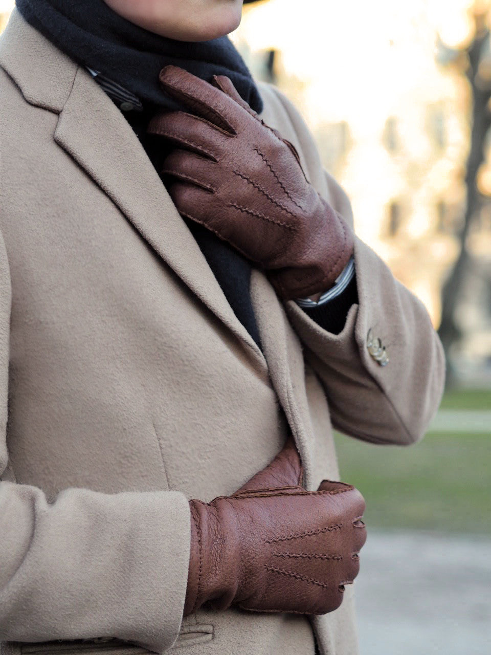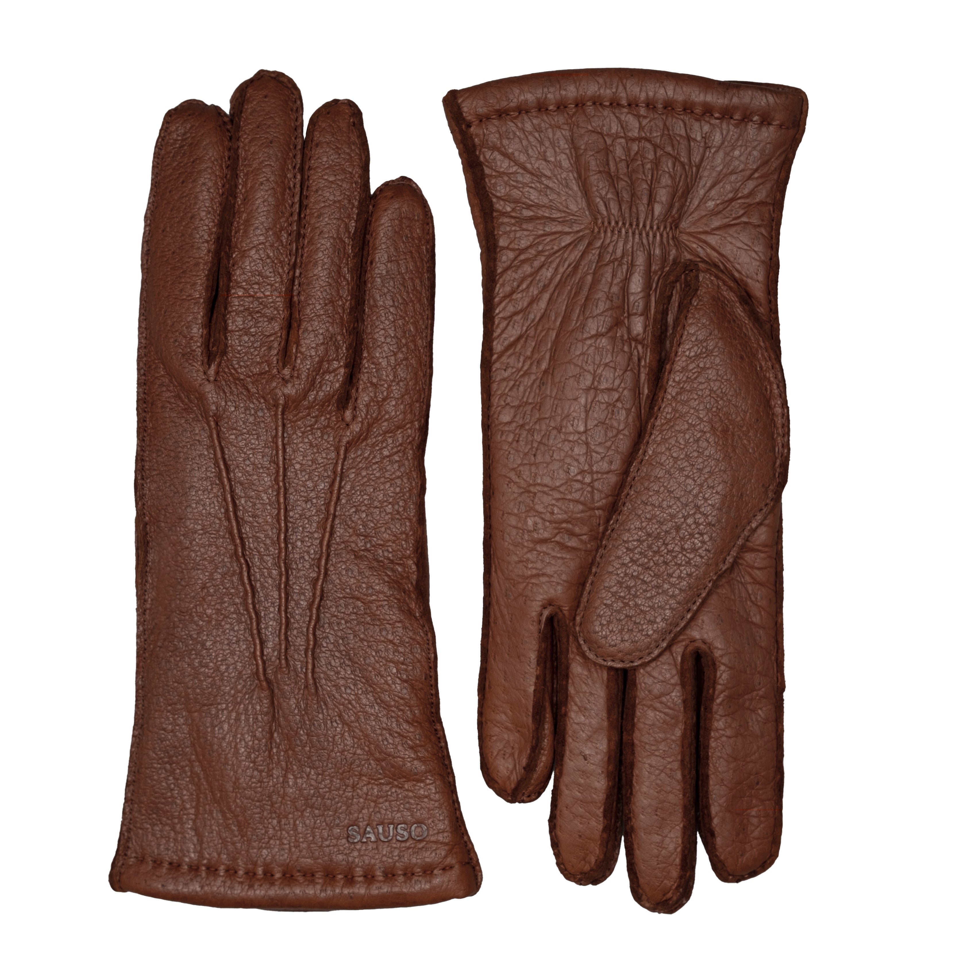Peccarykäsineet. Miesten ruskeat peccaryhanskat pitävät kädet lämpiminä kylmälläkin talvisäällä. Käsityönä valmistettu klassikkokäsine on käsineiden ja nahkojen aatelia.
