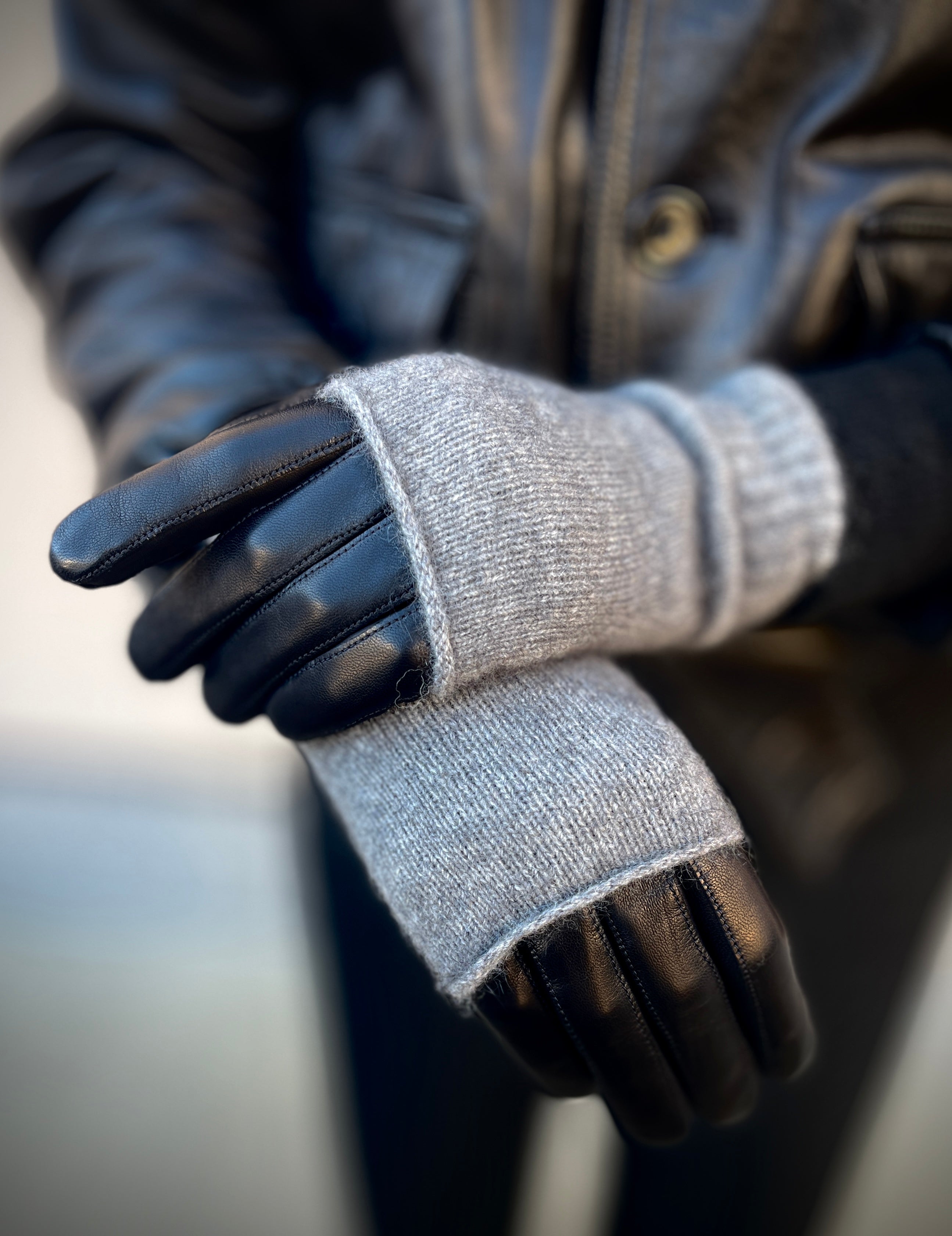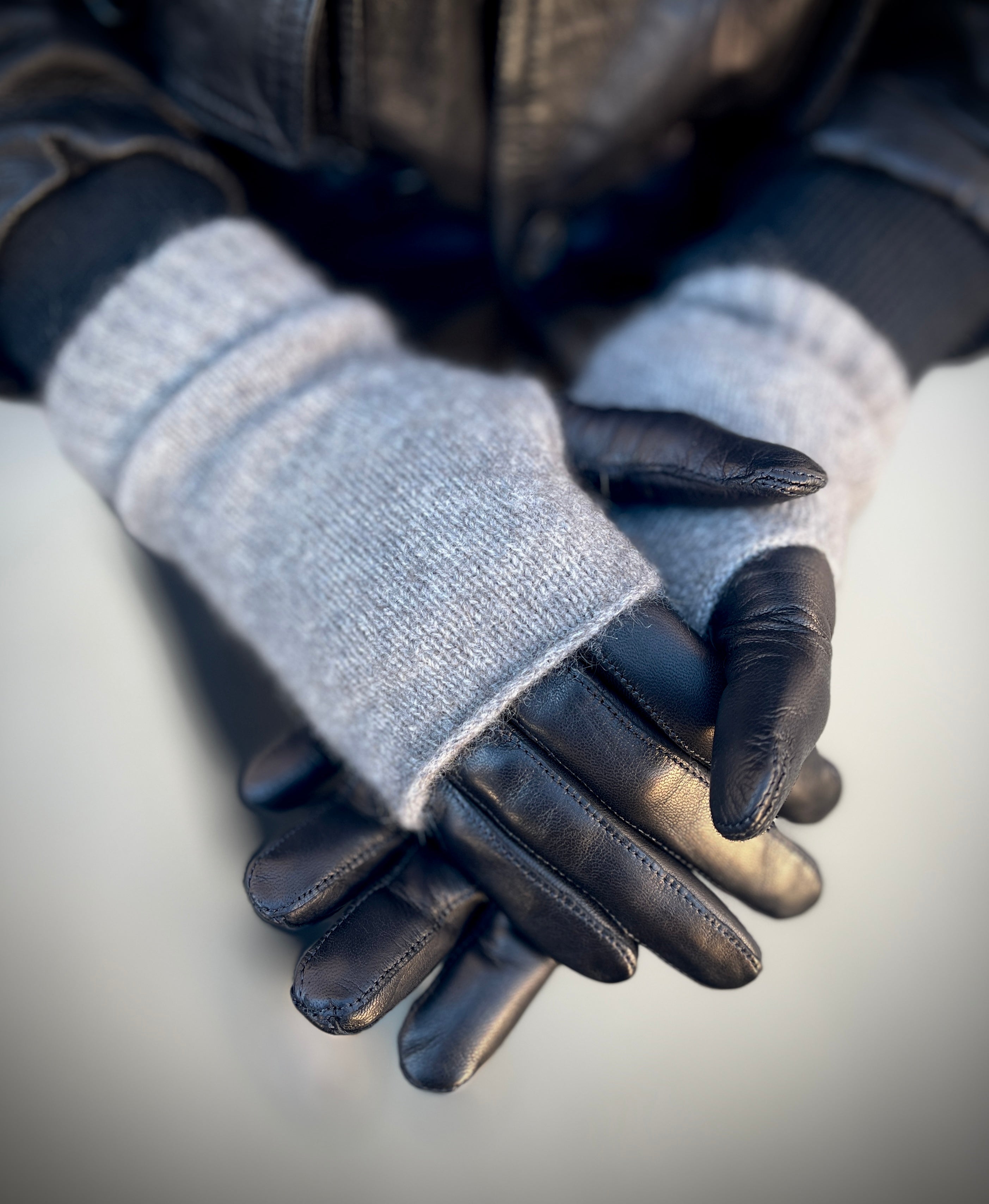 Kestävästä ja lämpimästä merino-kettukusunkarvaneuleesta neulotut harmaat kynsikkäät/kädenlämmittimet.