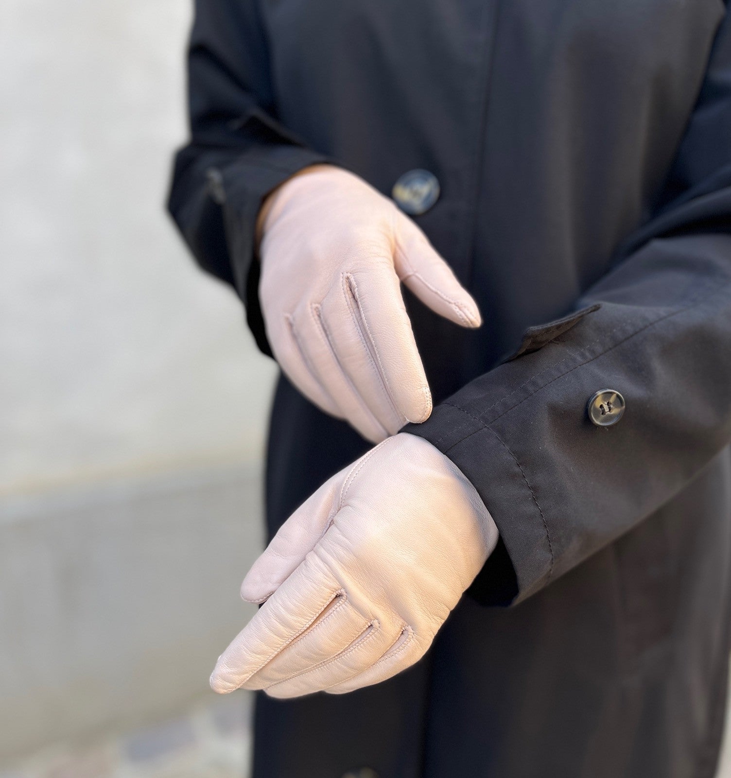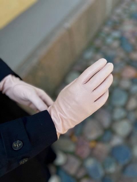 Käsin tehdyt, naisellisen elegantit, suloisen vaalean roosat lammasnappa käsineet luonnonsilkkivuorilla. Nahka on pestävää nahkaa, joten mahdolliset tahrat saa poistettua kätevästi.
