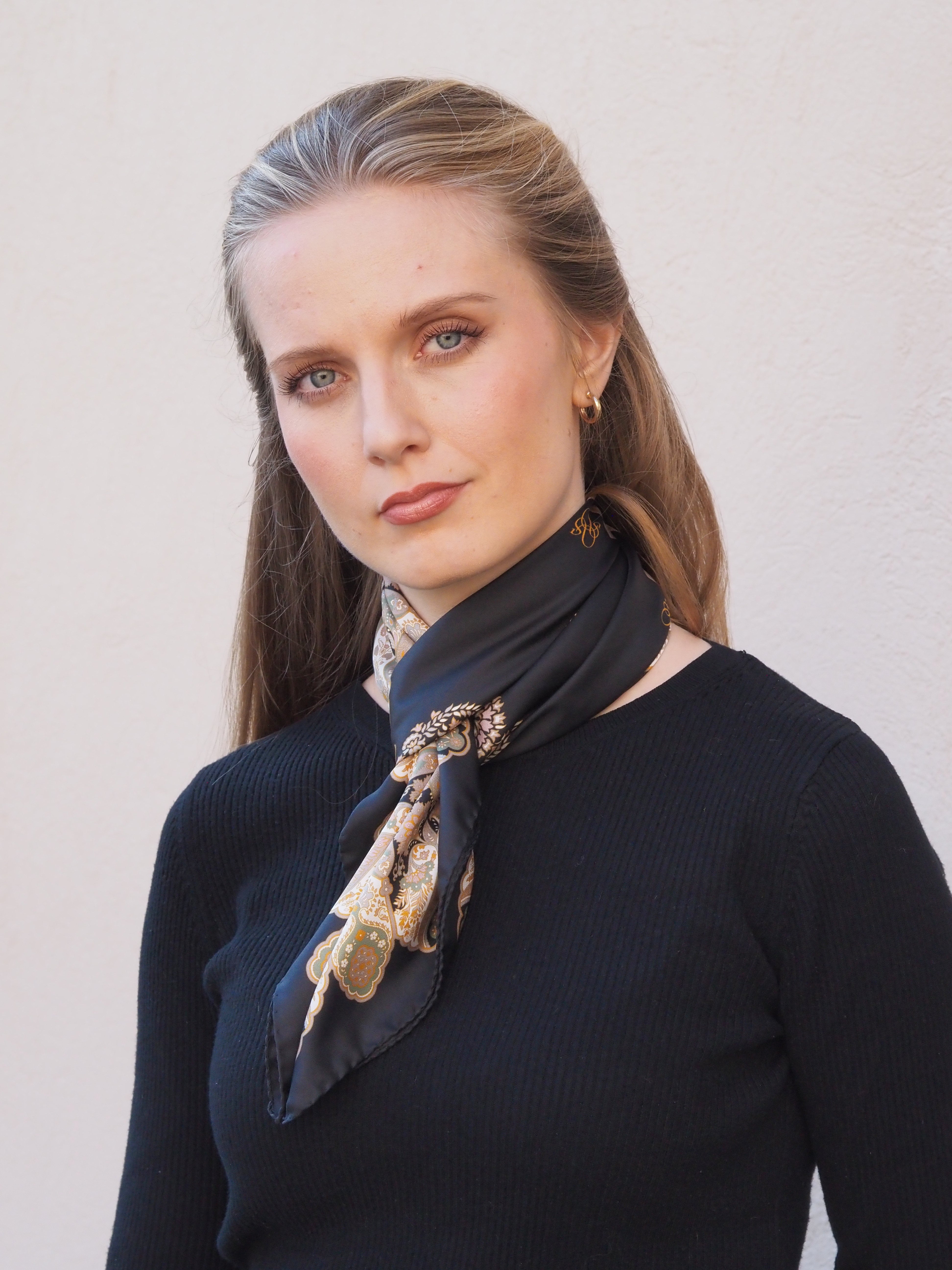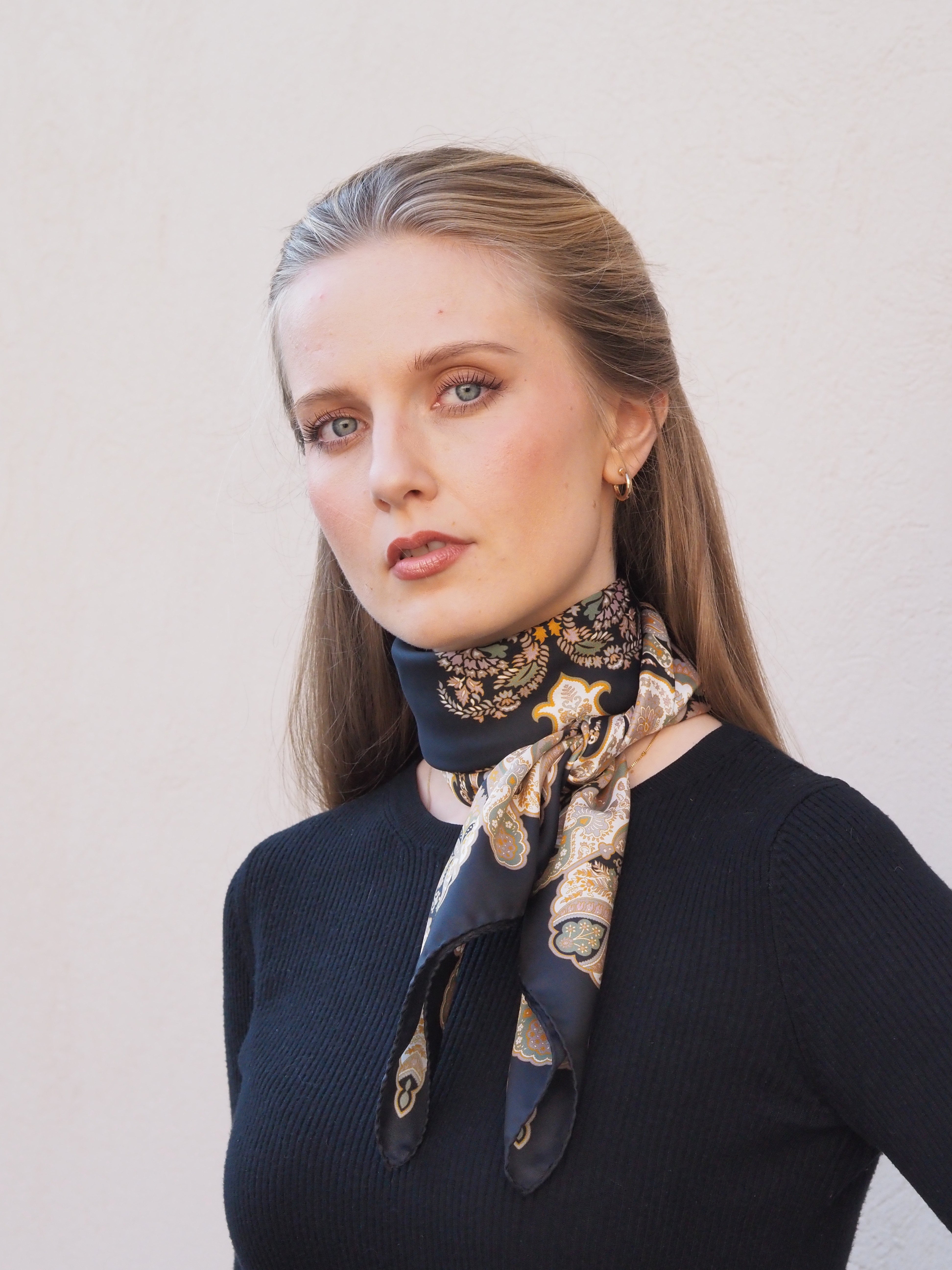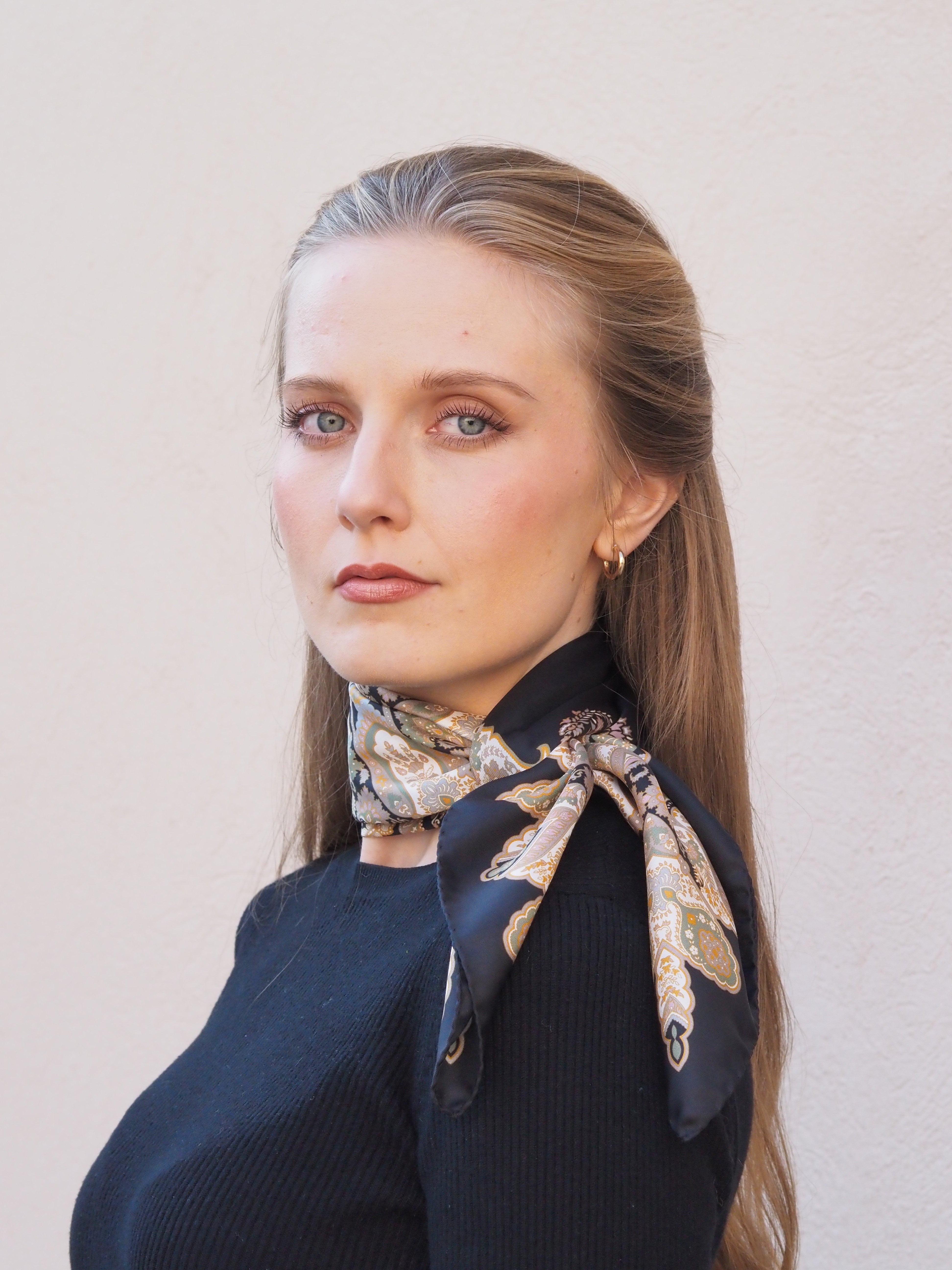 Tyylikäs, ajaton ja näyttävä musta pohjainen 100% silkkihuivi, jonka kuosissa on klassisia ja ajattomia sävyjä. Löydät kuosin sisältä kultaa, luunvalkoista, oliivia, beigeä, nutriaa, helmen harmaata ja ripaus roosaa. 90x90cm koko antaa huiville paljon käyttömahdollisuuksia. Voit taitella sen topiksi, päähän, kaulalle eri tavoin, lanteille tai vyöksi. 12 momin paksuinen, italialainen silkkikangas toistaa värejä upeasti, poimuttuu kauniisti ja hengittää ihanasti. Silkki tuntuu raikkaalle ja pehmeälle ihoa vasten.