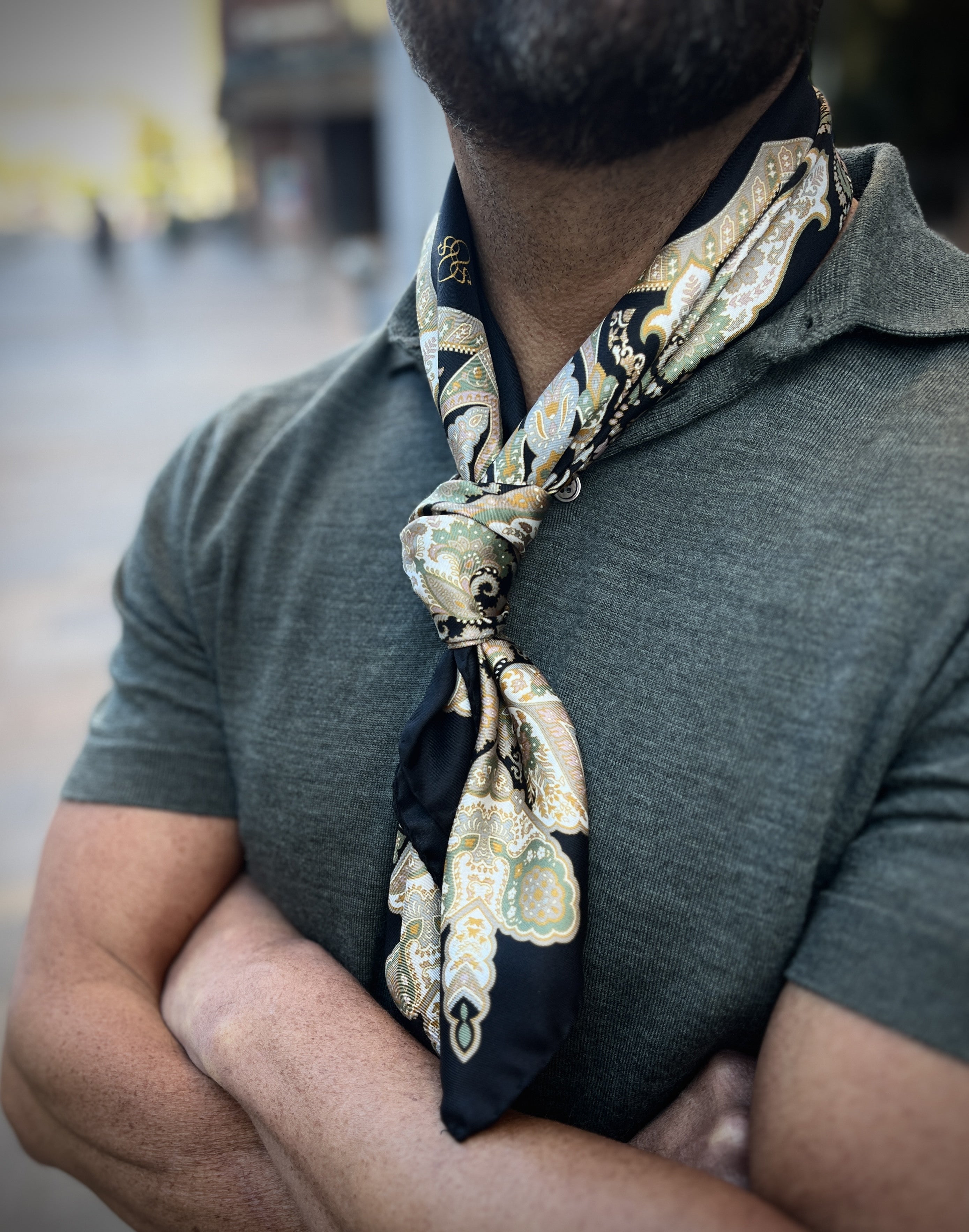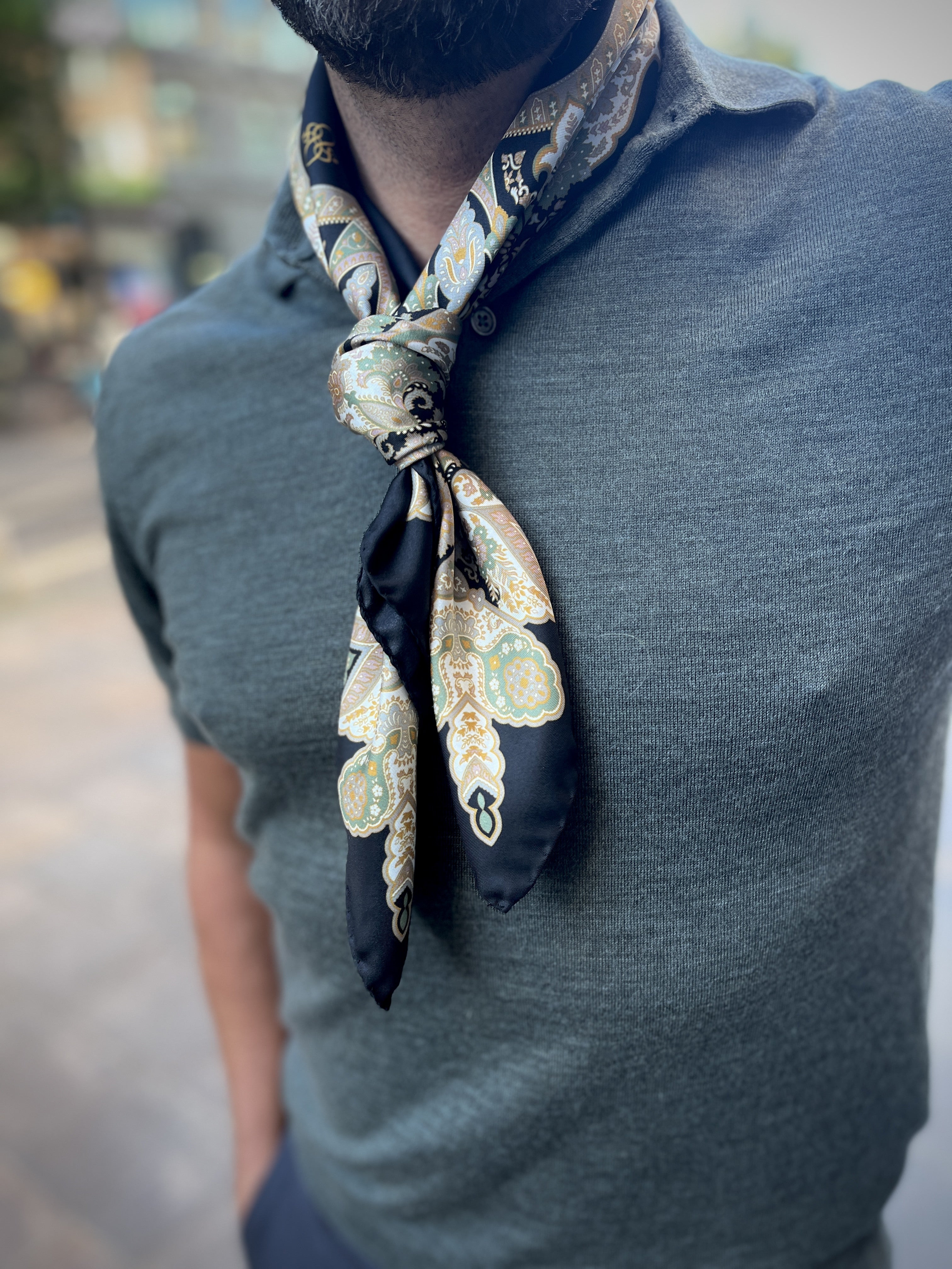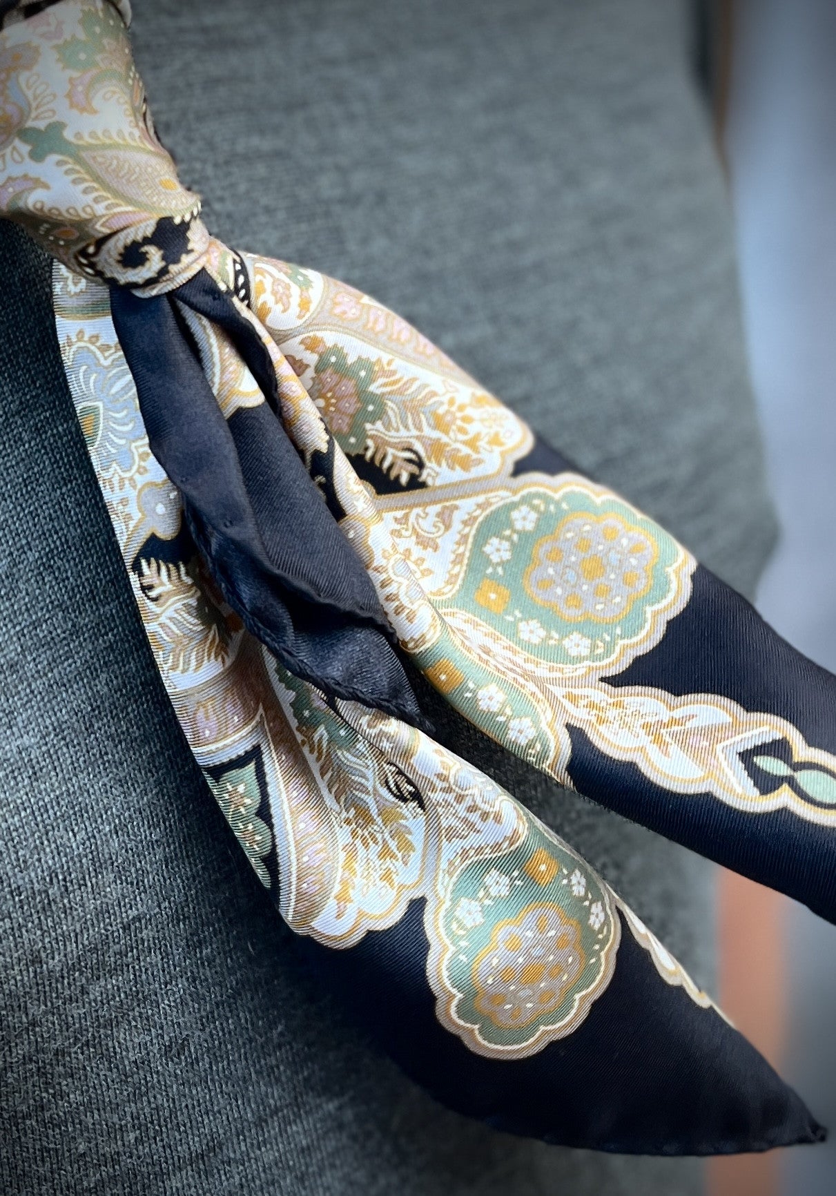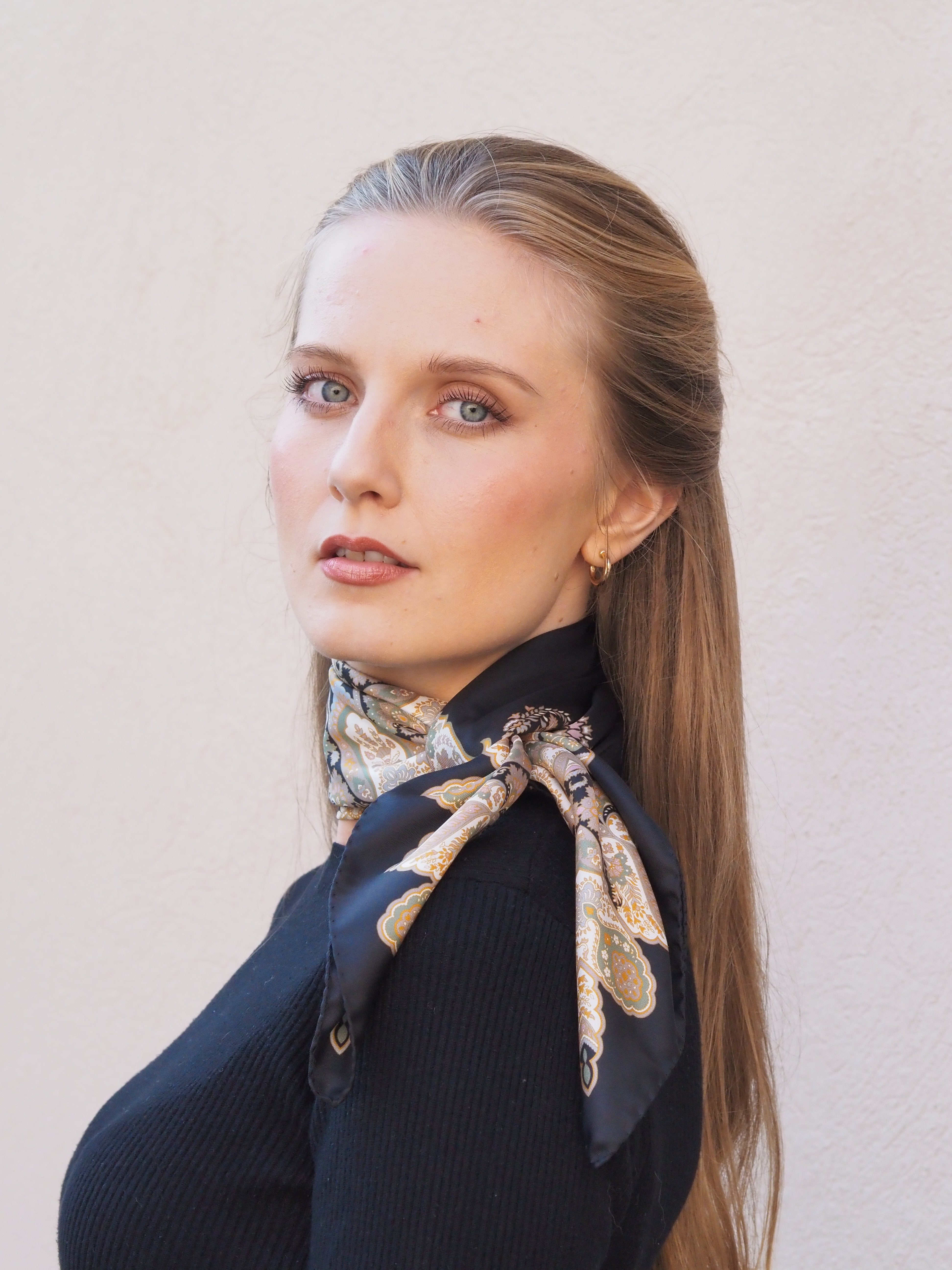 Tyylikäs, ajaton ja näyttävä musta pohjainen 100% silkkihuivi, jonka kuosissa on klassisia ja ajattomia sävyjä. Löydät kuosin sisältä kultaa, luunvalkoista, oliivia, beigeä, nutriaa, helmen harmaata ja ripaus roosaa. 90x90cm koko antaa huiville paljon käyttömahdollisuuksia. Voit taitella sen topiksi, päähän, kaulalle eri tavoin, lanteille tai vyöksi. 12 momin paksuinen, italialainen silkkikangas toistaa värejä upeasti, poimuttuu kauniisti ja hengittää ihanasti. Silkki tuntuu raikkaalle ja pehmeälle ihoa vasten.