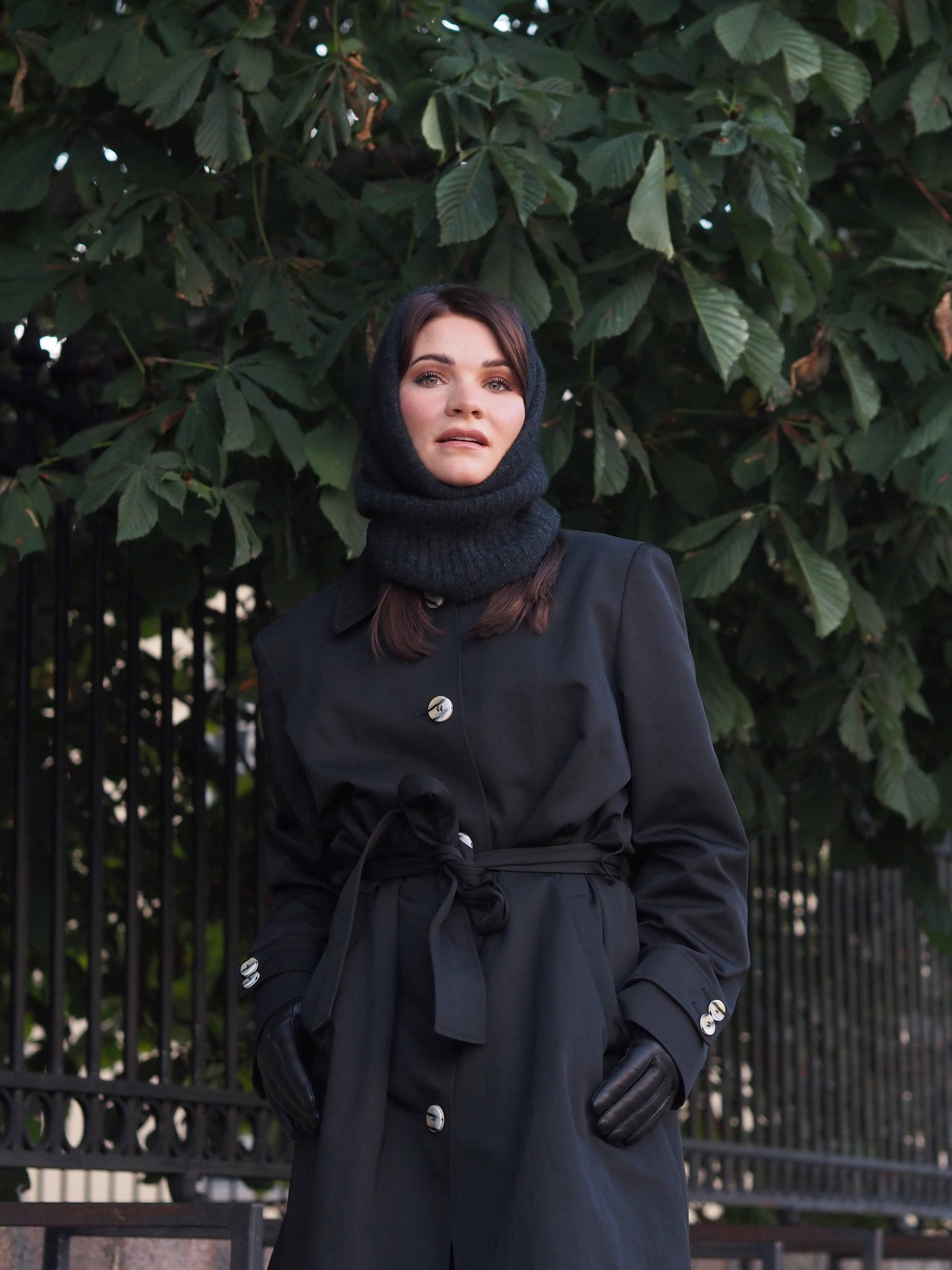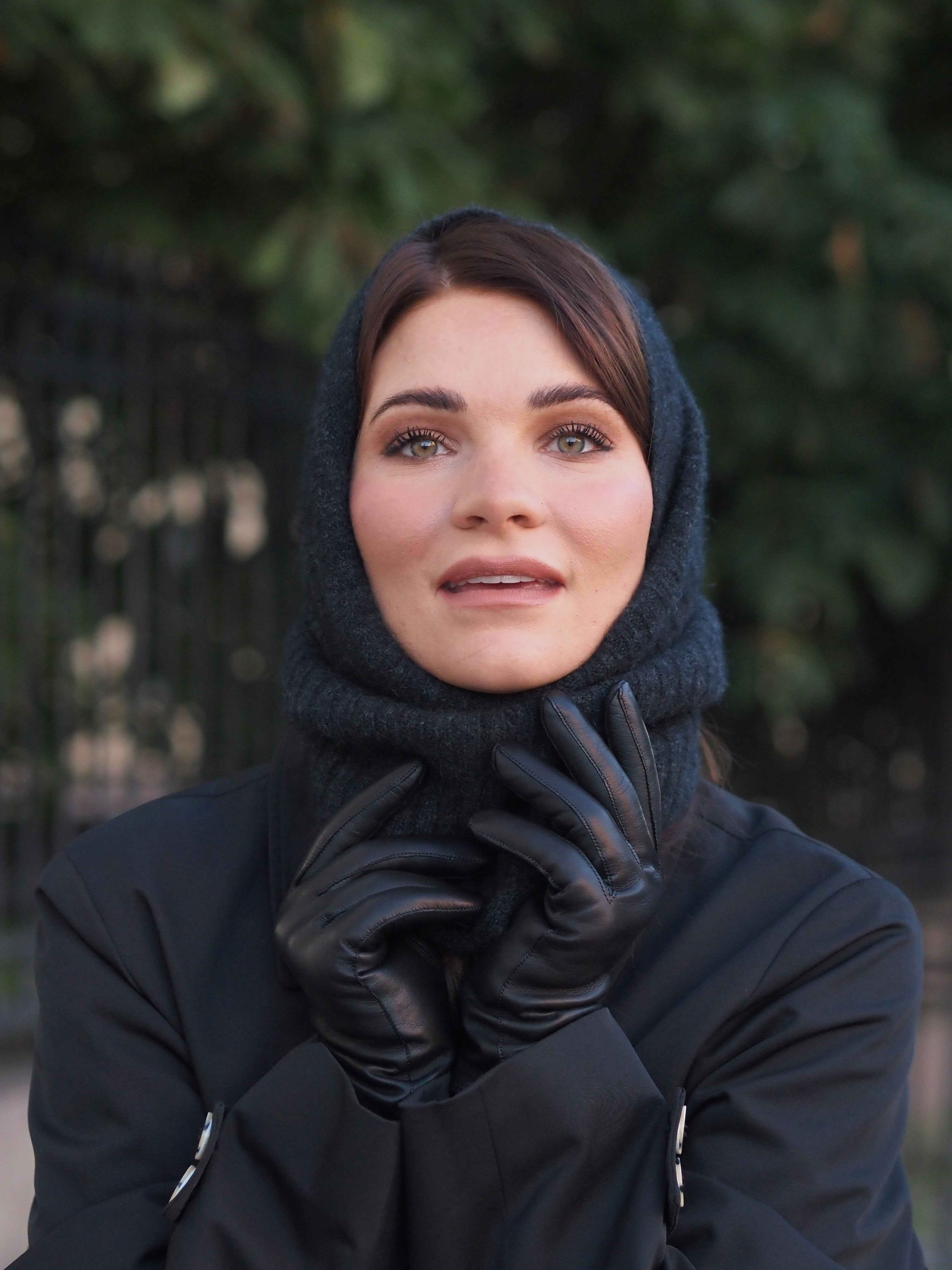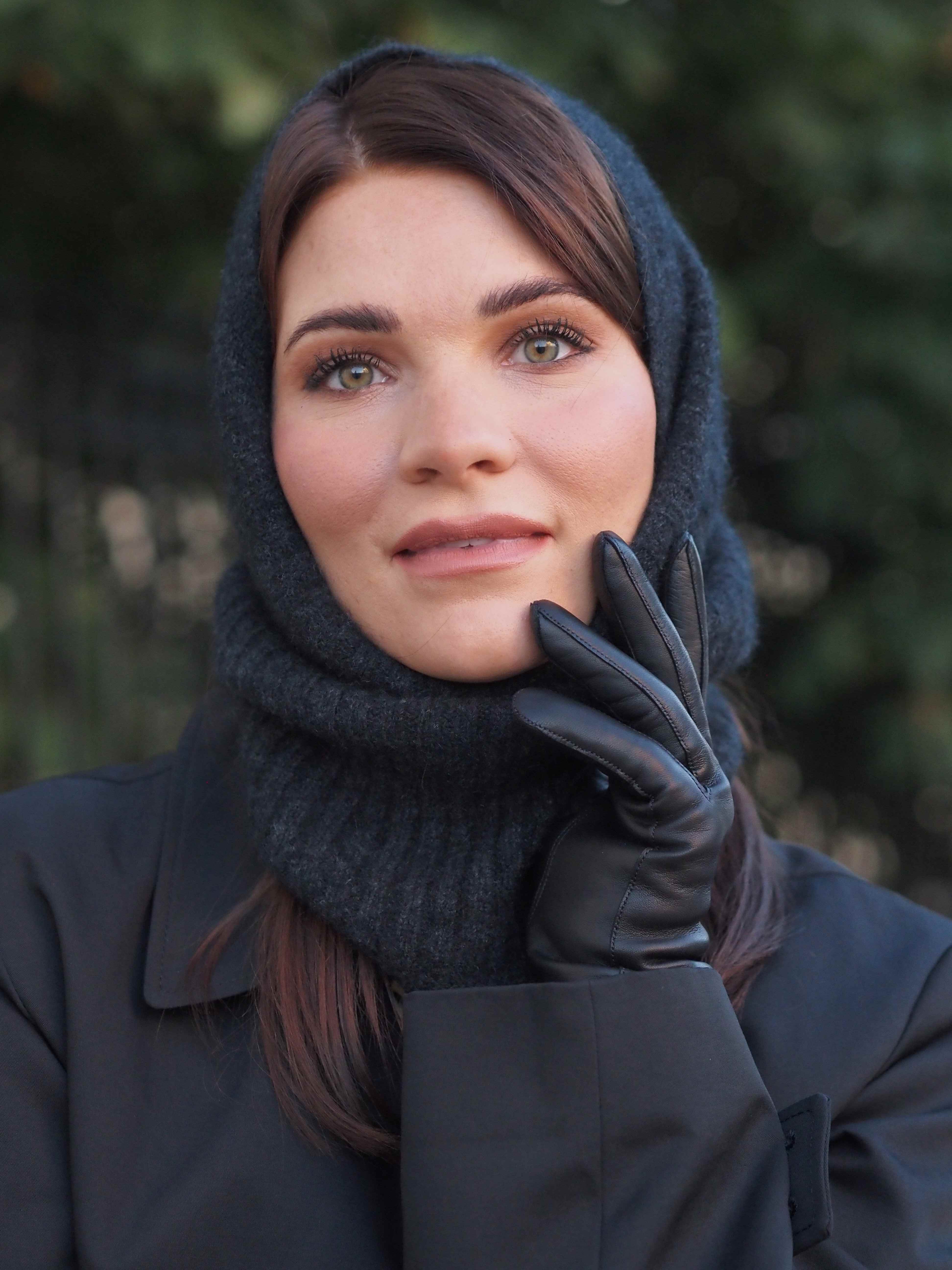 Kestävästä ja lämpimästä merino-kettukusunkarvaneuleesta neulottu hiilenharmaa tuubihuivi.