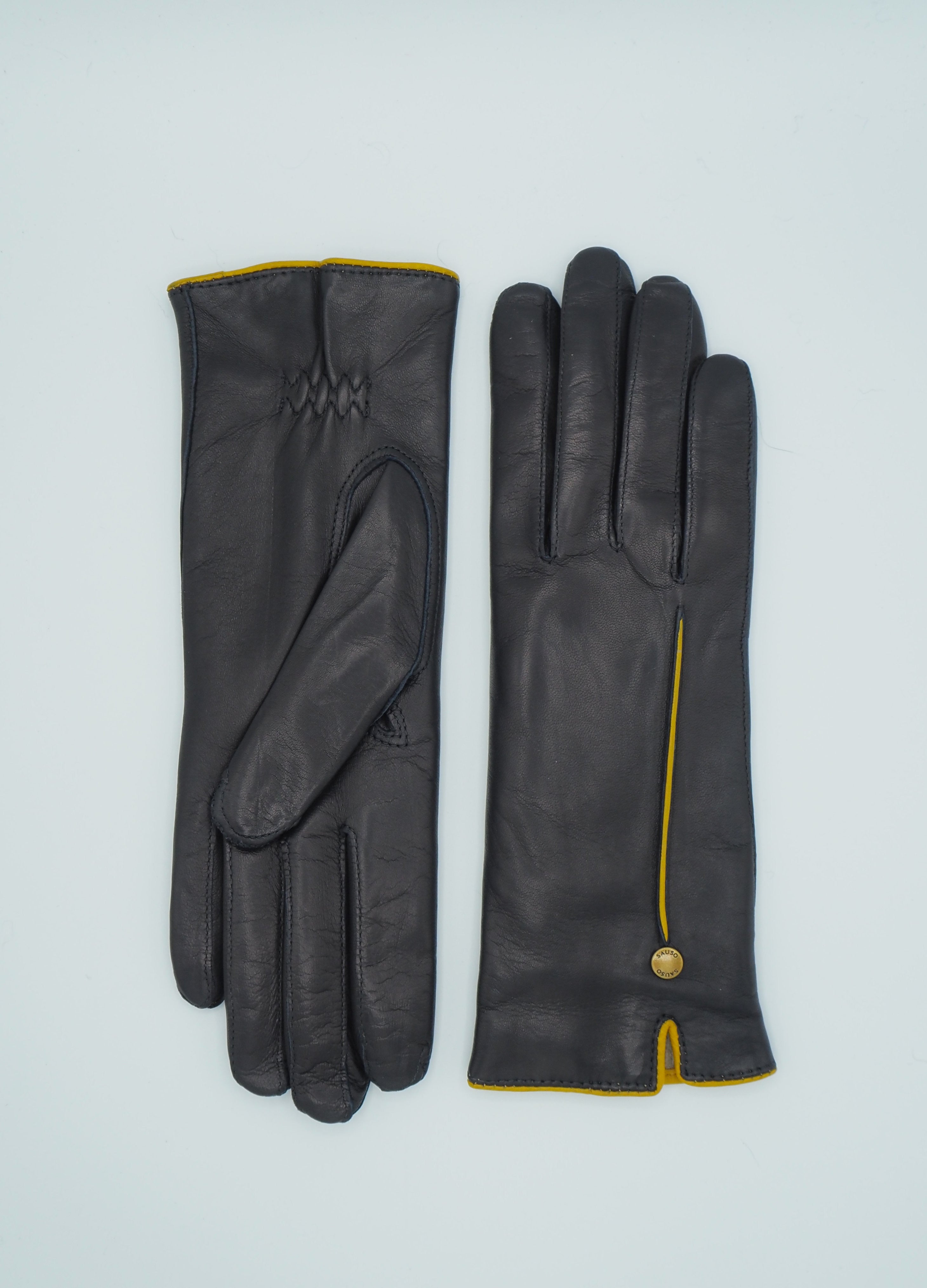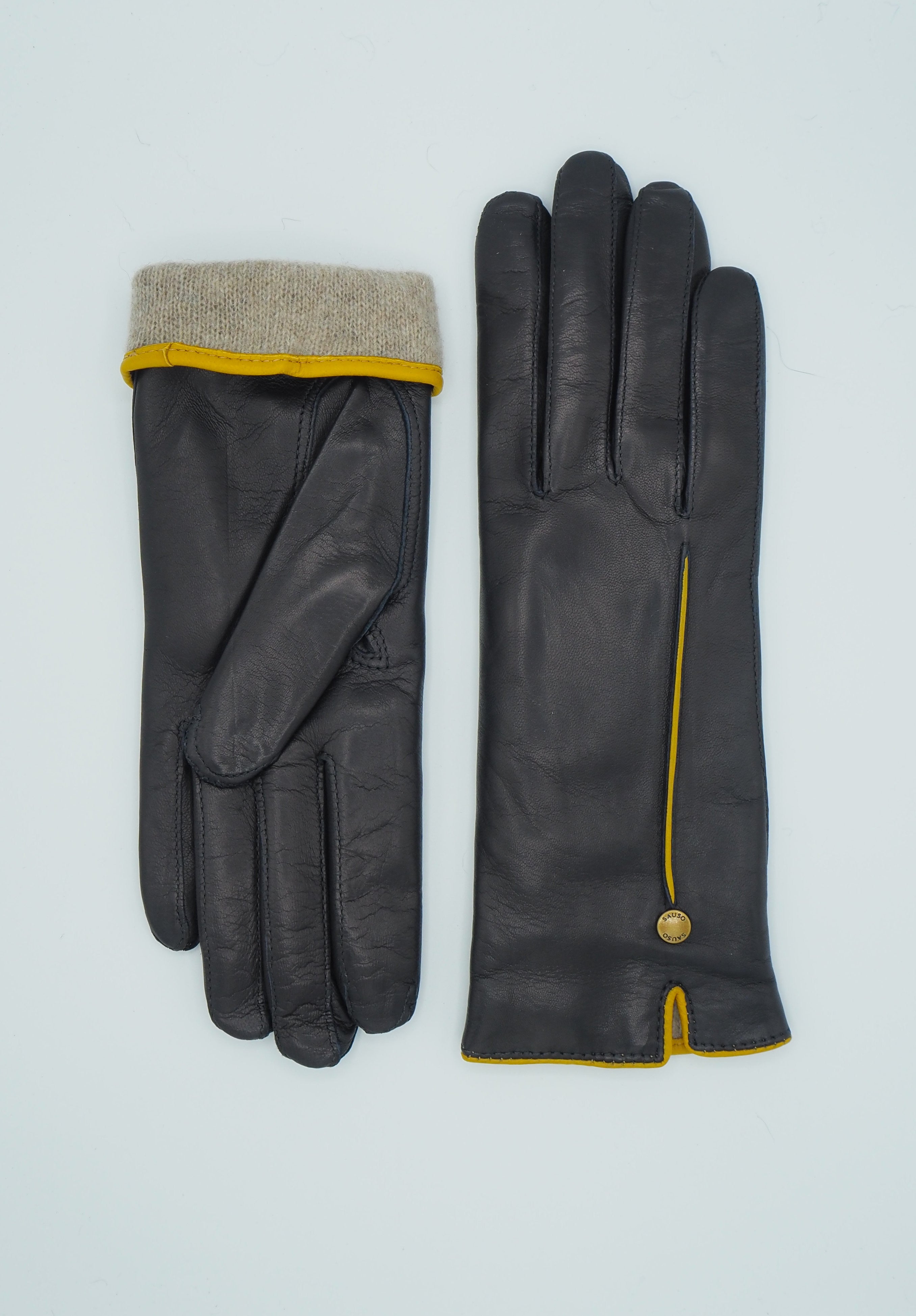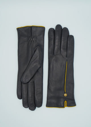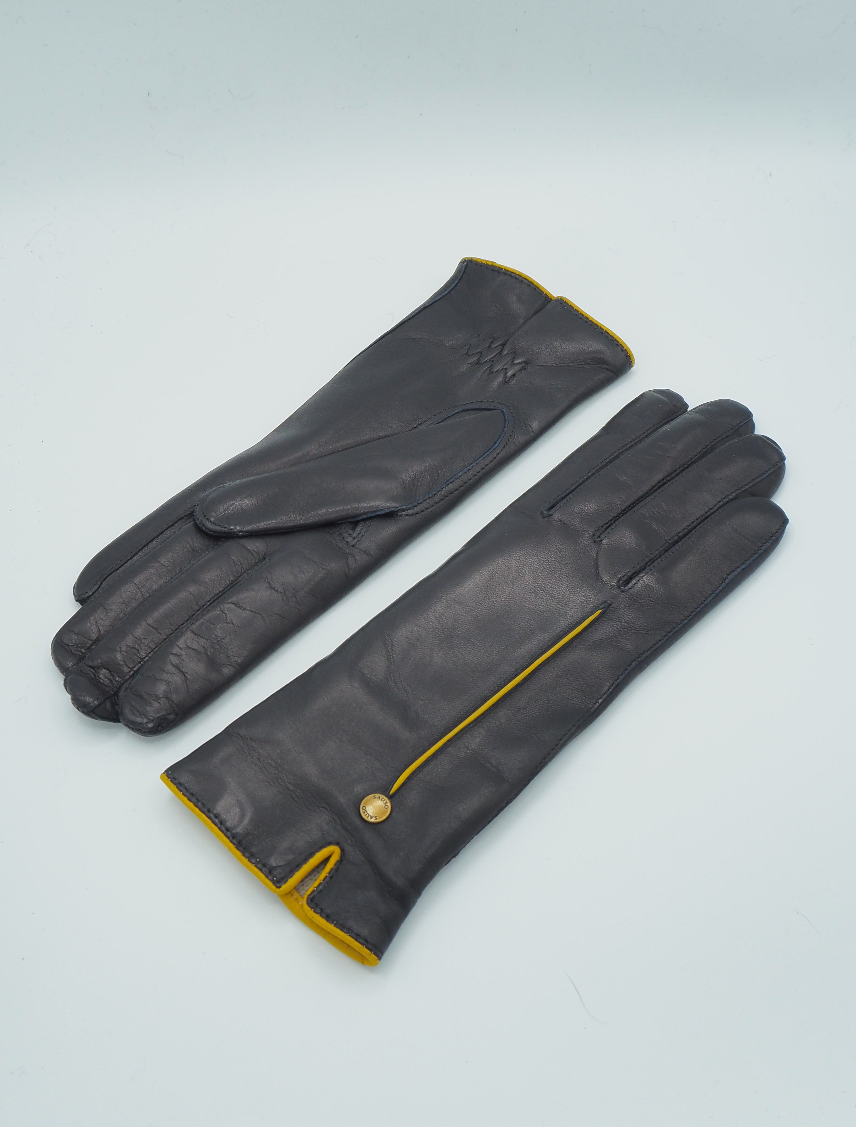 Tummansiniset, step saumalliset lammasnappa käsineet, joissa keltaisesta napasta ommeltu koristetenttaus ja suuosa. Siro ja kaunis rannekuminauha. Vuori kasmiirin ja villa seosta. Varsi peittää ranteen ja pukemista helpottaa pieni halkio.