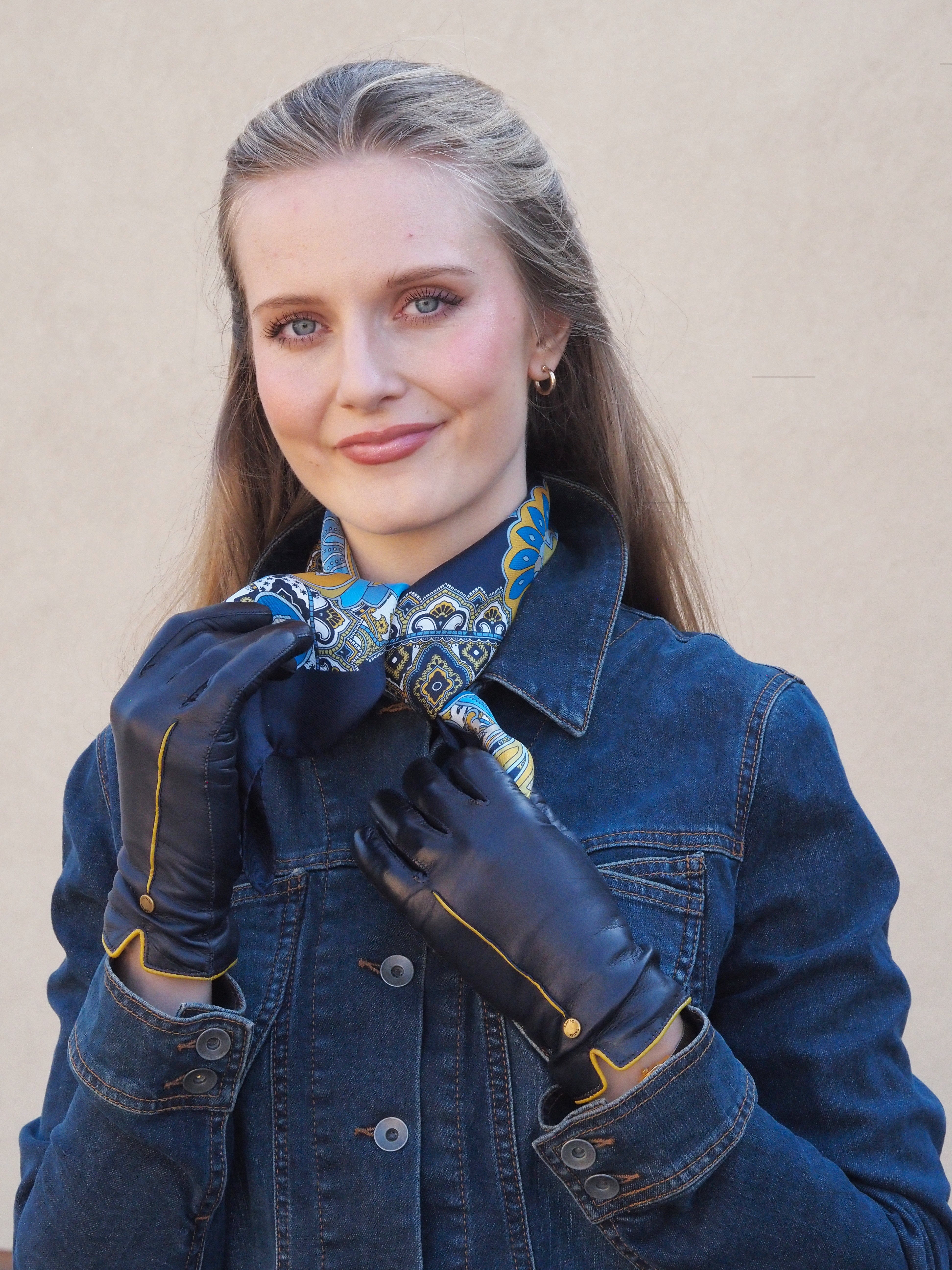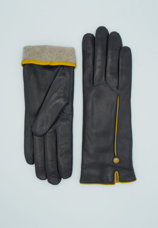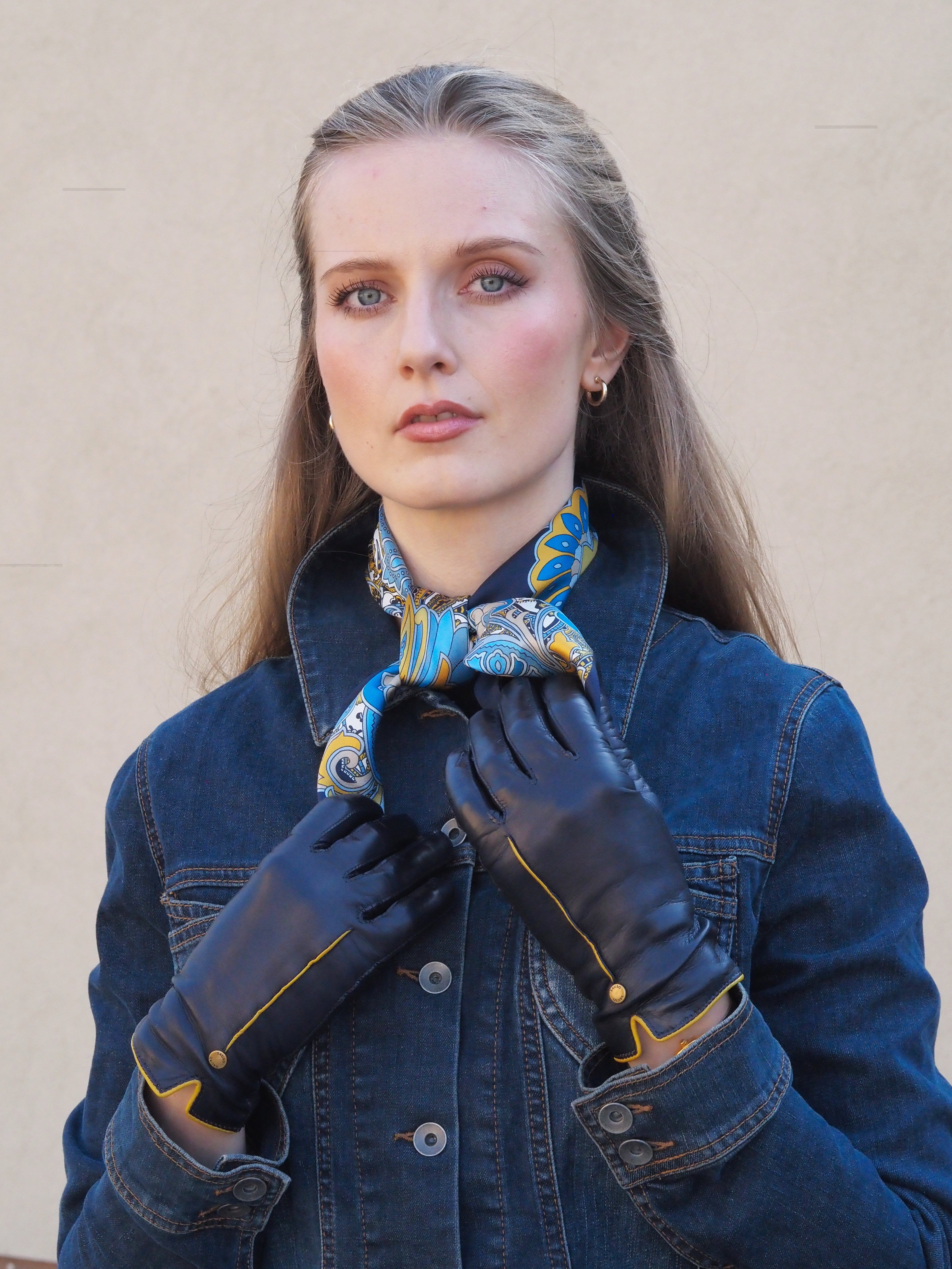 Tummansiniset, step saumalliset lammasnappa käsineet, joissa keltaisesta napasta ommeltu koristetenttaus ja suuosa. Siro ja kaunis rannekuminauha. Vuori kasmiirin ja villa seosta. Varsi peittää ranteen ja pukemista helpottaa pieni halkio.