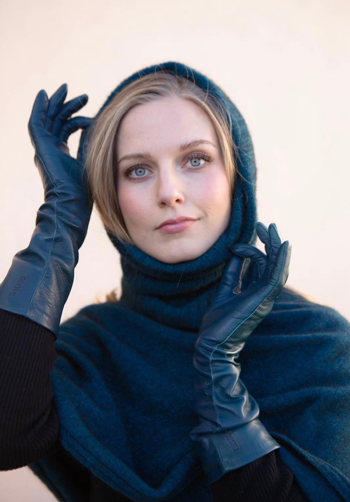 Merino-kettukusun karva neuleesta valmistettu meleerattu, petroolin värinen, sileäneuloksinen huiviponcho. Helppoa ja monikäyttöistä huiviponchoa voi käyttää huivina, huppuna ja eri tavoin ponchona.